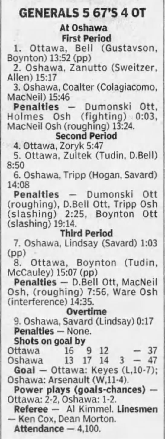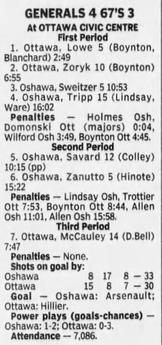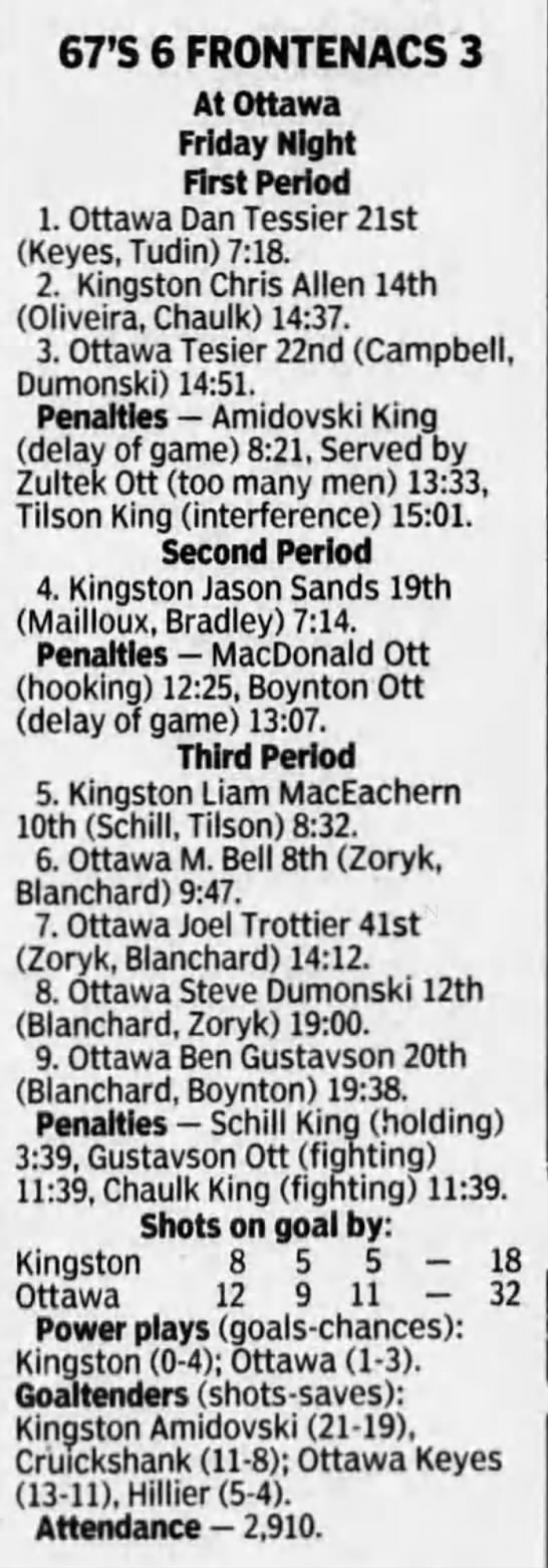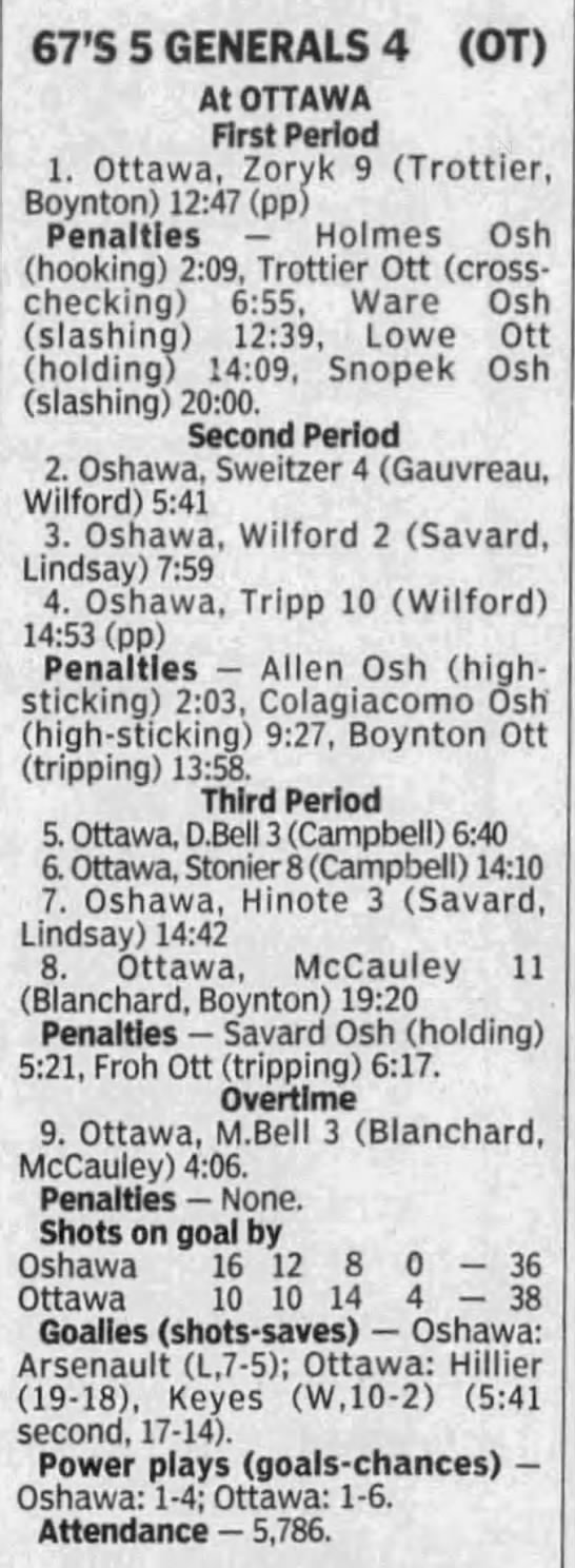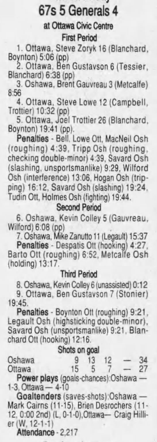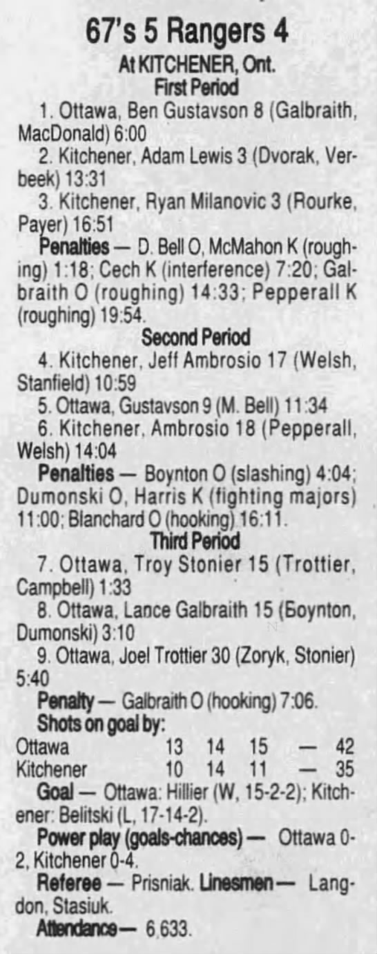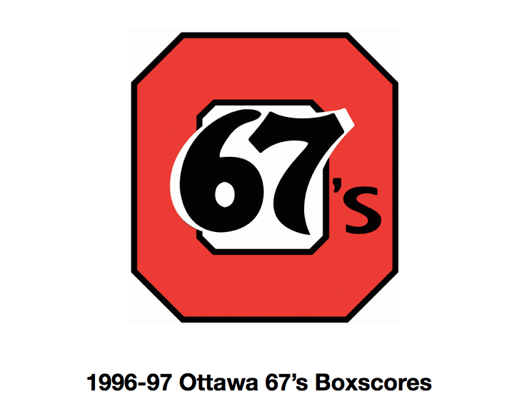 Here are the boxscores from the 1996-97 Ottawa 67’s season. There are a bunch that are missing, but any of the scores that were posted in the Ottawa Citizen are here (73/90 boxscores). If you have any of the games that are missing, please send them my way.
