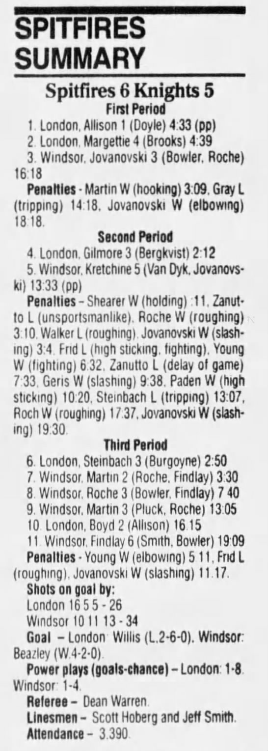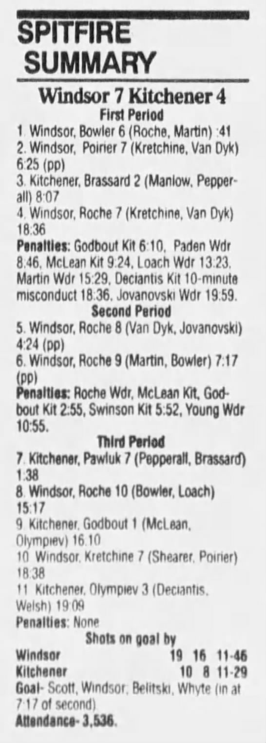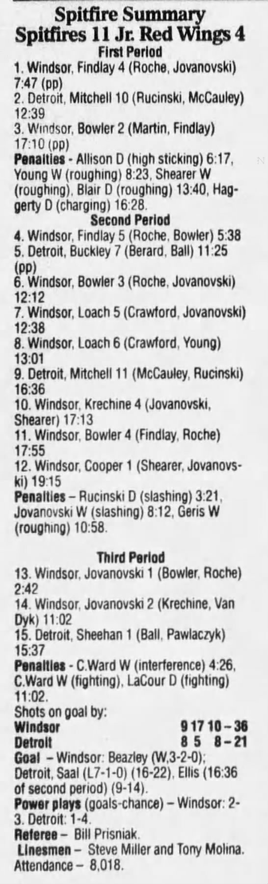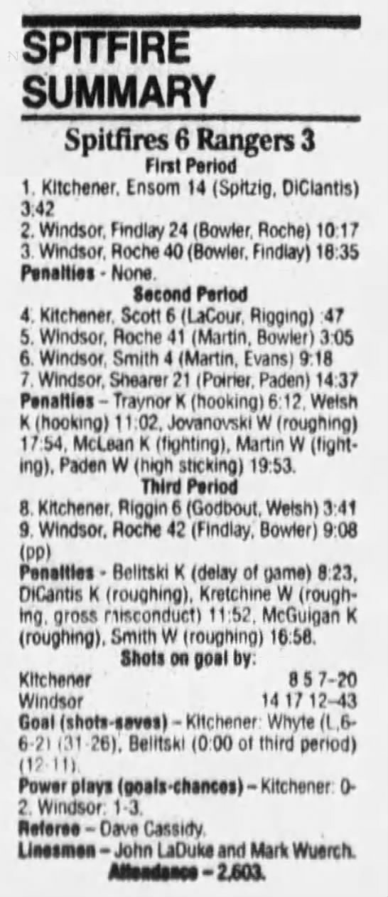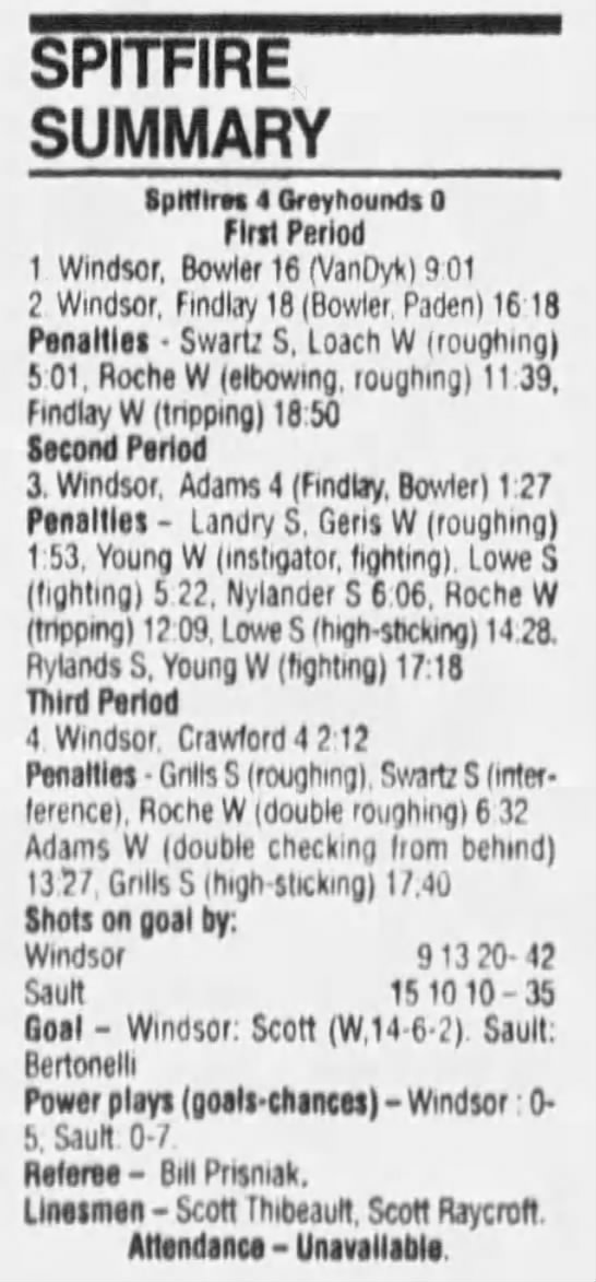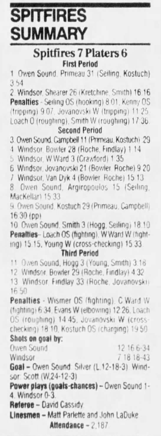 Here are the boxscores from the 1994-95 Windsor Spitfires season. There are a few that are missing, but most of them are here (71/76 boxscores). If you have any of the games that are missing, please send them my way.