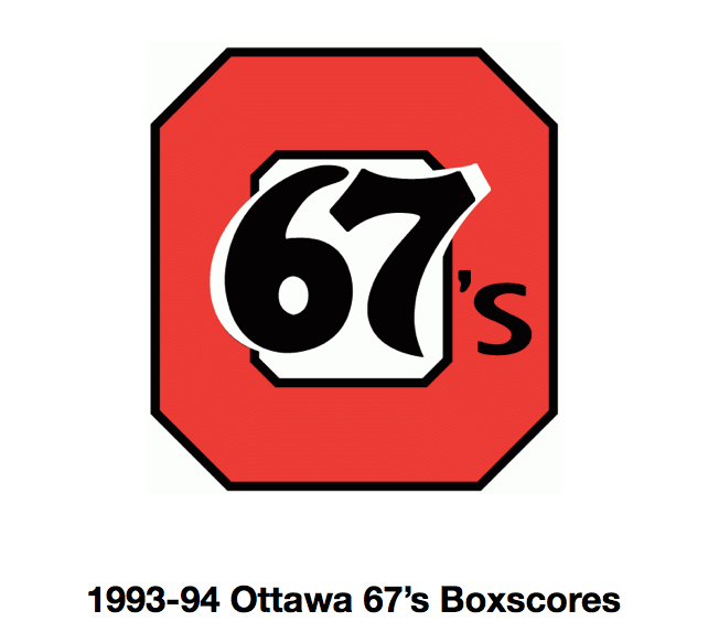 Here are the boxscores from the 1993-94 Ottawa 67’s season. There are a bunch that are missing, but any of the scores that were posted in the Ottawa Citizen are here (61/83 boxscores). If you have any of the games that are missing, please send them my way.