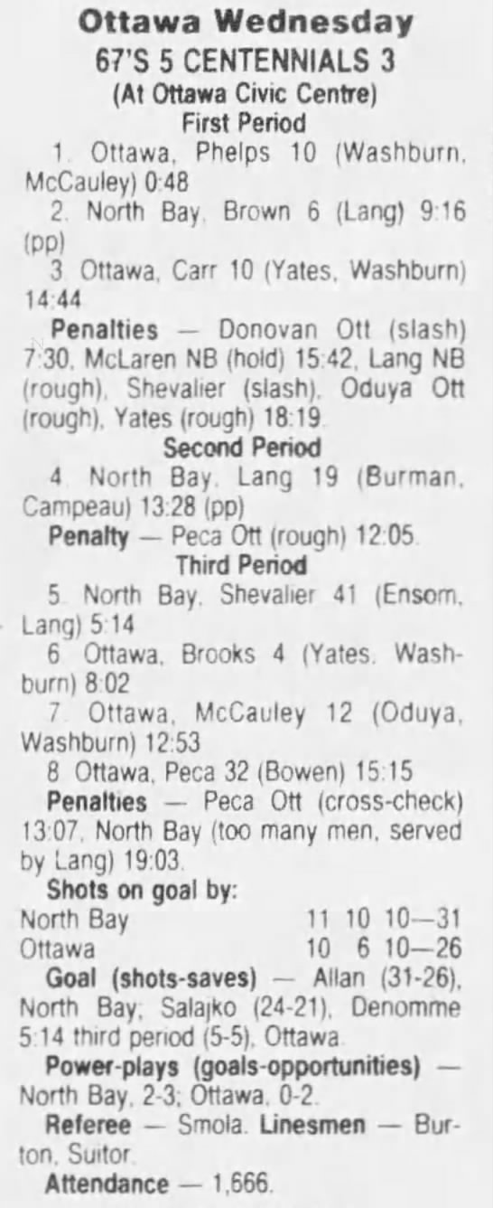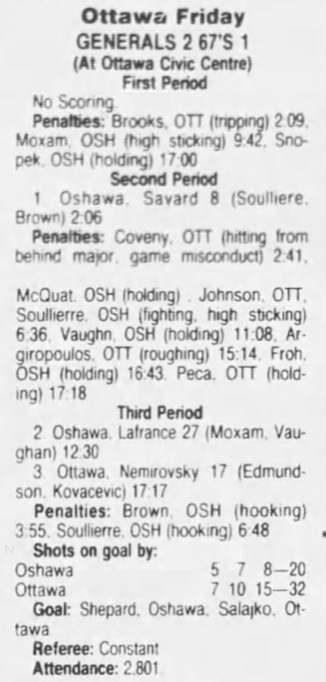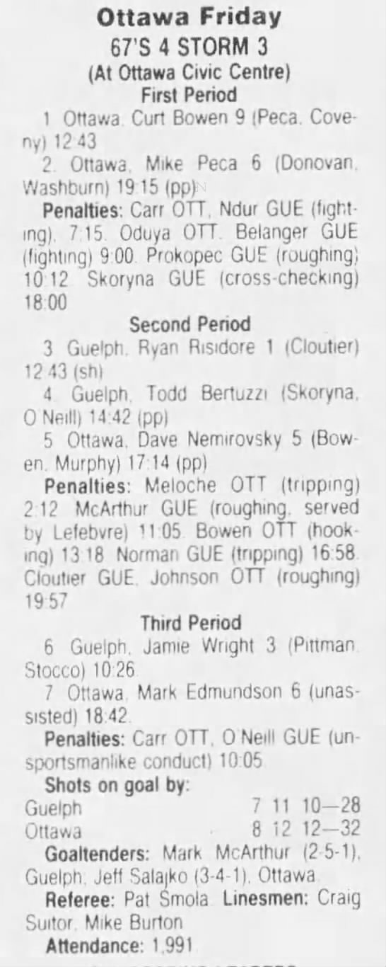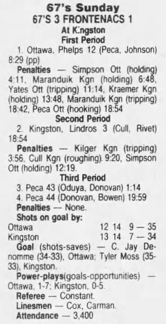 Here are the boxscores from the 1993-94 Ottawa 67’s season. There are a bunch that are missing, but any of the scores that were posted in the Ottawa Citizen are here (61/83 boxscores). If you have any of the games that are missing, please send them my way.