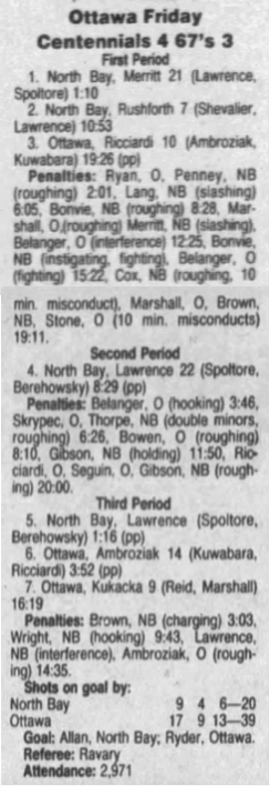 Here are the boxscores from the 1991-92 Ottawa 67’s season. There are some that are missing, but any of the scores that were posted in the Ottawa Citizen are here (56/77 boxscores). If you have any of the games that are missing, please send them my way.