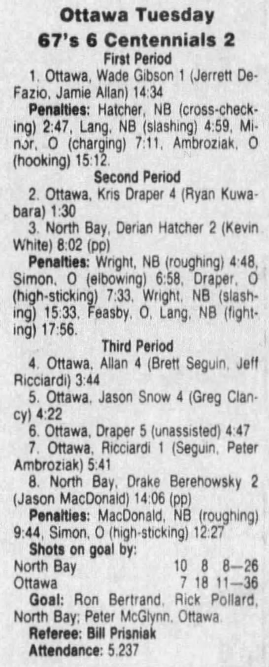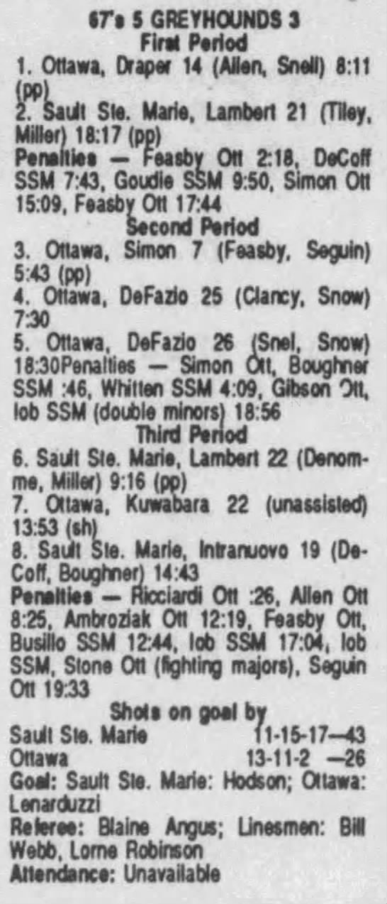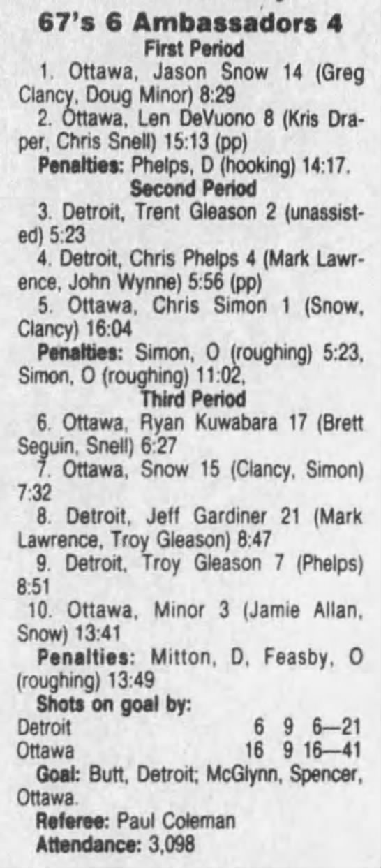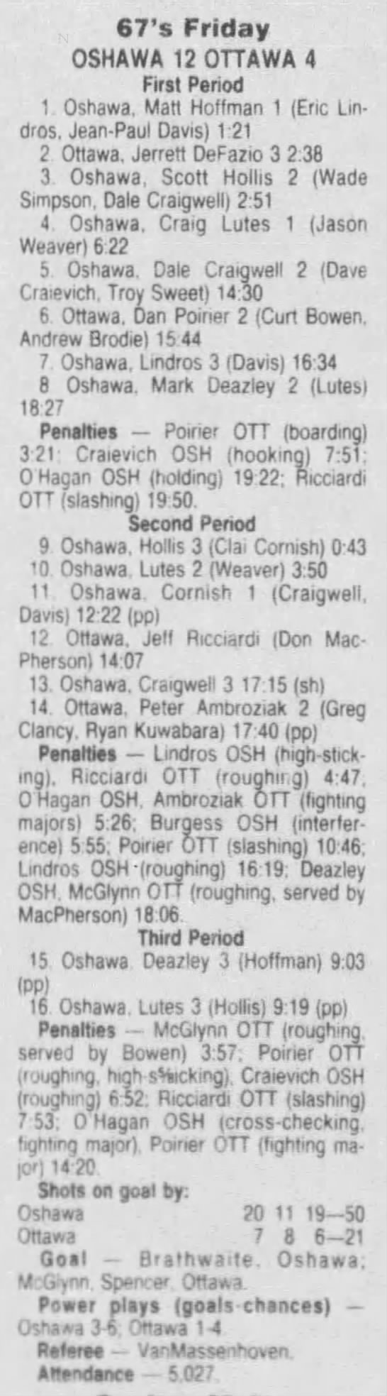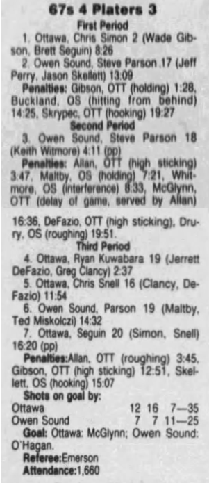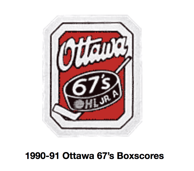 Here are the boxscores from the 1990-91 Ottawa 67’s season. There are some that are missing, but any of the scores that were posted in the Ottawa Citizen are here (60/83 boxscores). If you have any of the games that are missing, please send them my way.