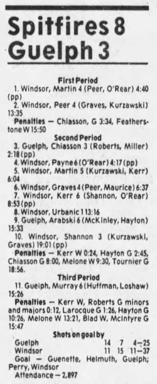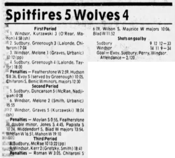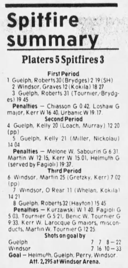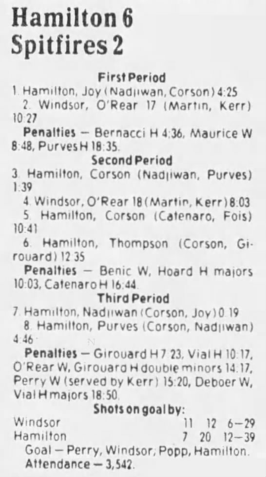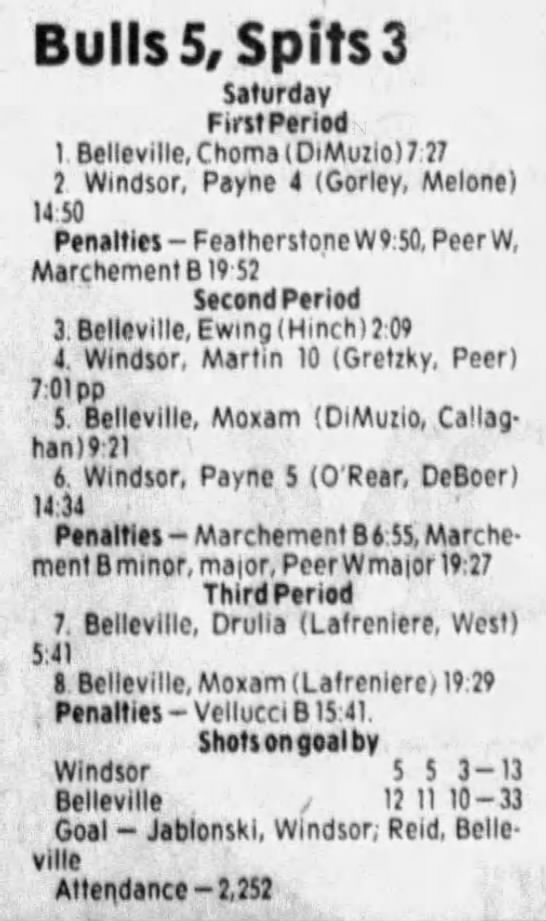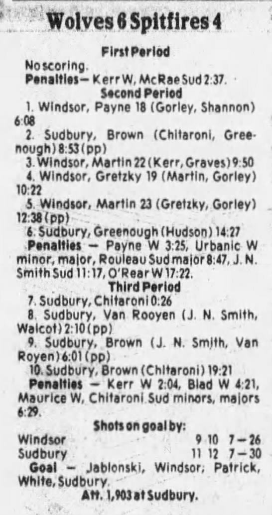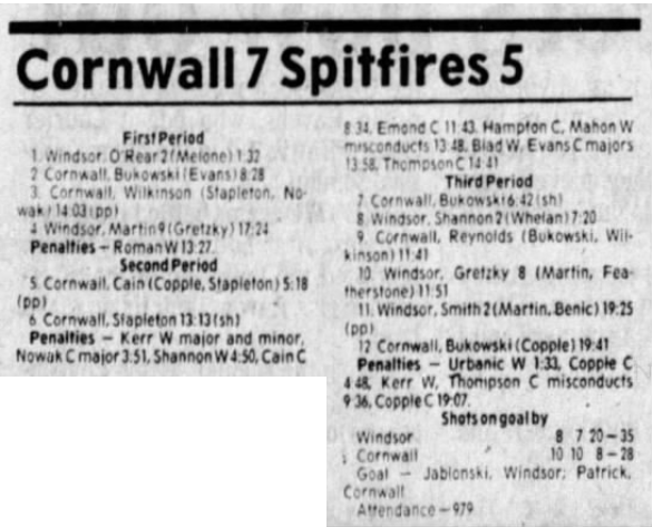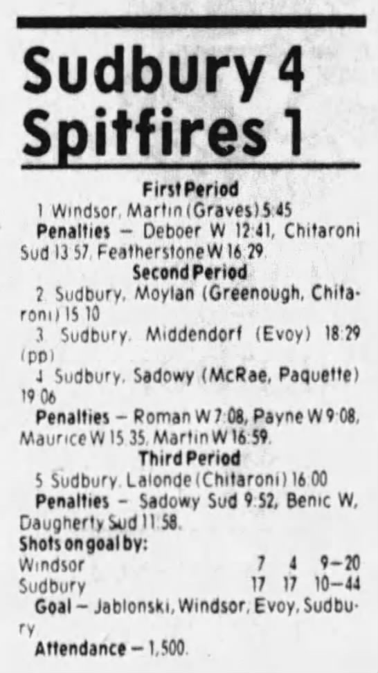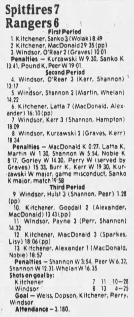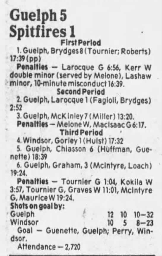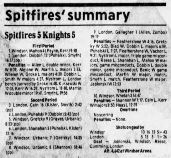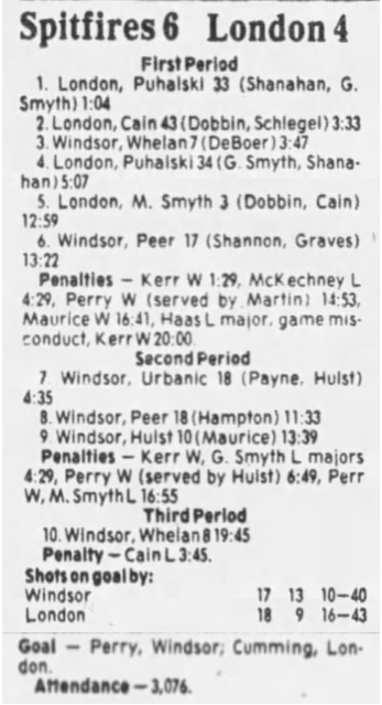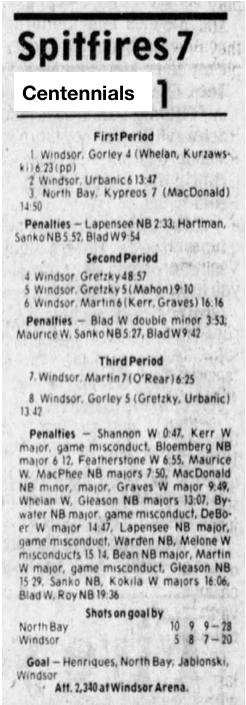 Here are the boxscores from the 1985-86 Windsor Compuware Spitfires season. There is one that is missing, but many of them are here (81/82 boxscores). If you have any of the games that are missing, please send them my way.