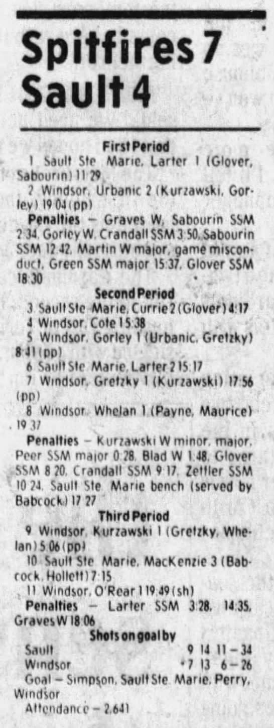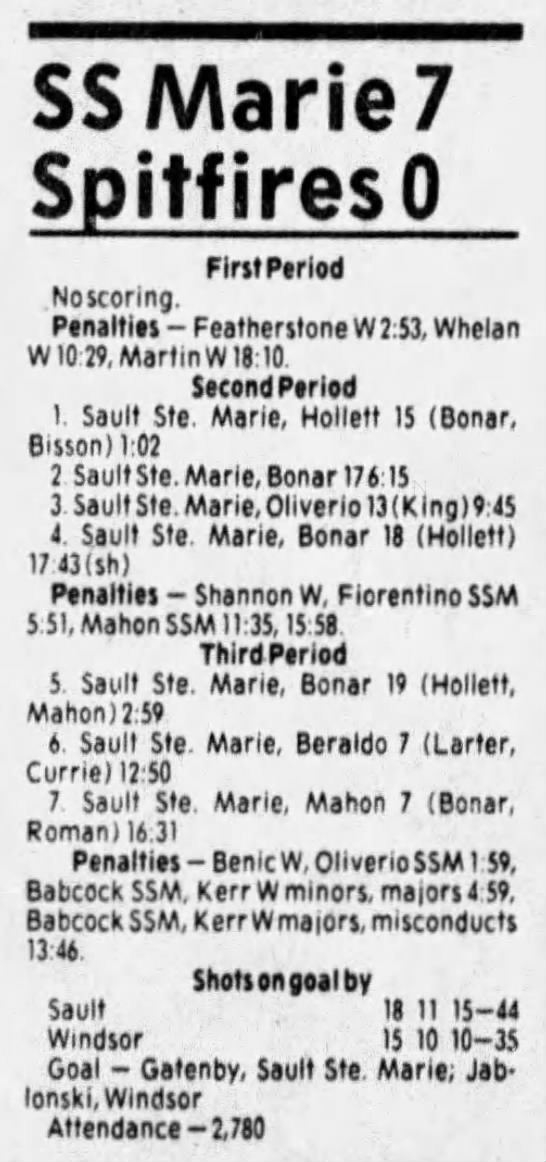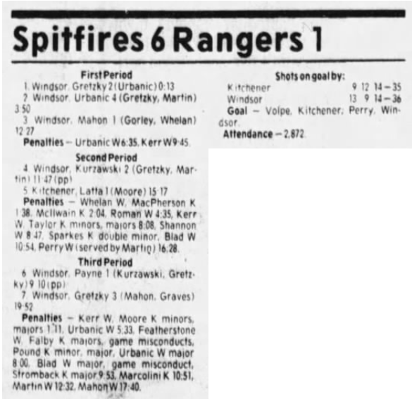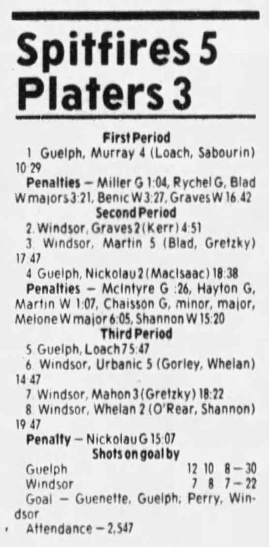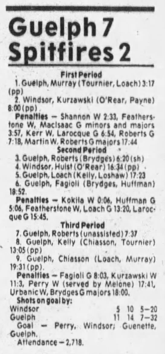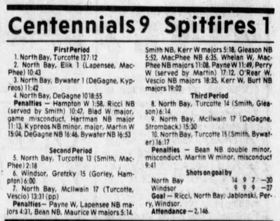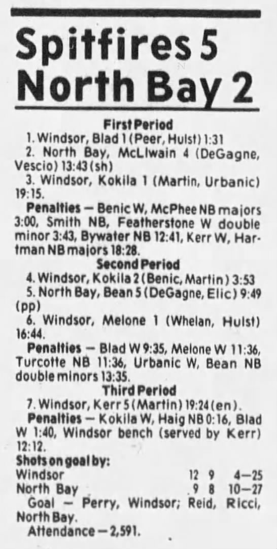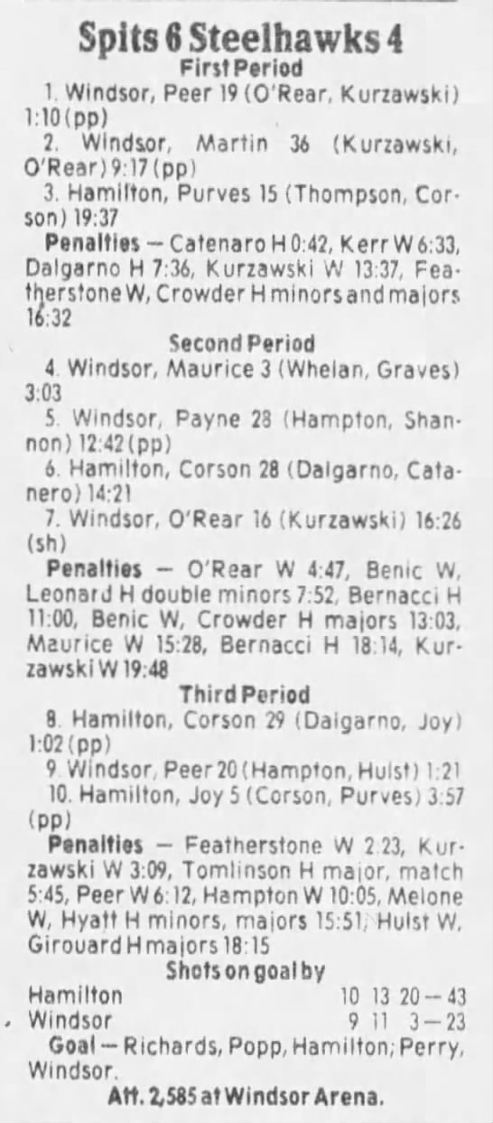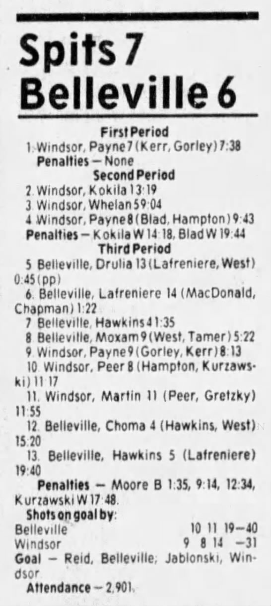 Here are the boxscores from the 1985-86 Windsor Compuware Spitfires season. There is one that is missing, but many of them are here (81/82 boxscores). If you have any of the games that are missing, please send them my way.