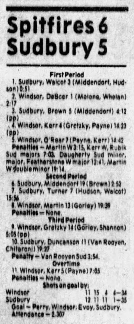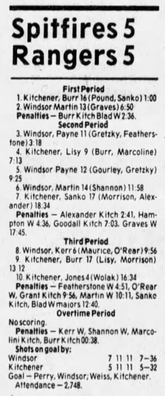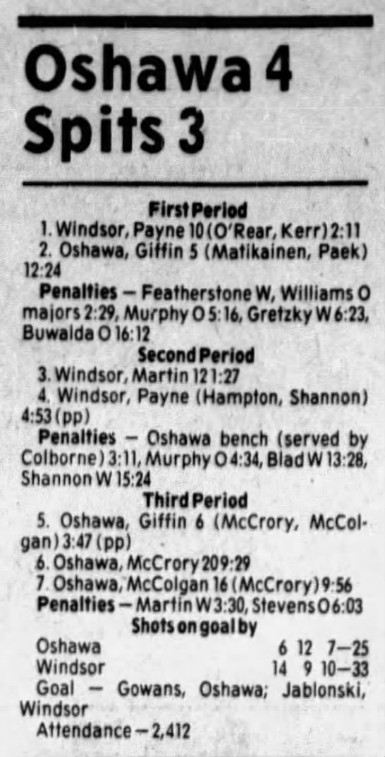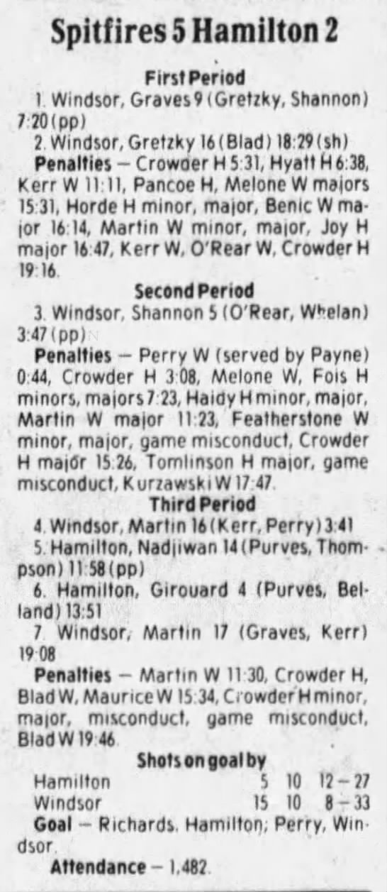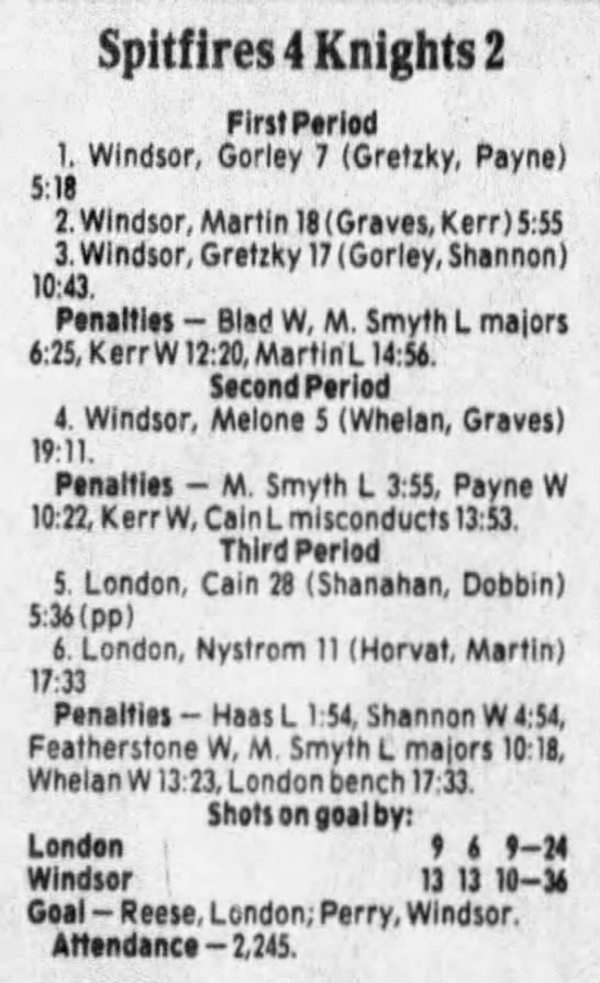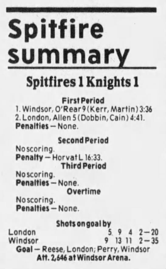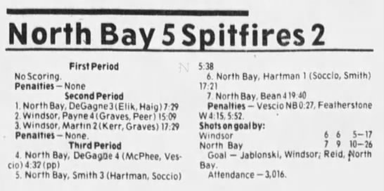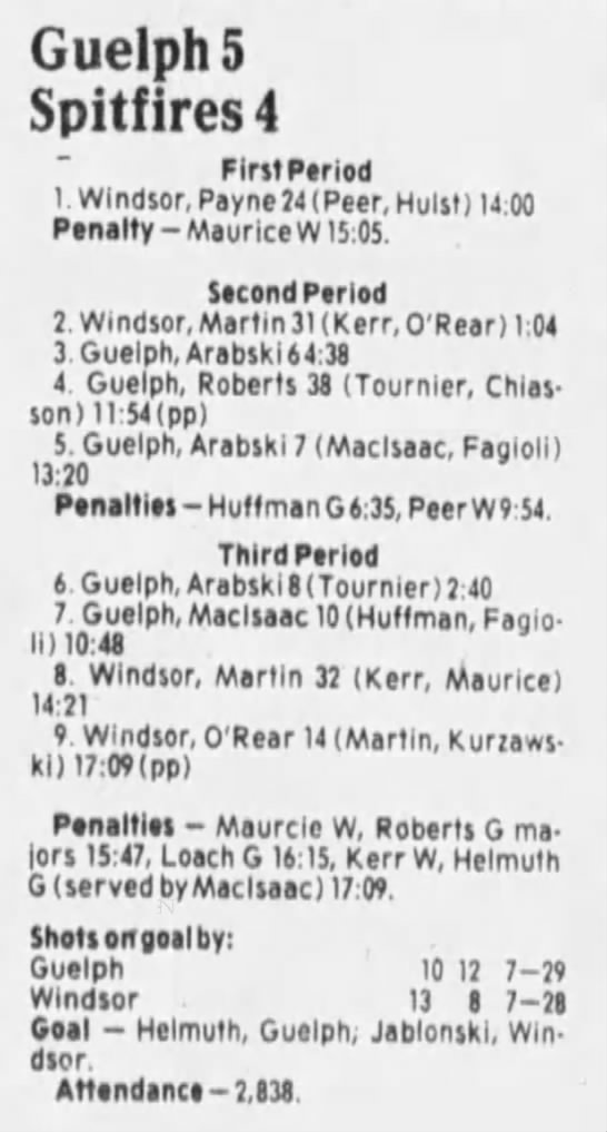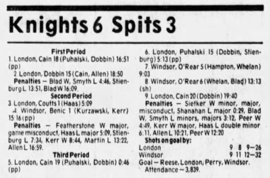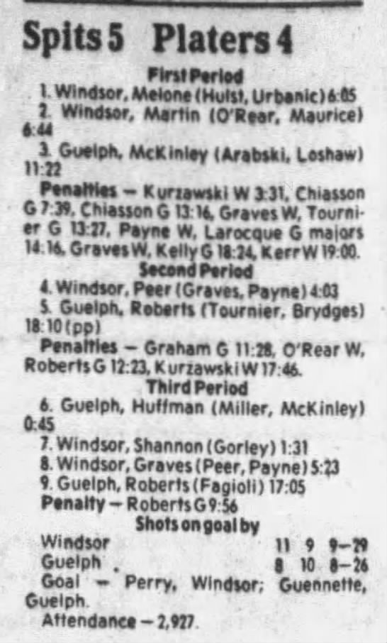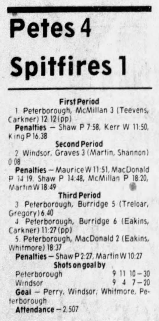 Here are the boxscores from the 1985-86 Windsor Compuware Spitfires season. There is one that is missing, but many of them are here (81/82 boxscores). If you have any of the games that are missing, please send them my way.