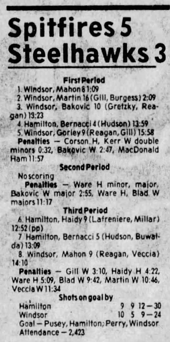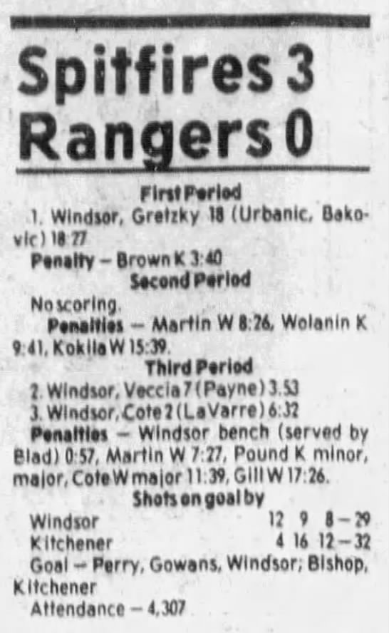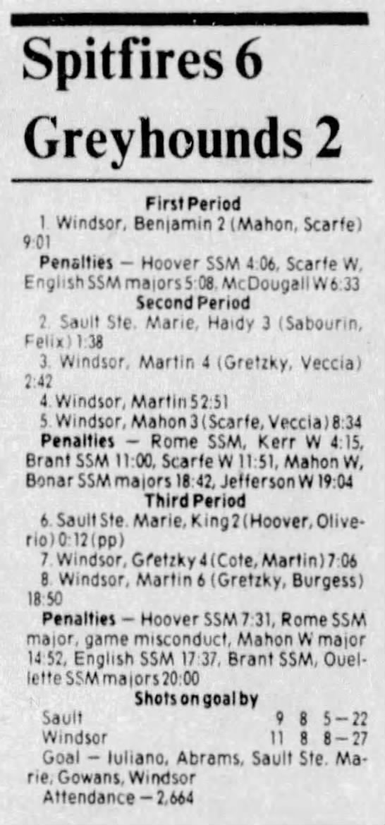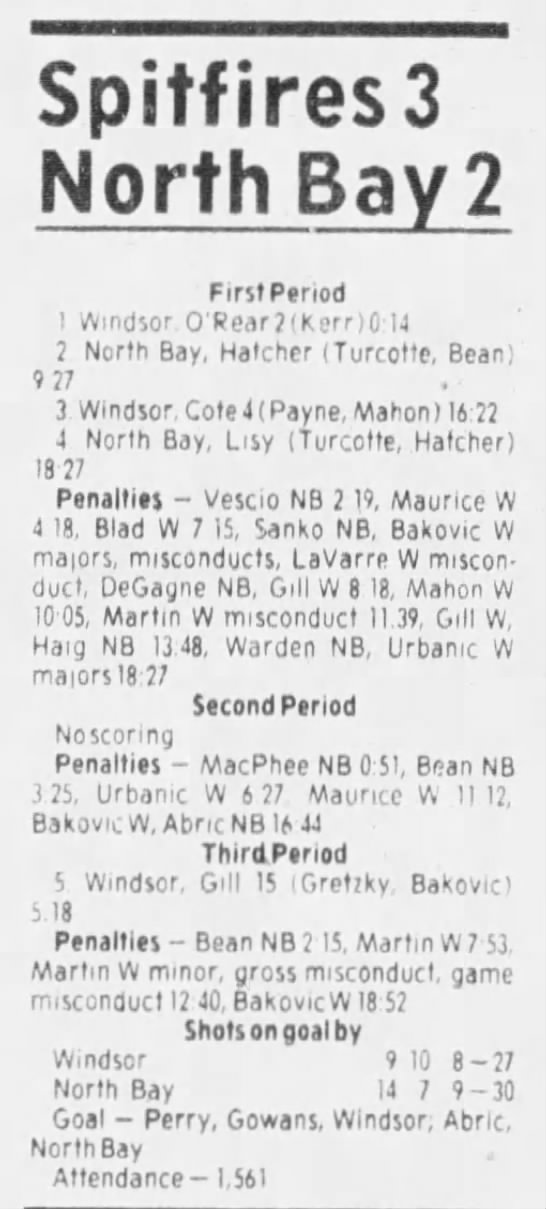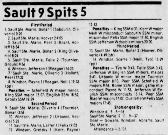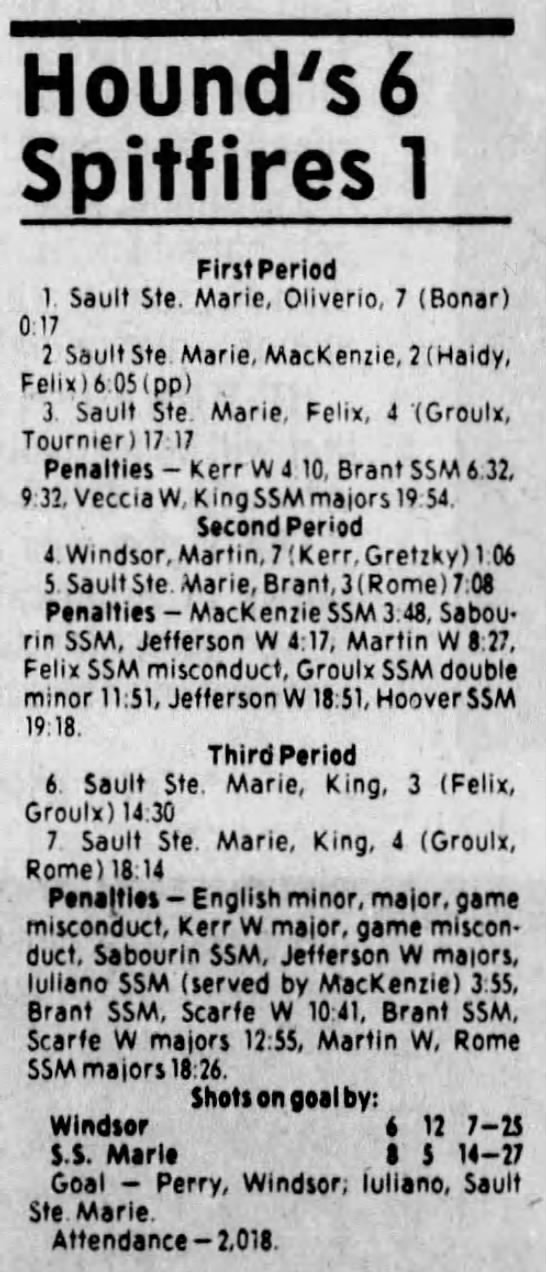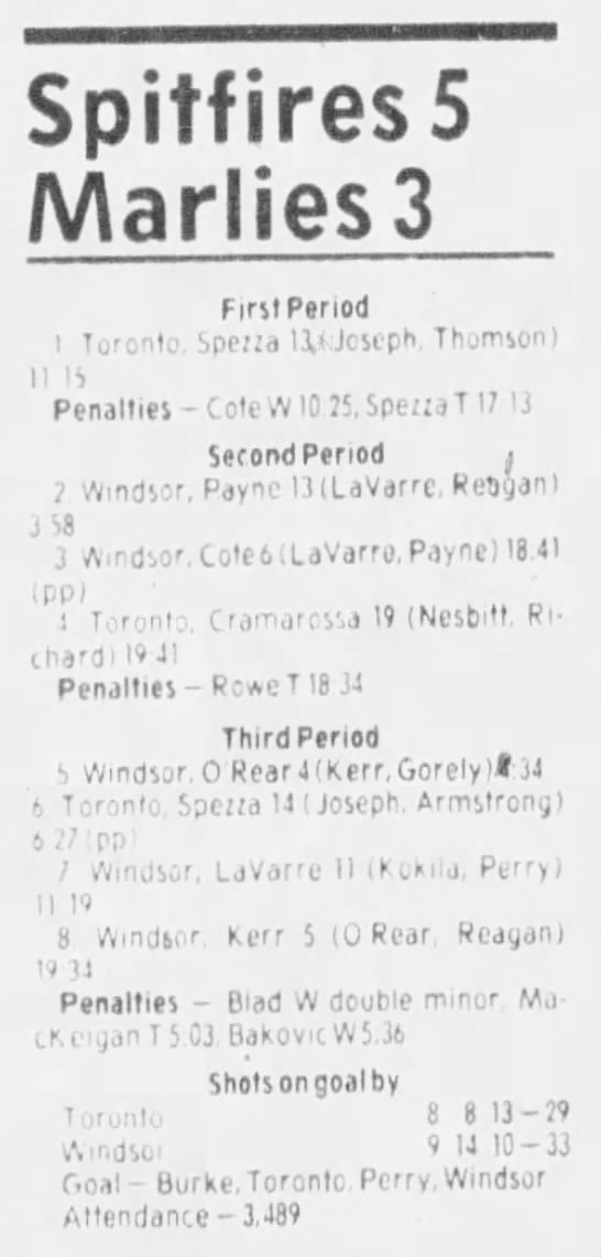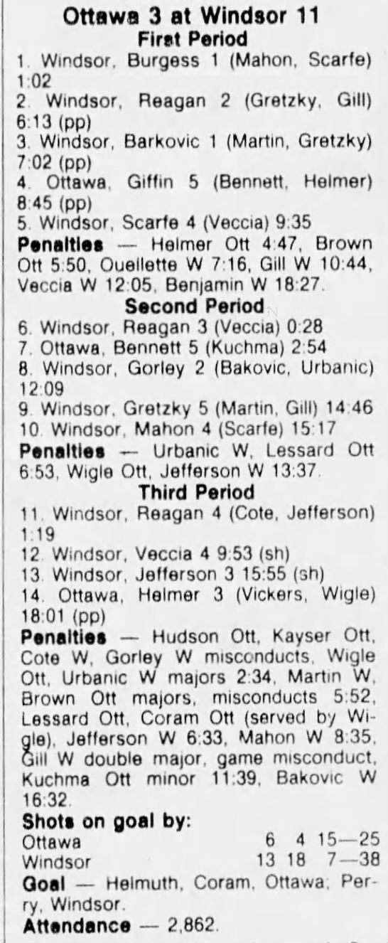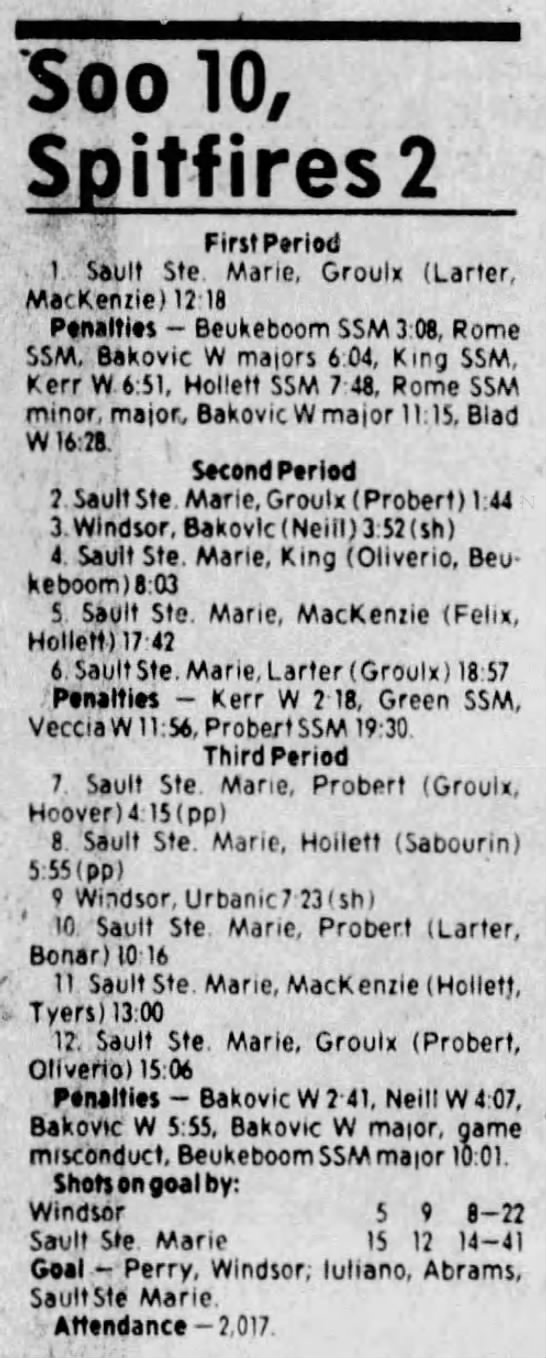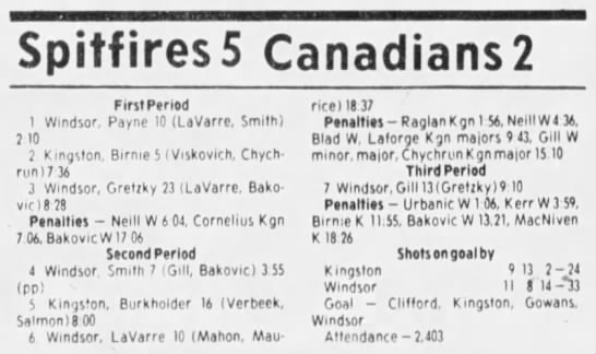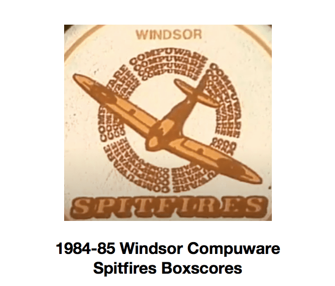 Here are the boxscores from the 1984-85 Windsor Compuware Spitfires season. There are a couple that are missing, but many of them are here (69/70 boxscores). If you have any of the games that are missing, please send them my way.