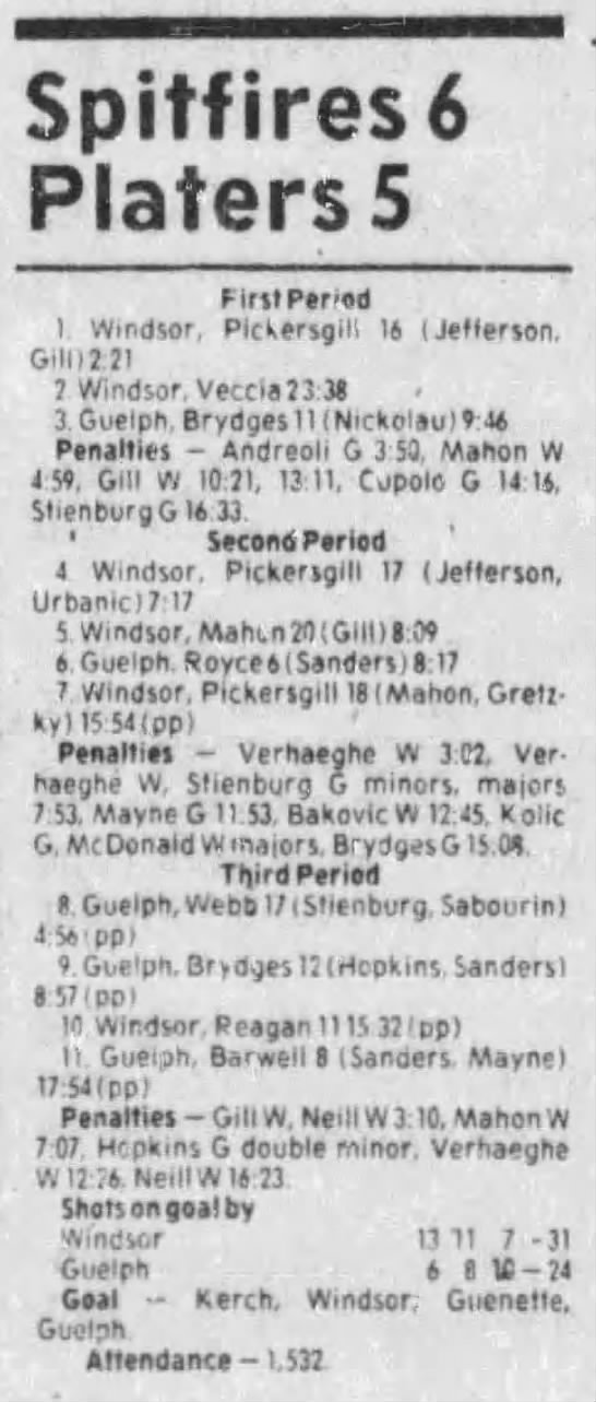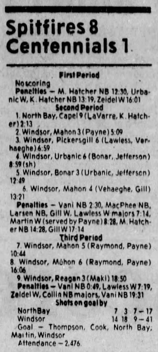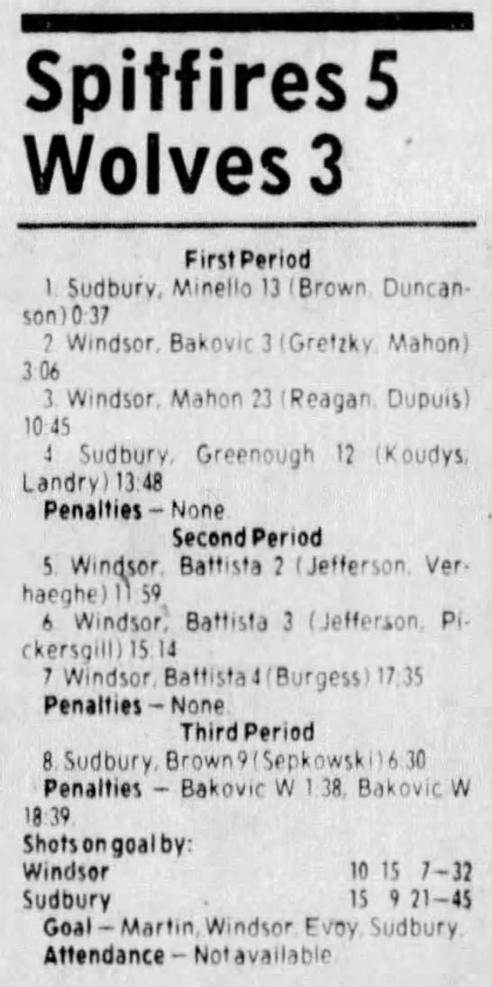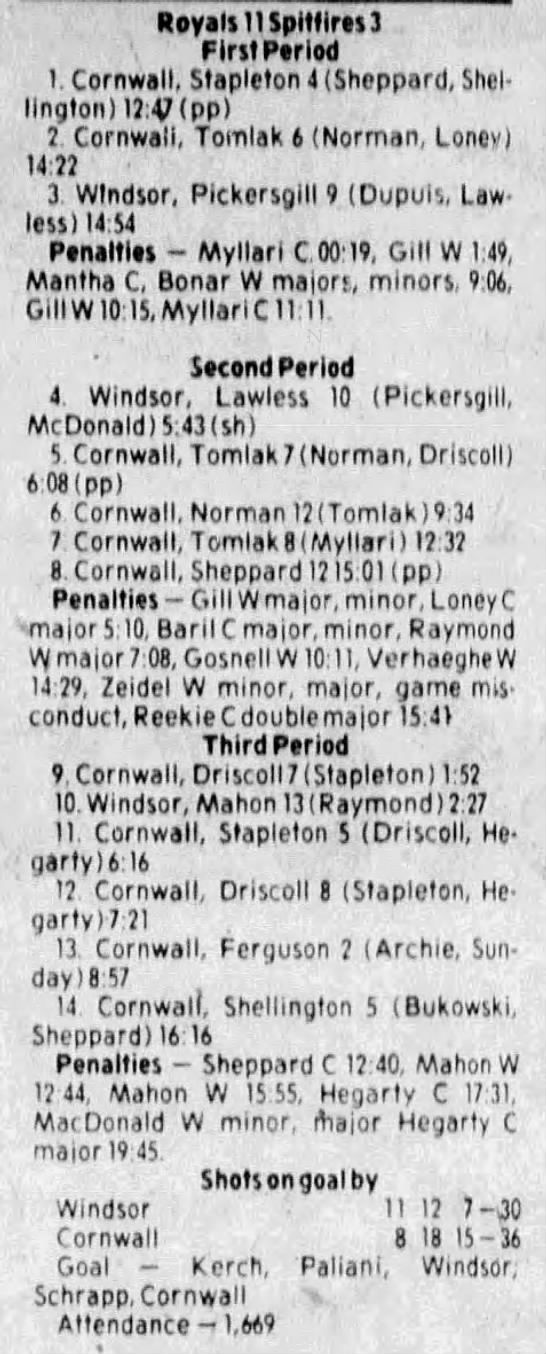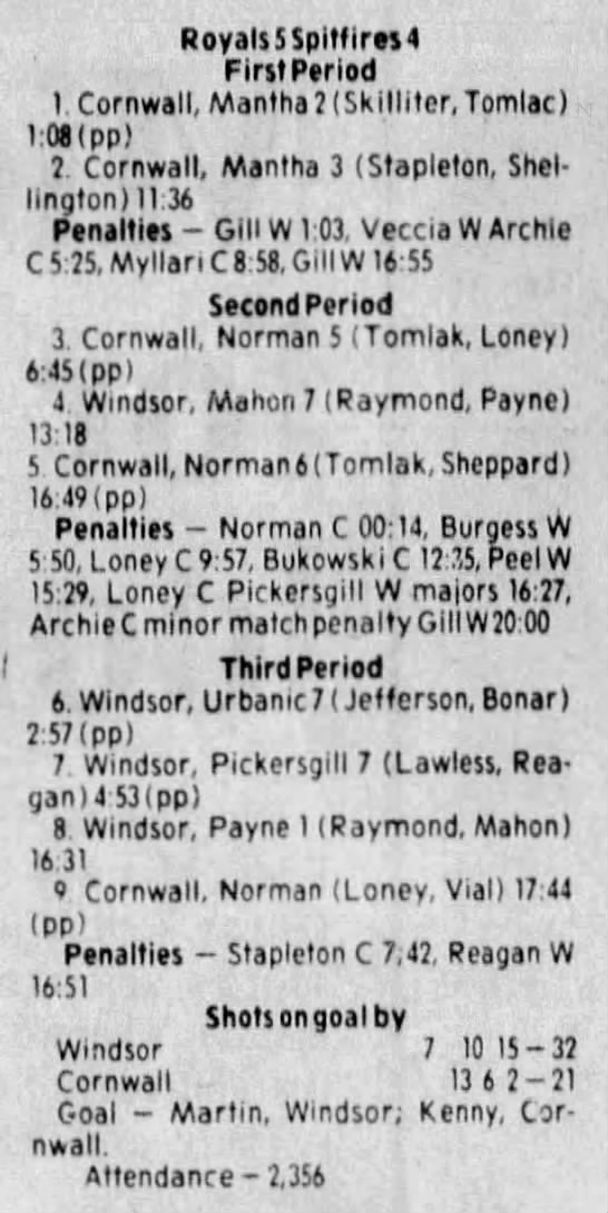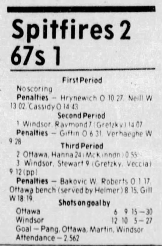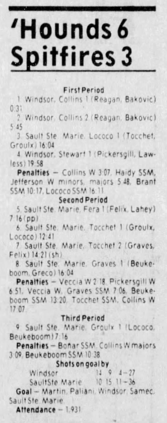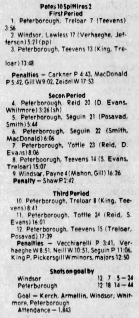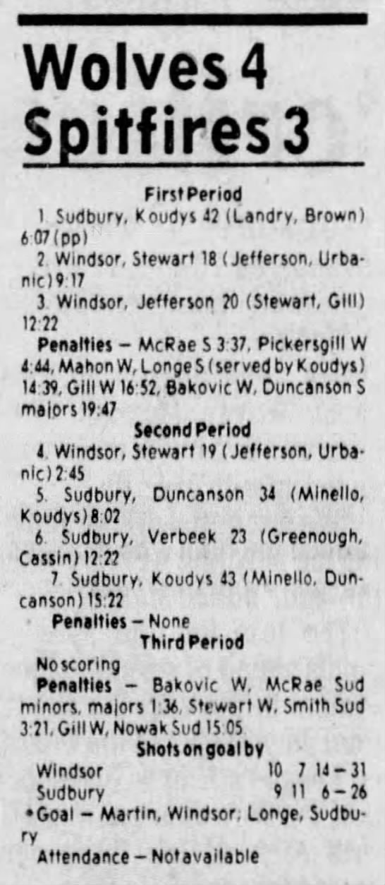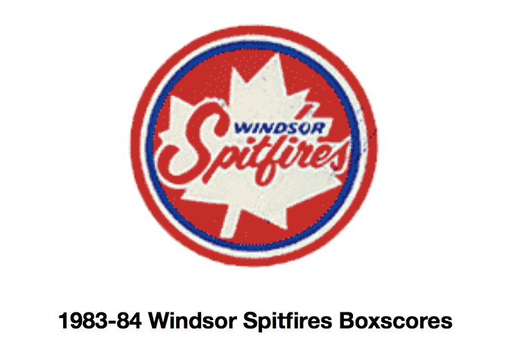 Here are the boxscores from the 1983-84 Windsor Spitfires season. Every game from that season is here (73/73 boxscores). If you have any games that are missing from any other team or season, please send them my way.