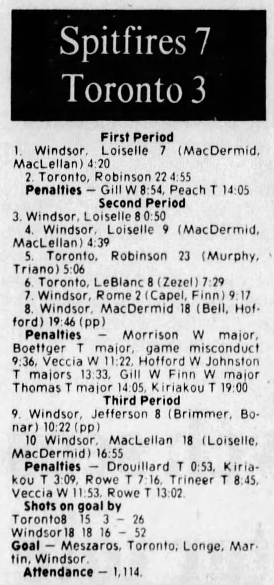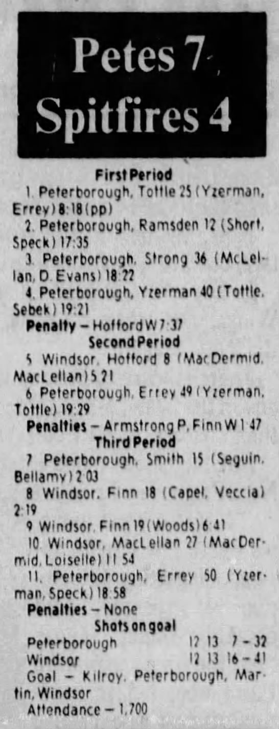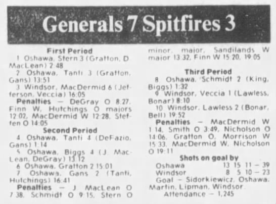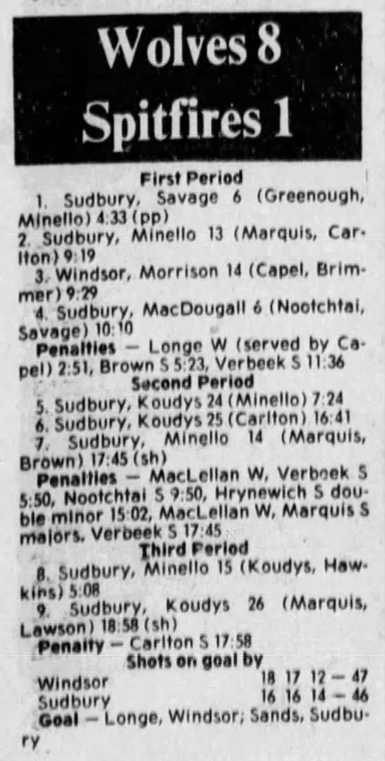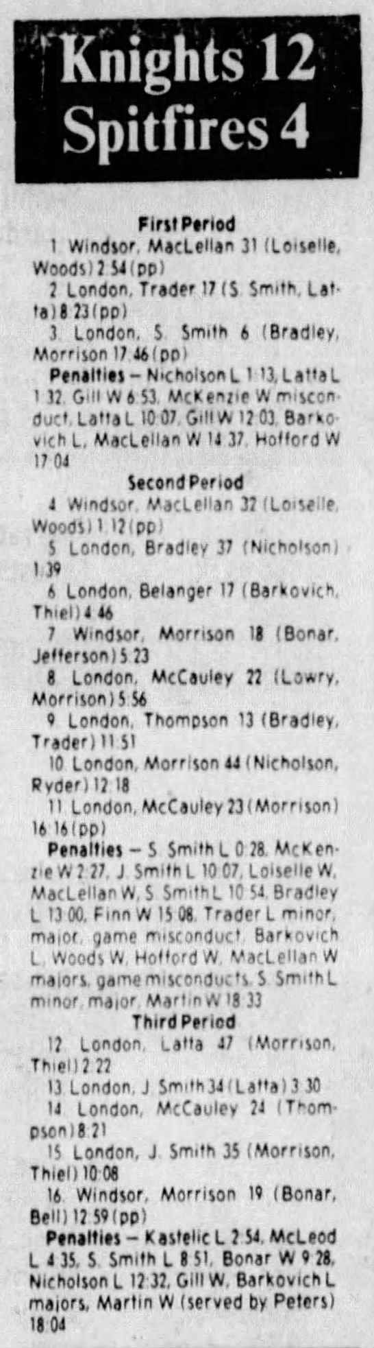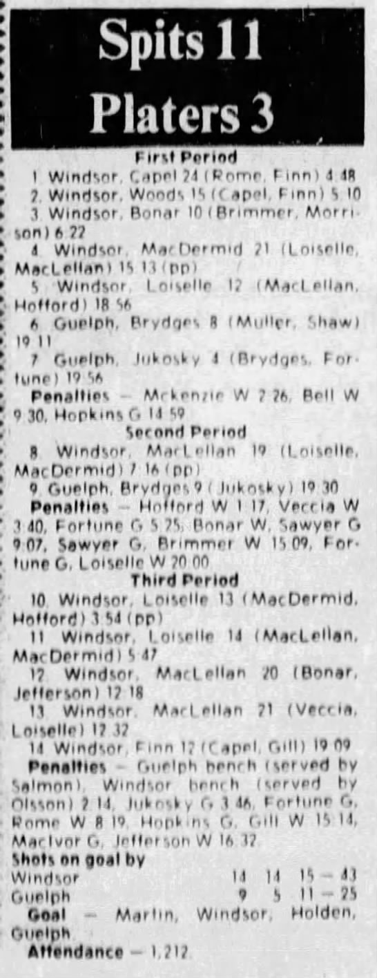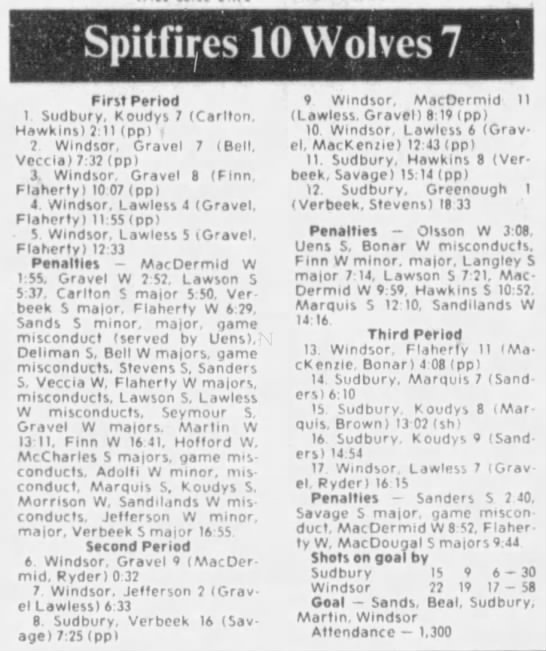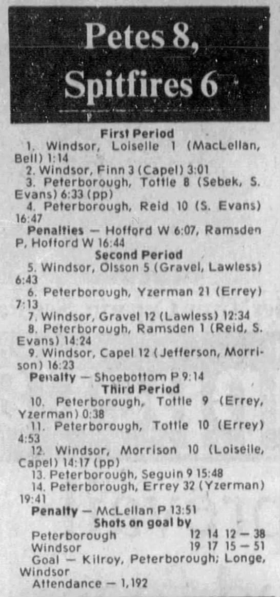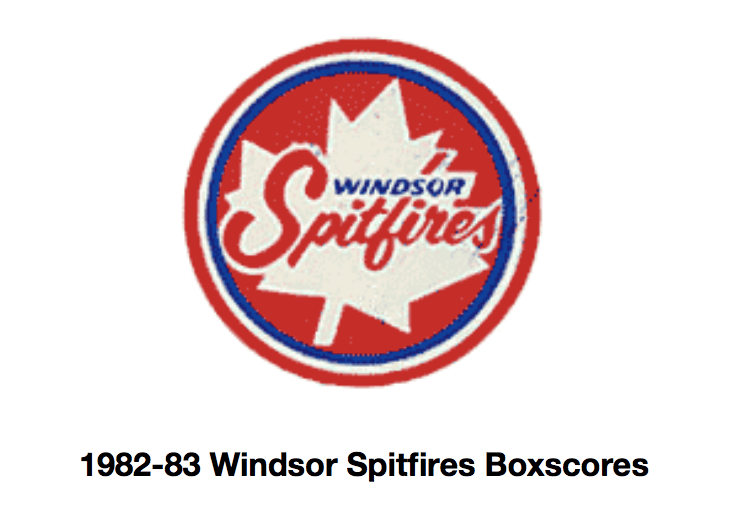 Here are the boxscores from the 1982-83 Windsor Spitfires season. Every game from that season is here (73/73 boxscores). If you have any games that are missing from any other team or season, please send them my way.