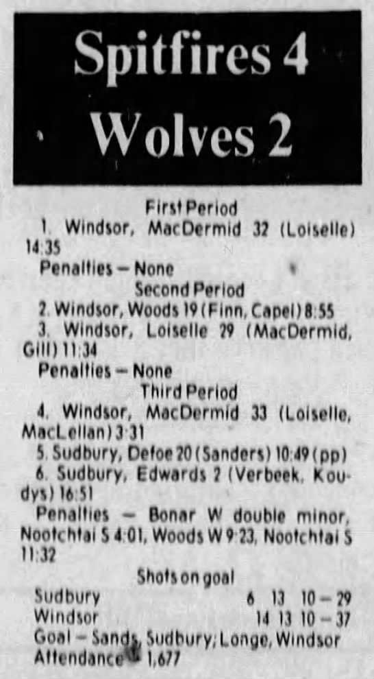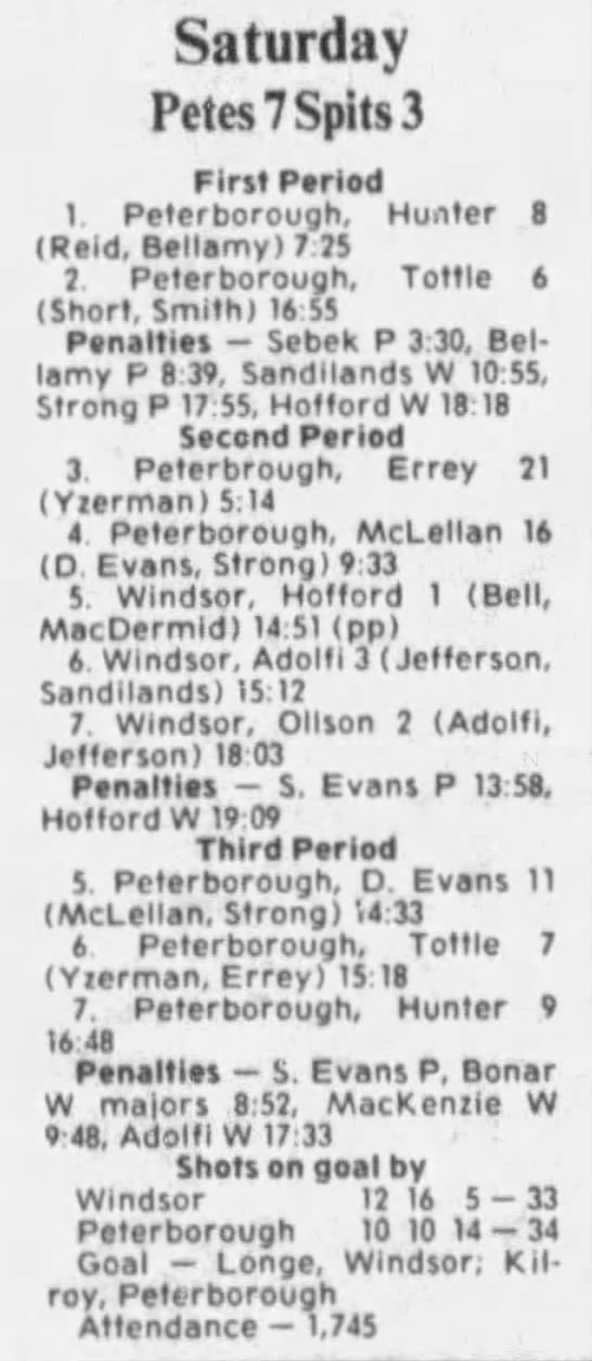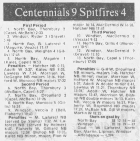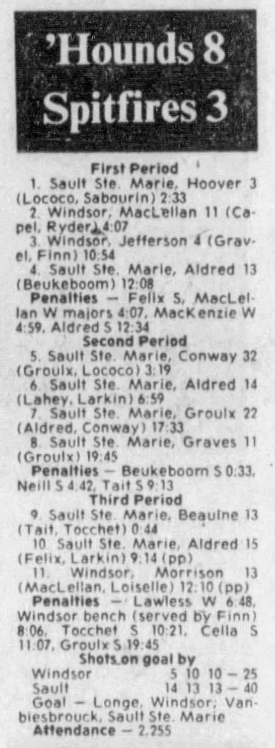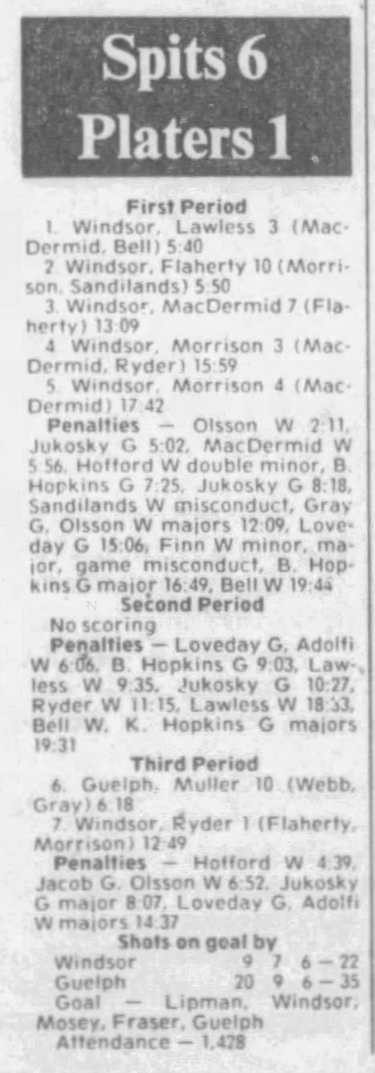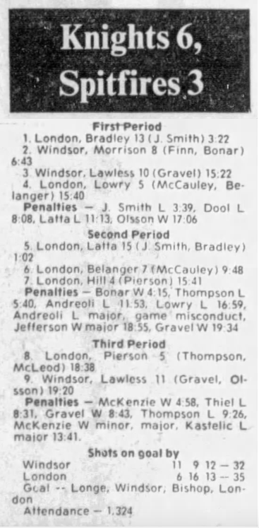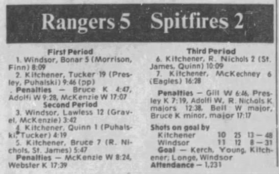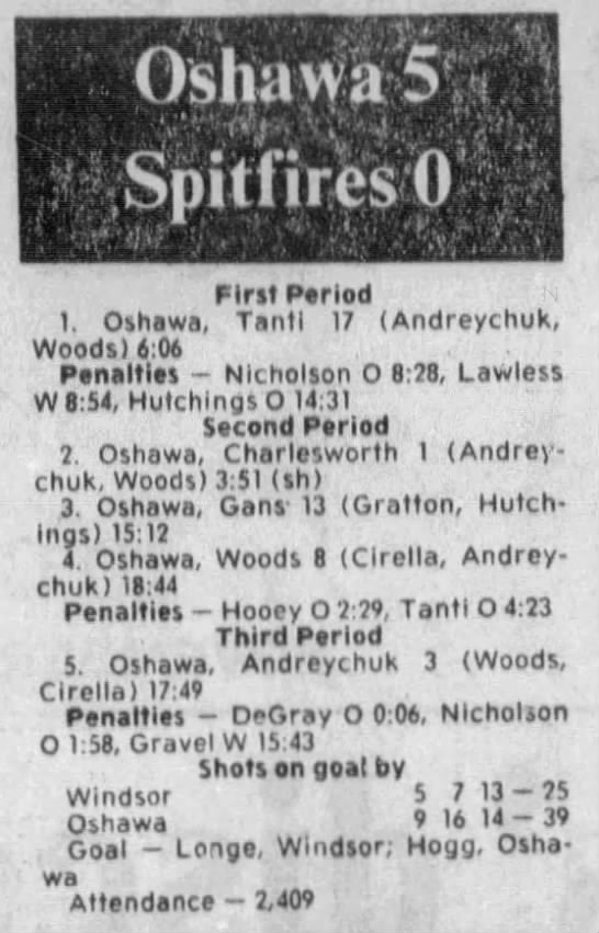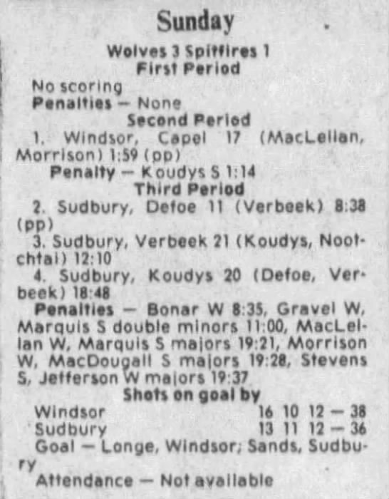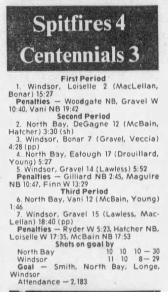Here are the boxscores from the 1982-83 Windsor Spitfires season. Every game from that season is here (73/73 boxscores). If you have any games that are missing from any other team or season, please send them my way.