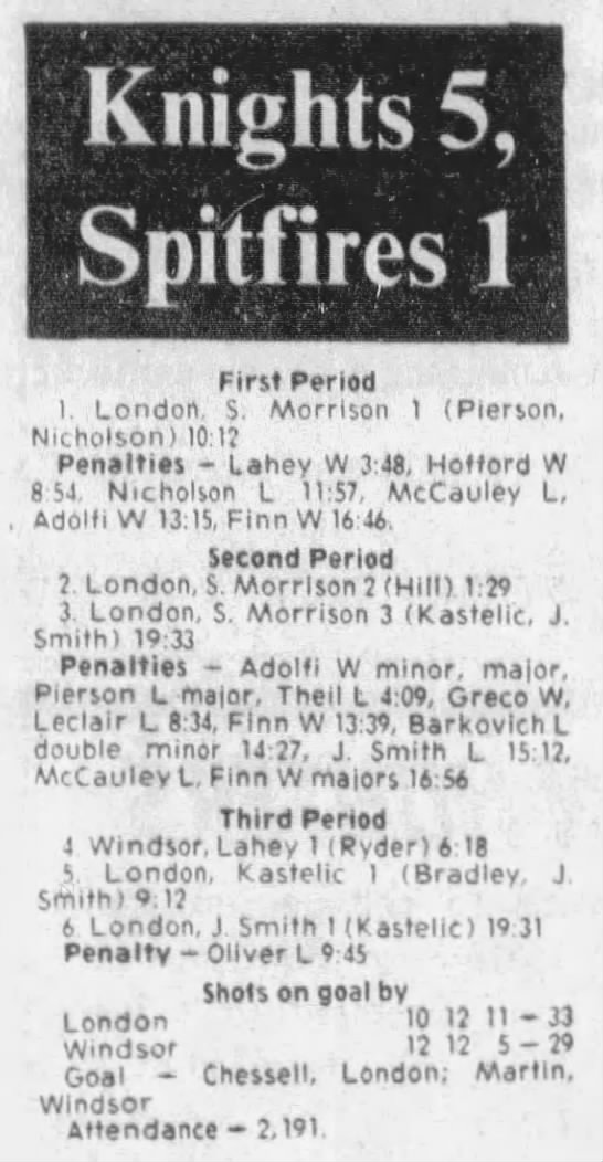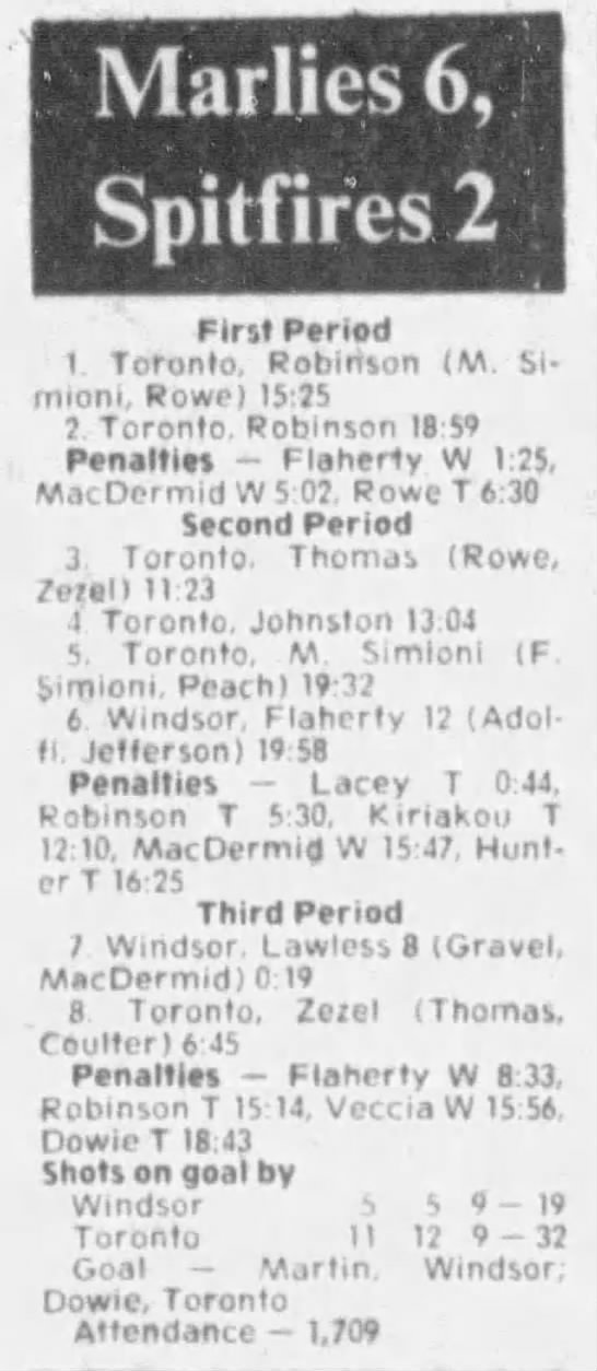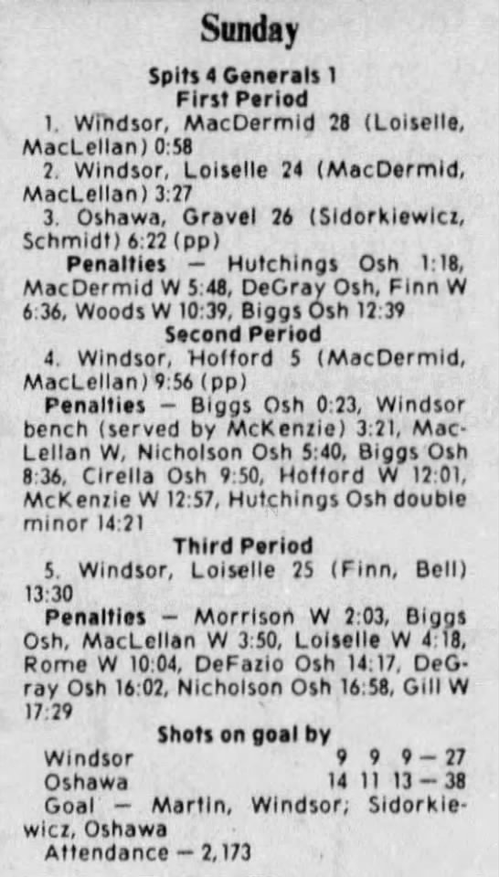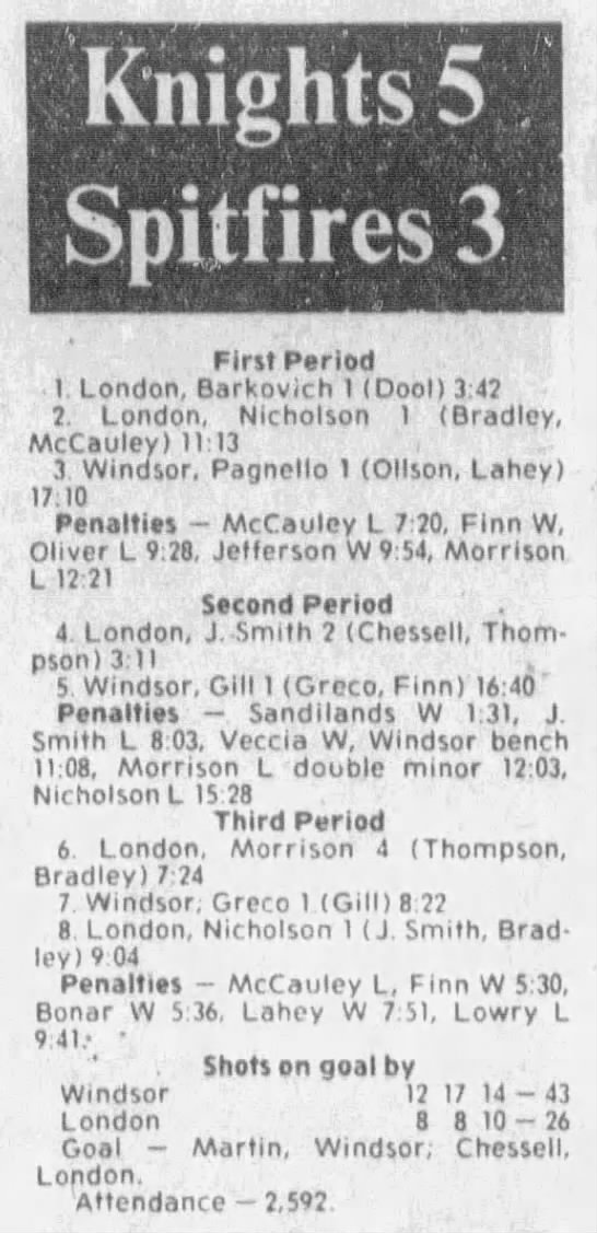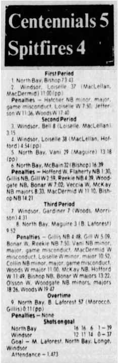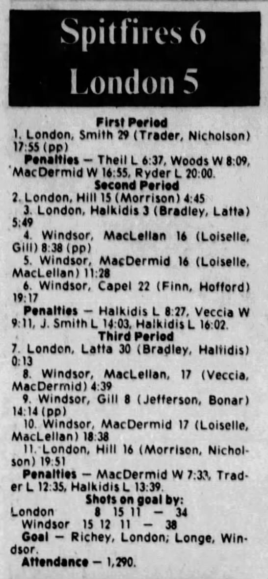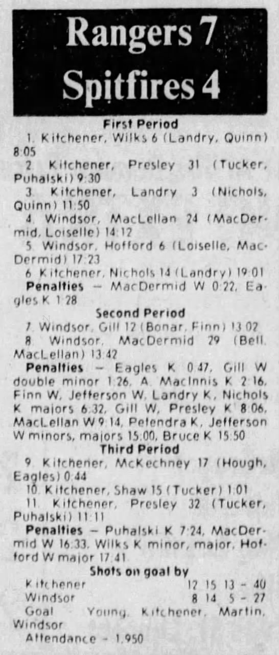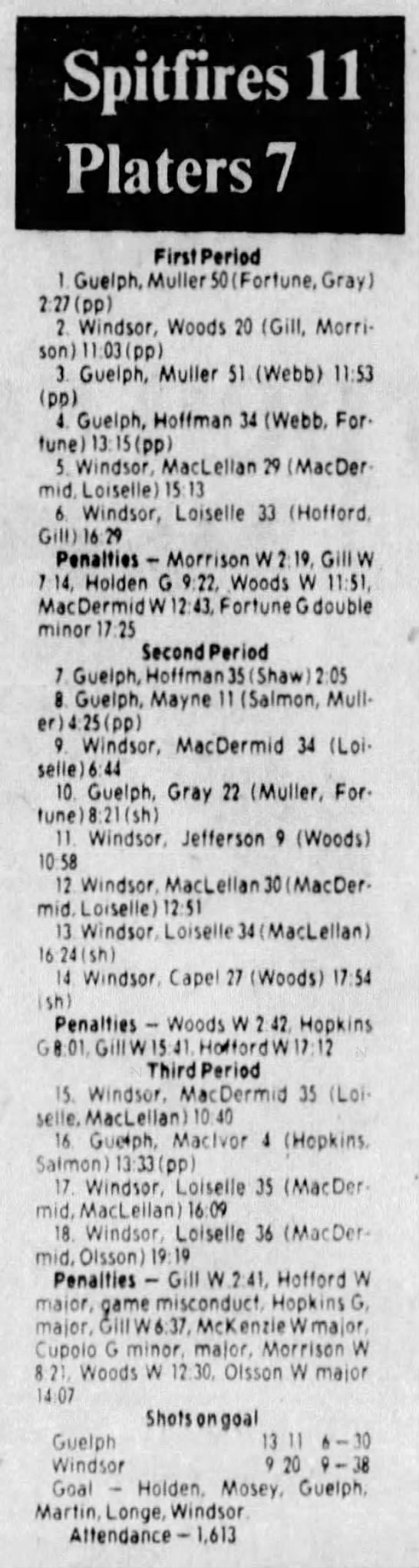 Here are the boxscores from the 1982-83 Windsor Spitfires season. Every game from that season is here (73/73 boxscores). If you have any games that are missing from any other team or season, please send them my way.