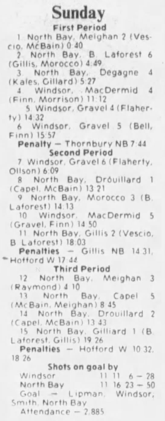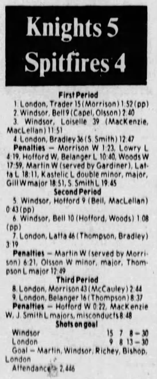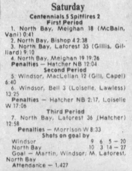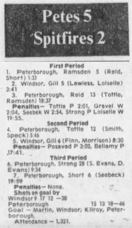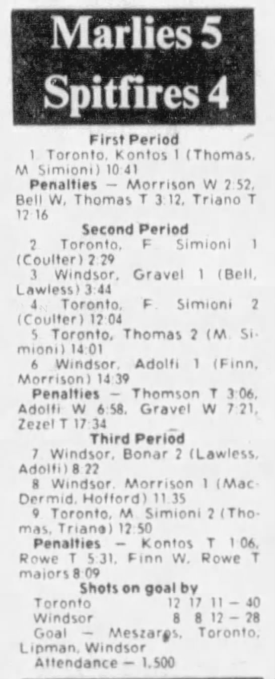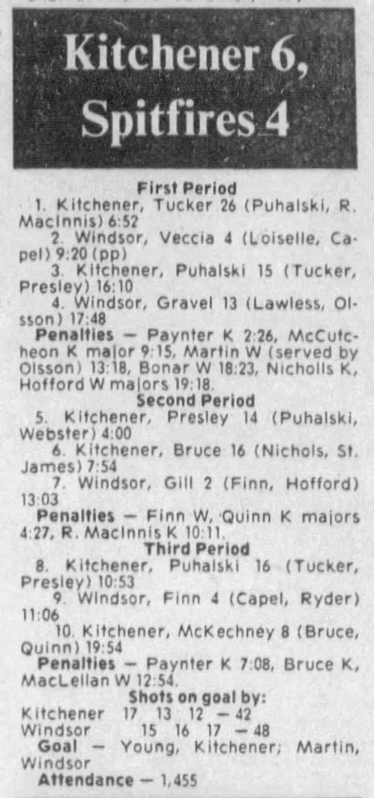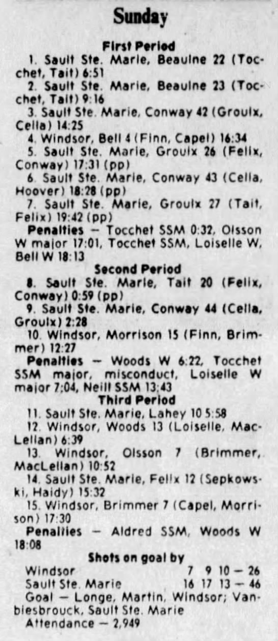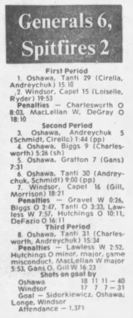 Here are the boxscores from the 1982-83 Windsor Spitfires season. Every game from that season is here (73/73 boxscores). If you have any games that are missing from any other team or season, please send them my way.