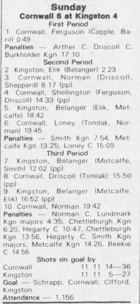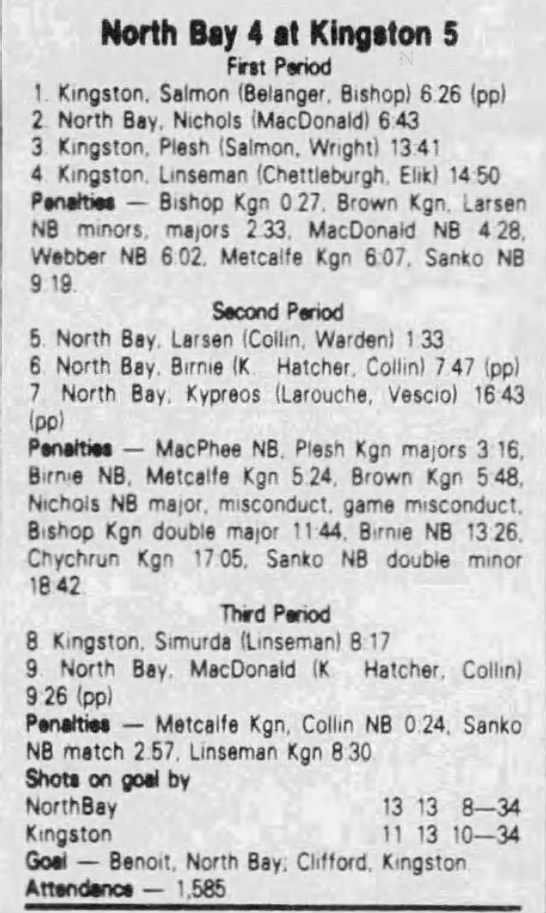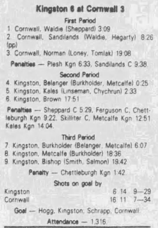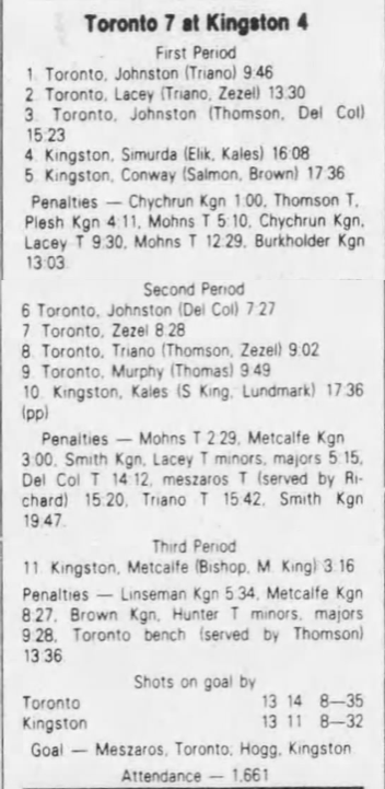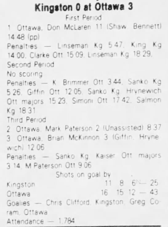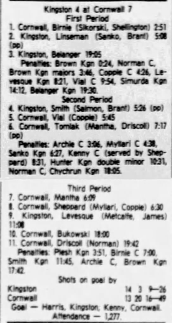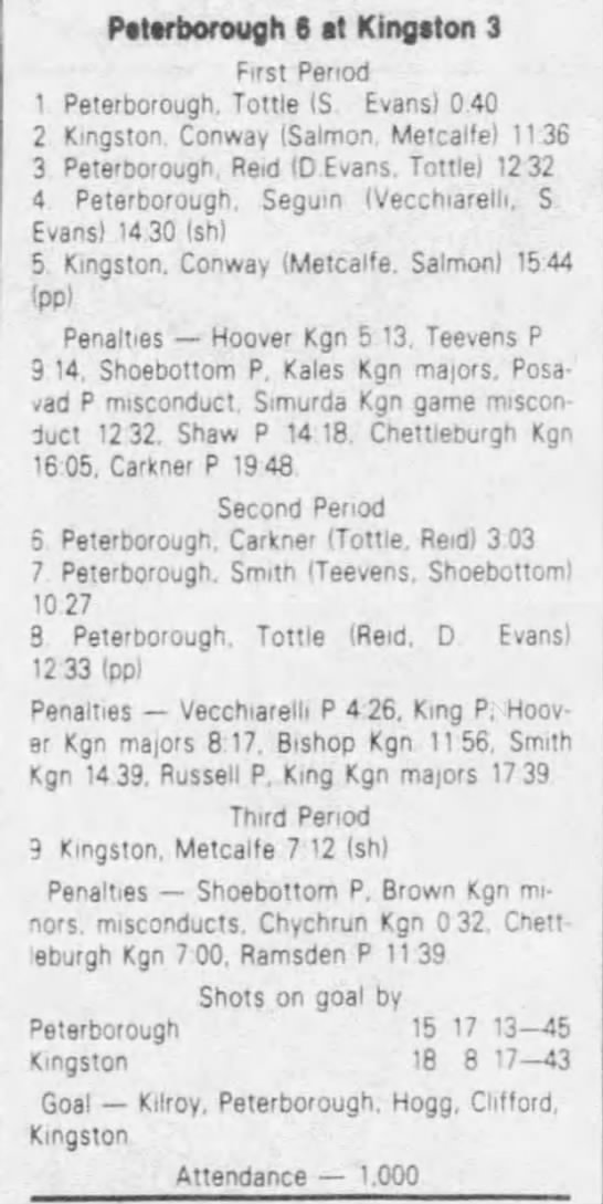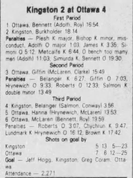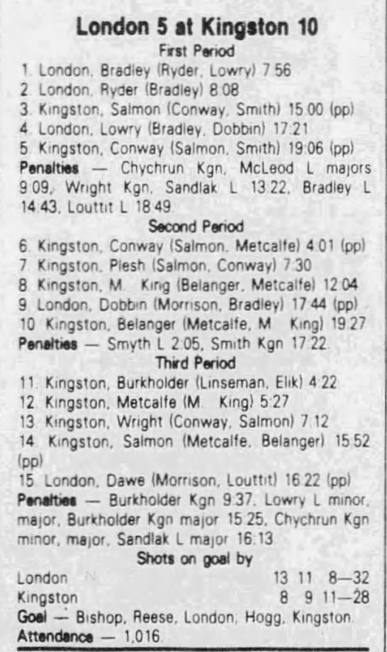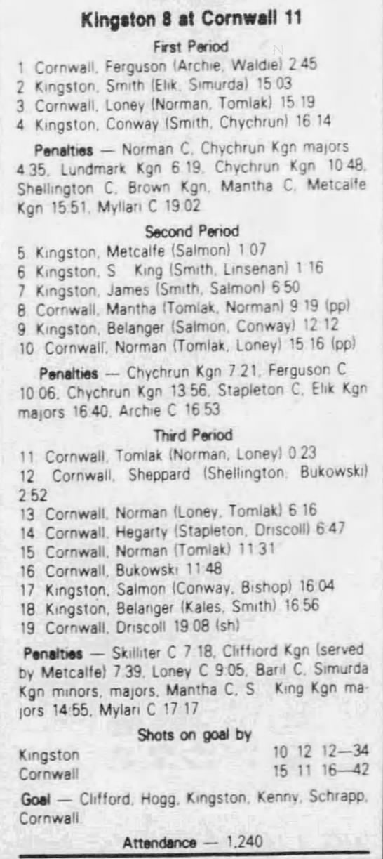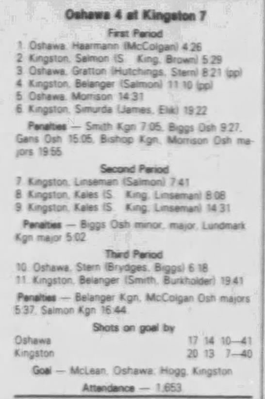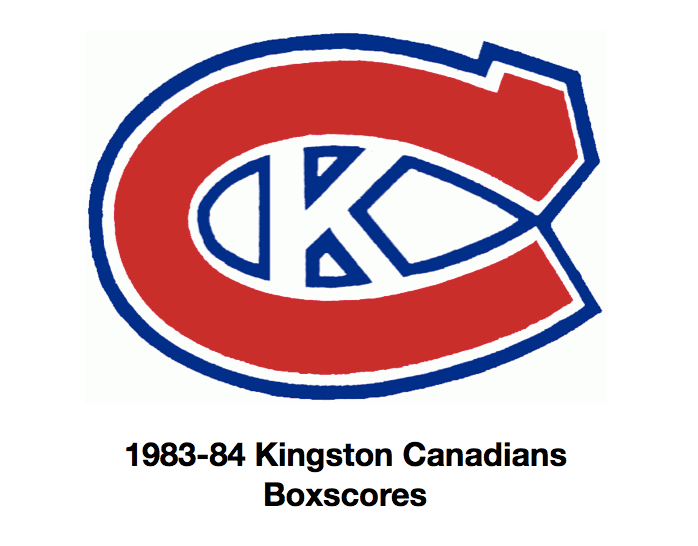Here are the boxscores from the 1983-84 Kingston Canadians season. Every boxscore from that year are here (70/70 boxscores). If you have any of the games that are missing, please send them my way.