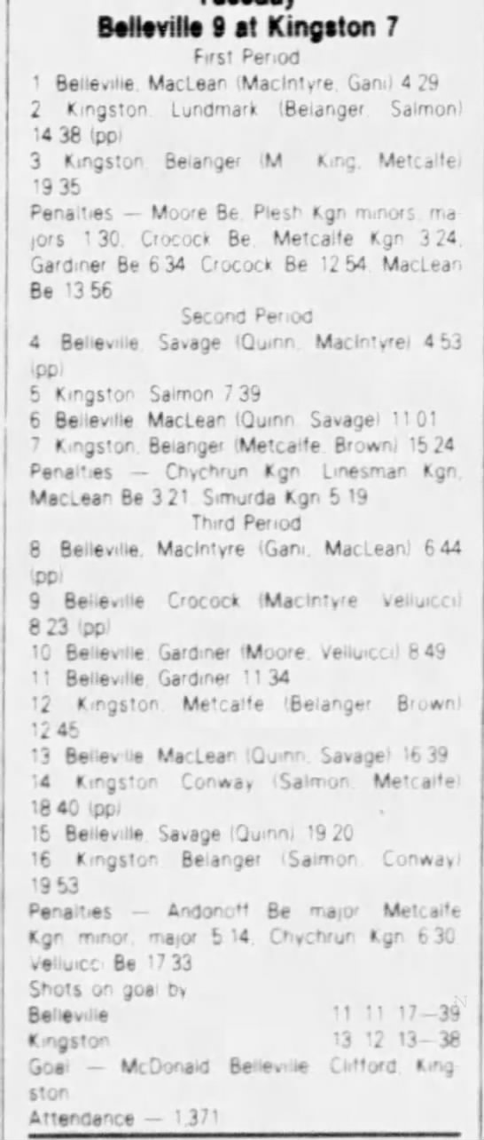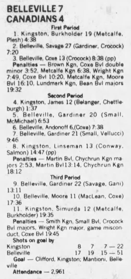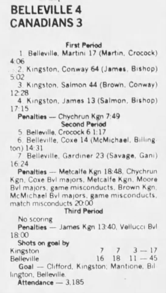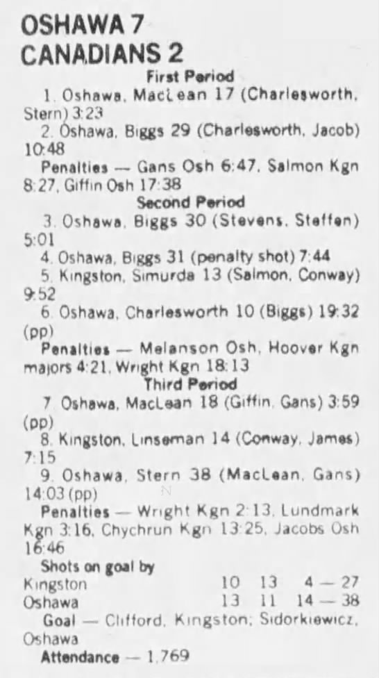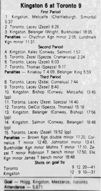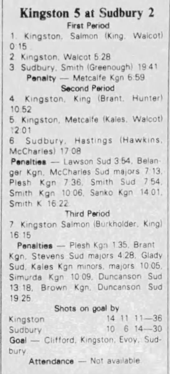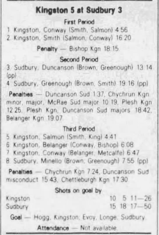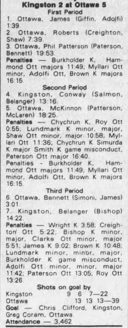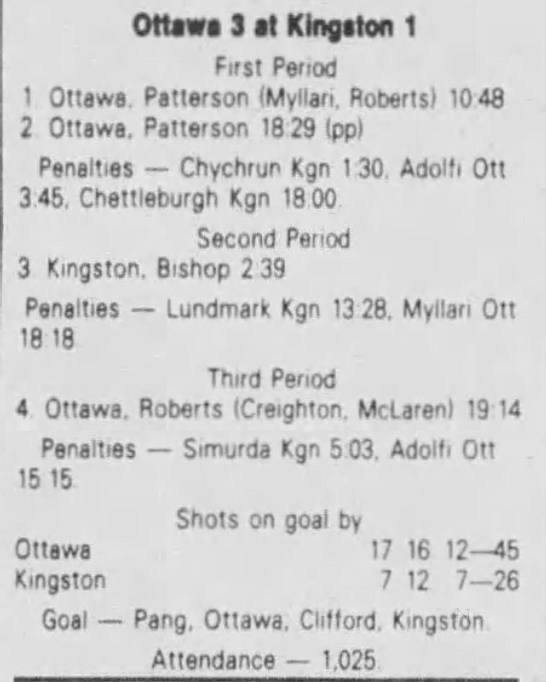 Here are the boxscores from the 1983-84 Kingston Canadians season. Every boxscore from that year are here (70/70 boxscores). If you have any of the games that are missing, please send them my way.