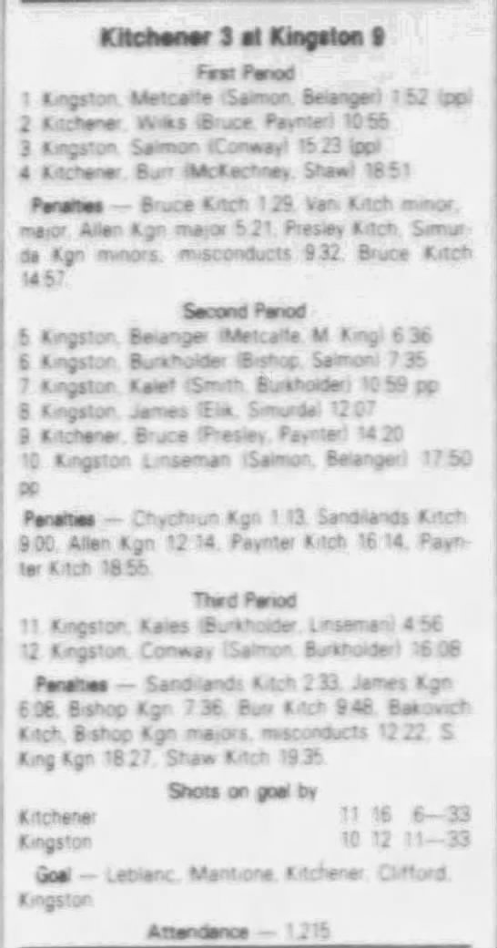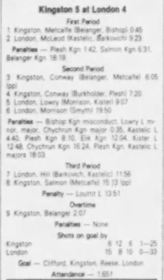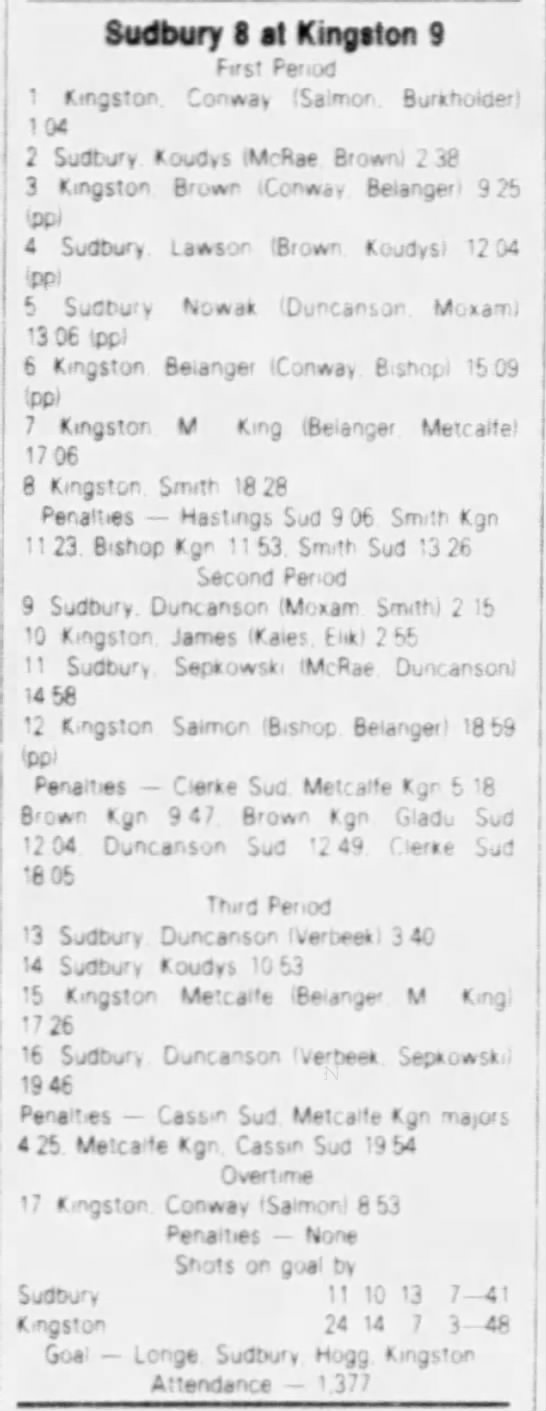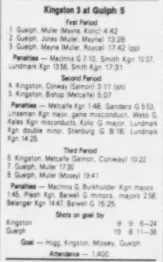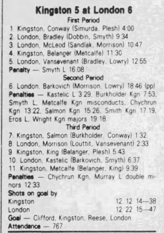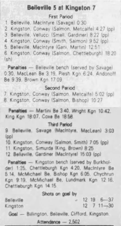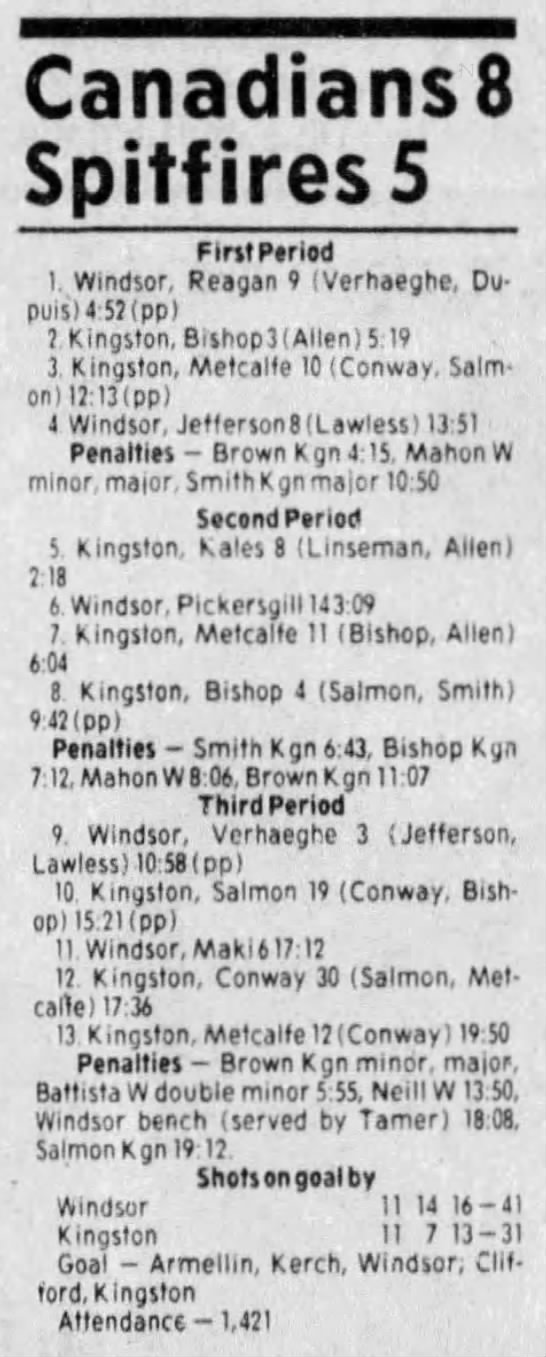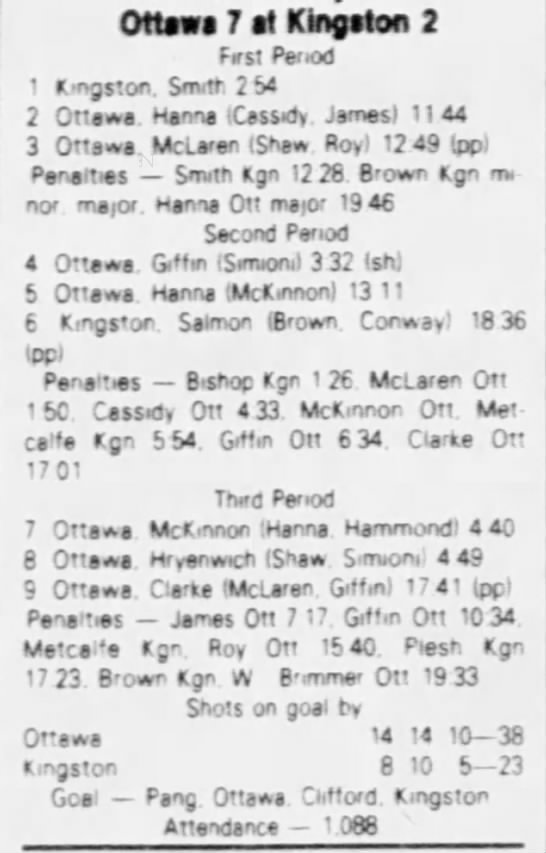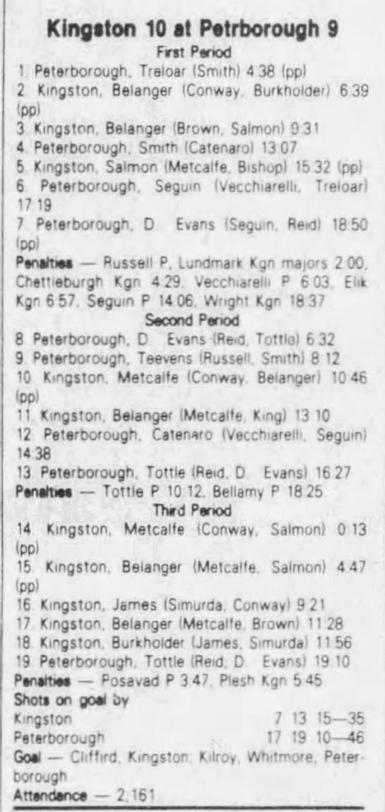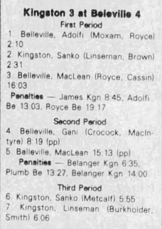 Here are the boxscores from the 1983-84 Kingston Canadians season. Every boxscore from that year are here (70/70 boxscores). If you have any of the games that are missing, please send them my way.