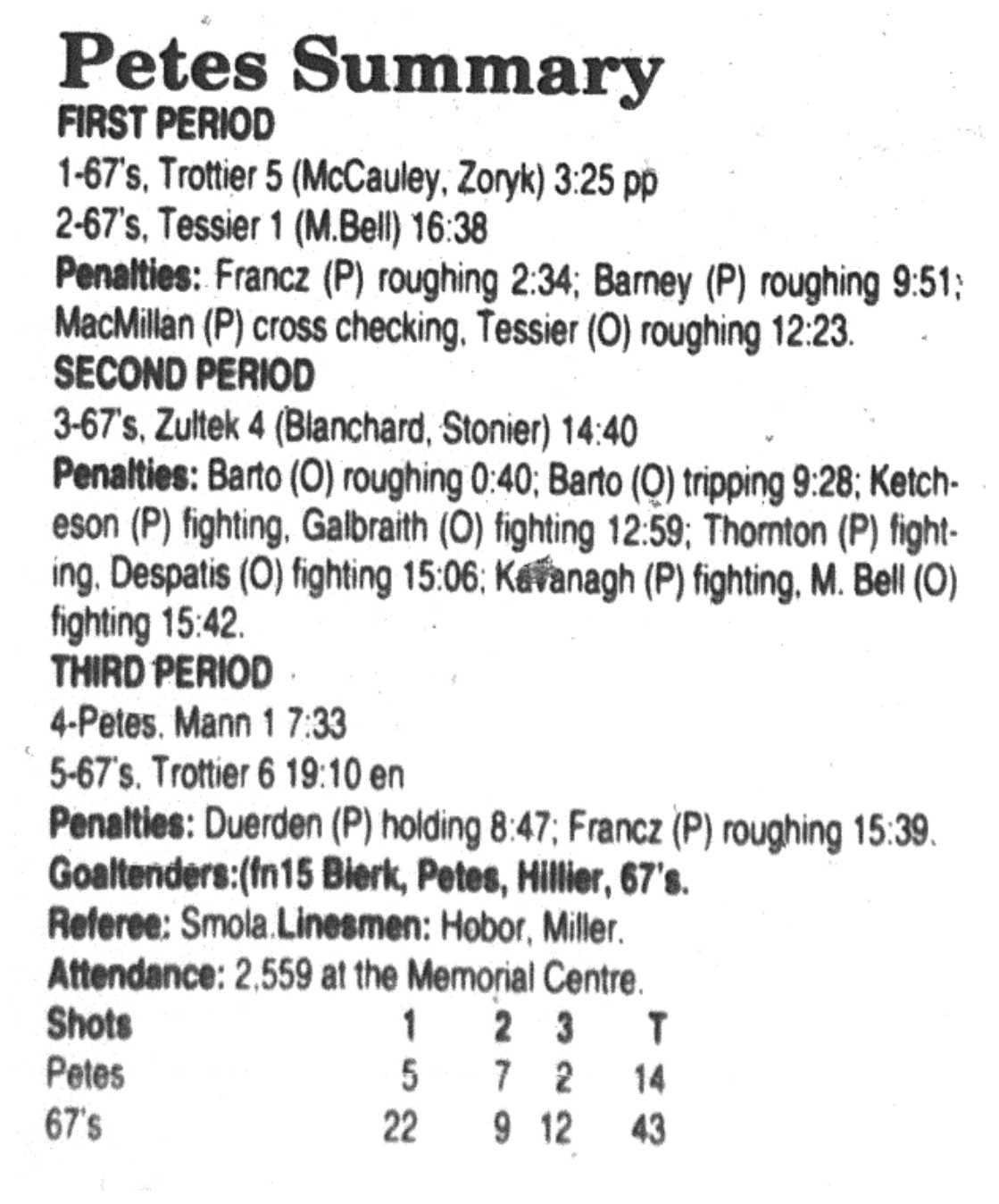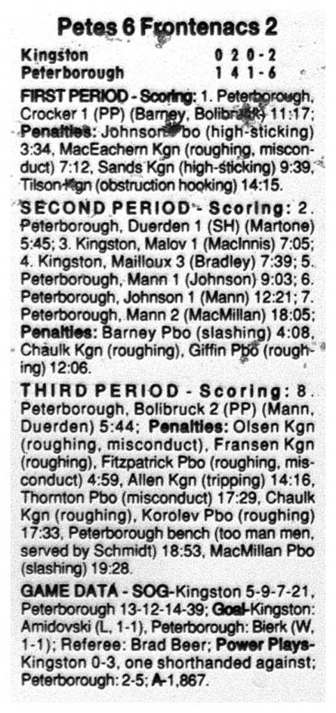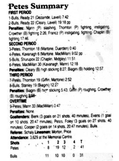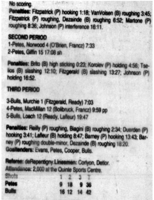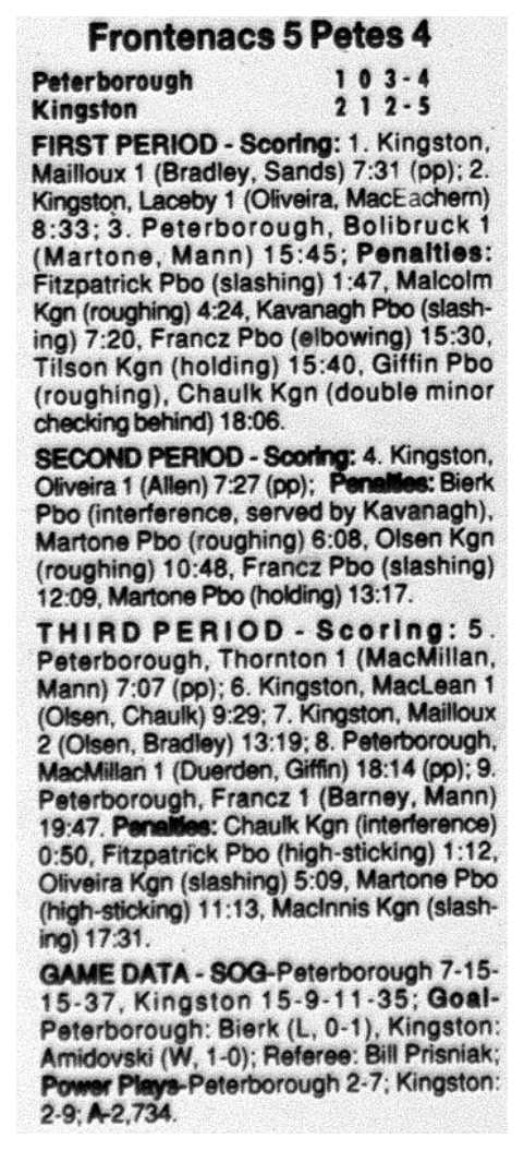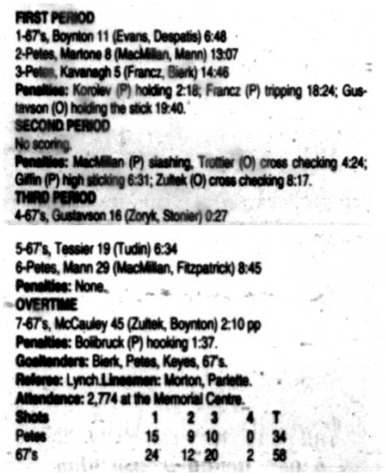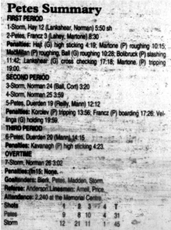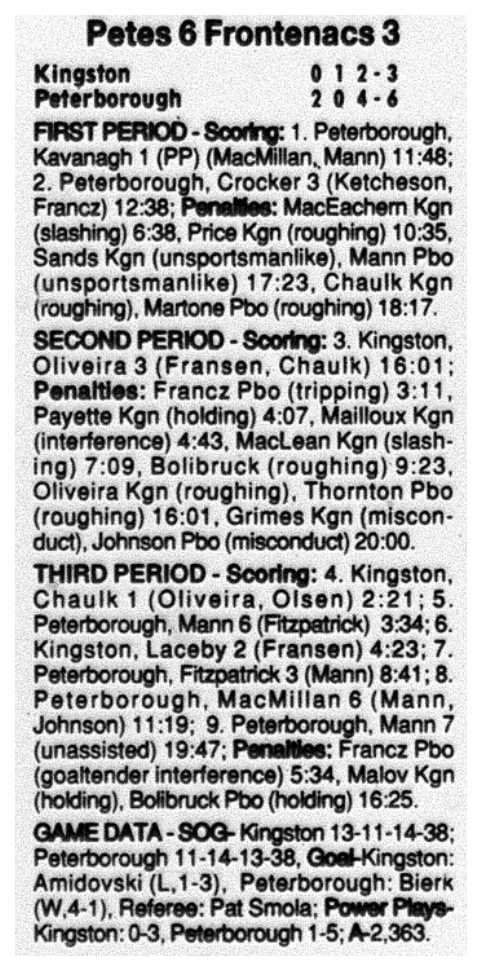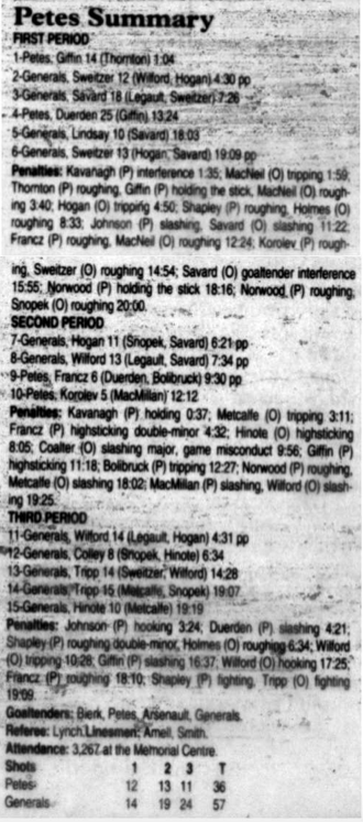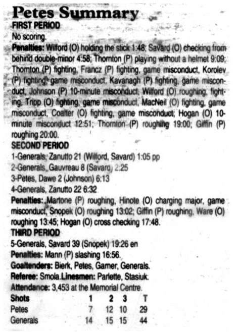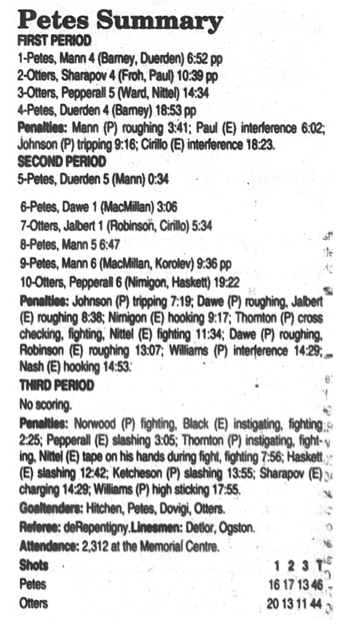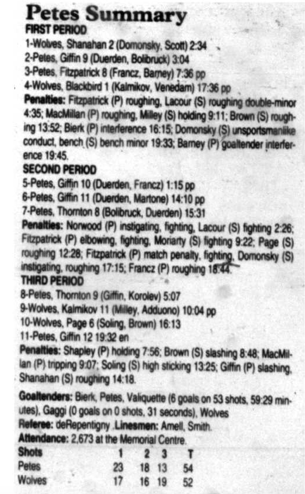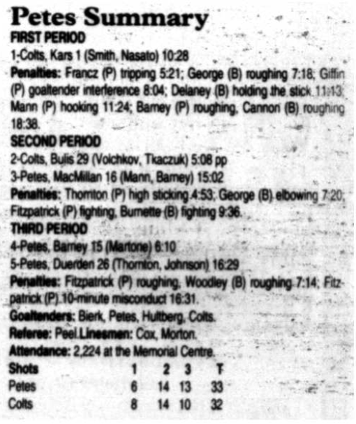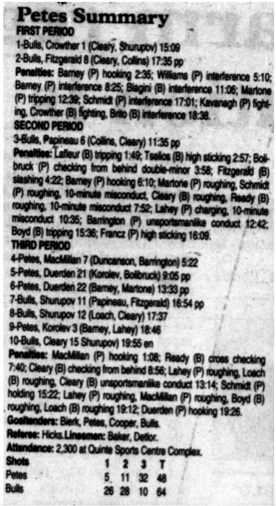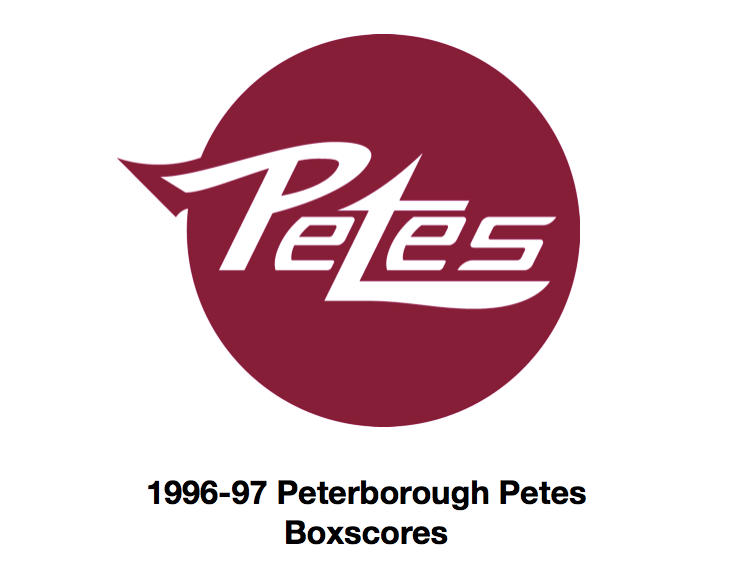 Here are the boxscores from the 1996-97 Peterborough Petes season. All boxscores from this season are here (77/77 boxscores). If you have any of the games that are missing, please send them my way.