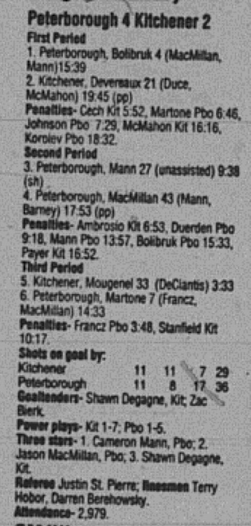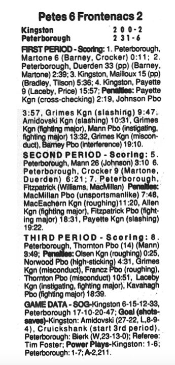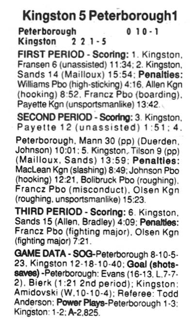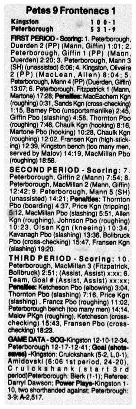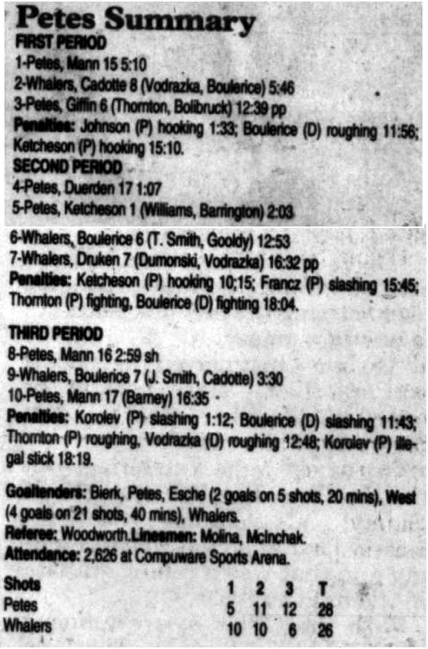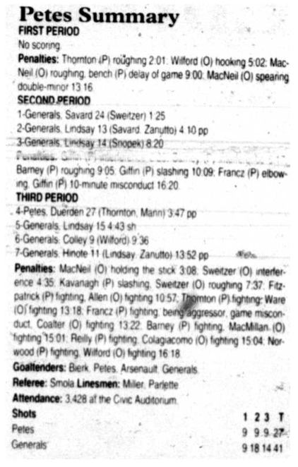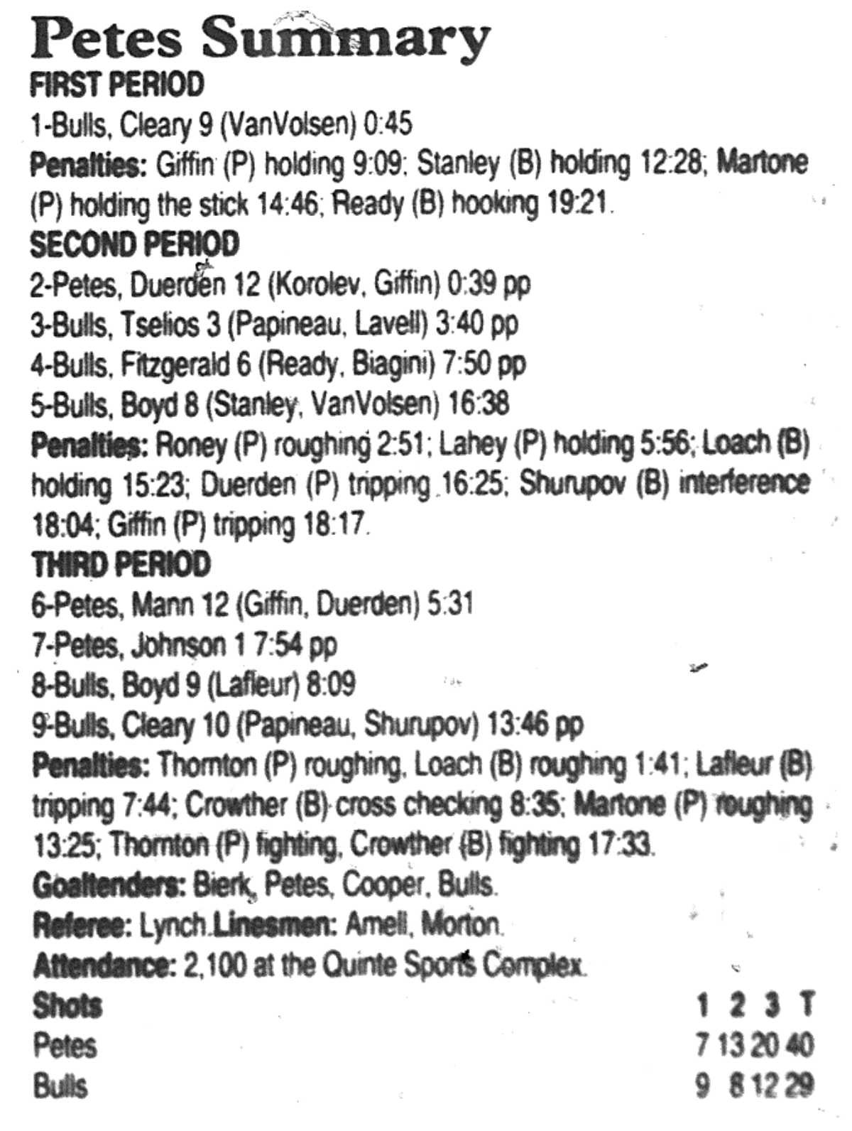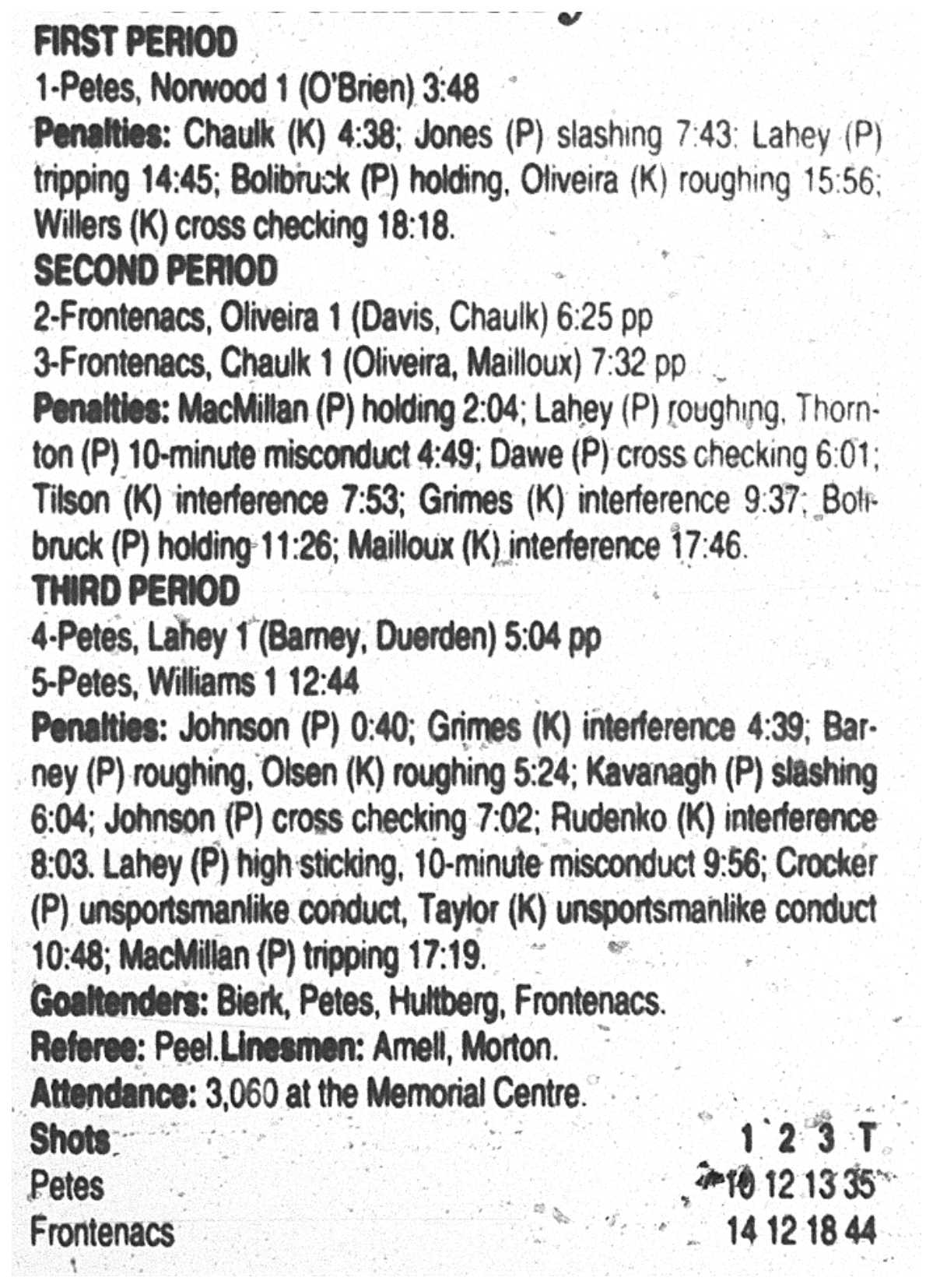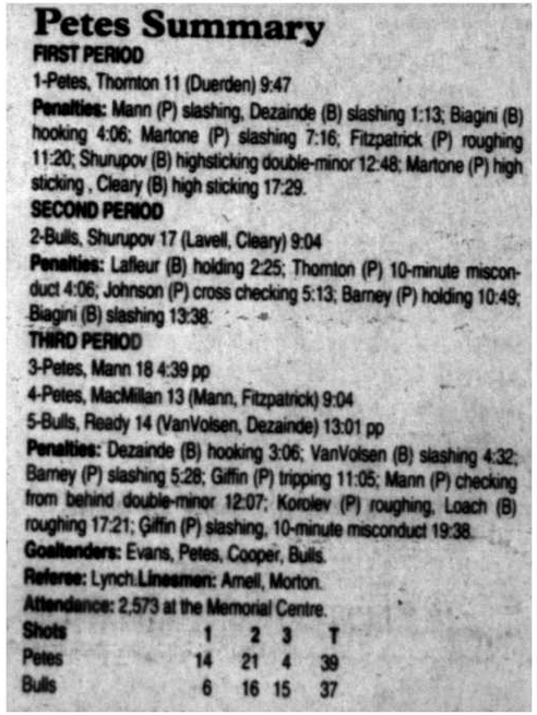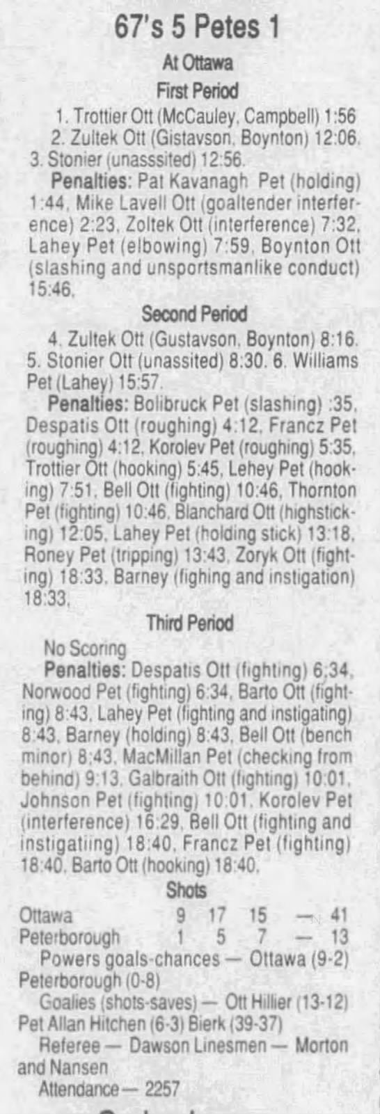 Here are the boxscores from the 1996-97 Peterborough Petes season. All boxscores from this season are here (77/77 boxscores). If you have any of the games that are missing, please send them my way.