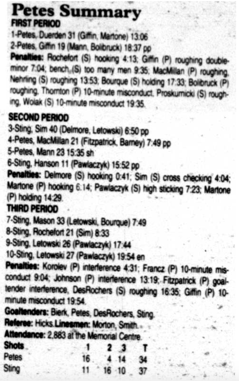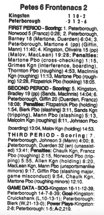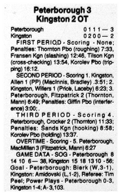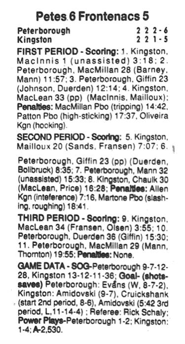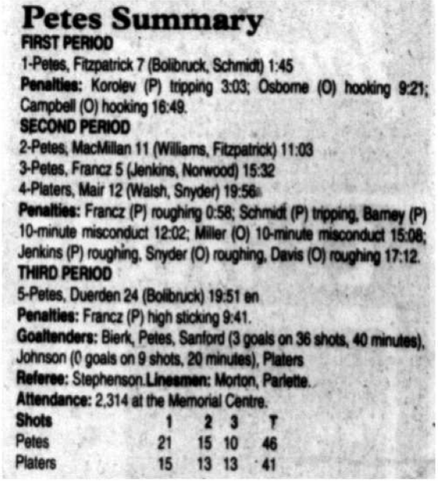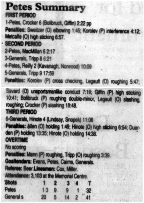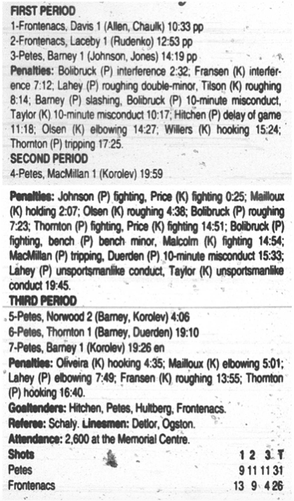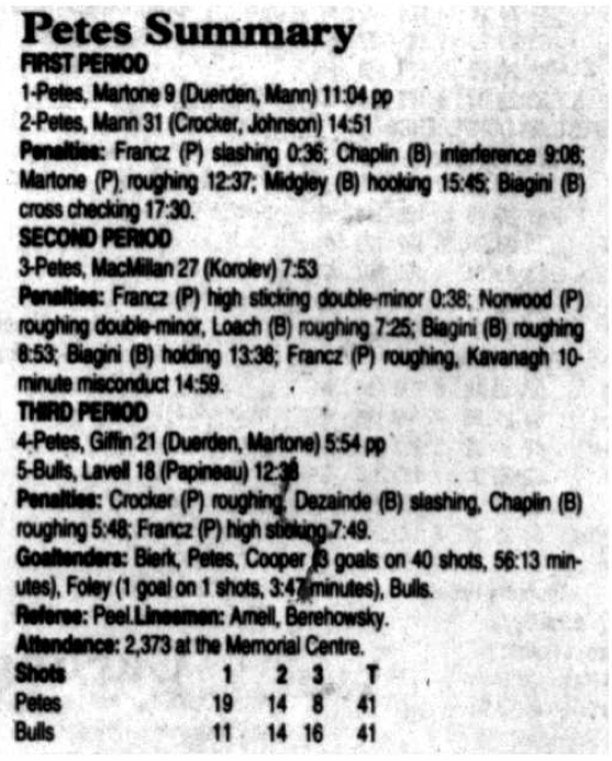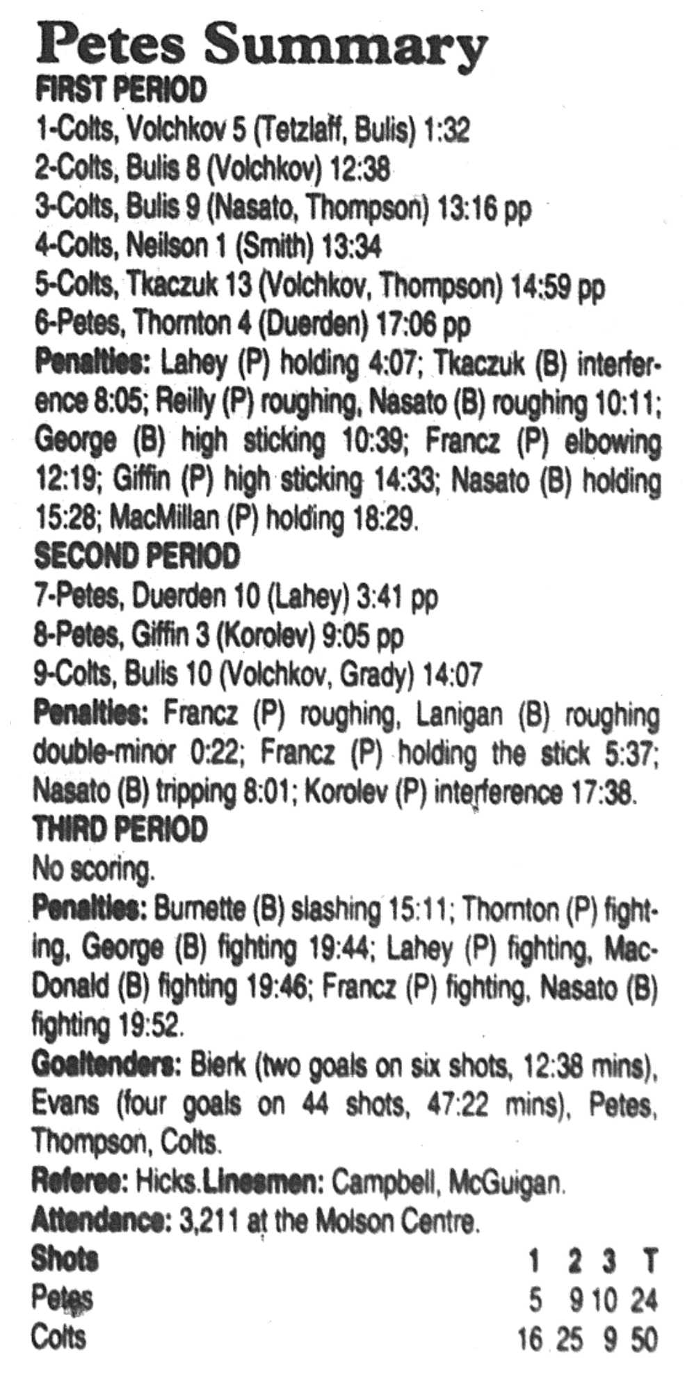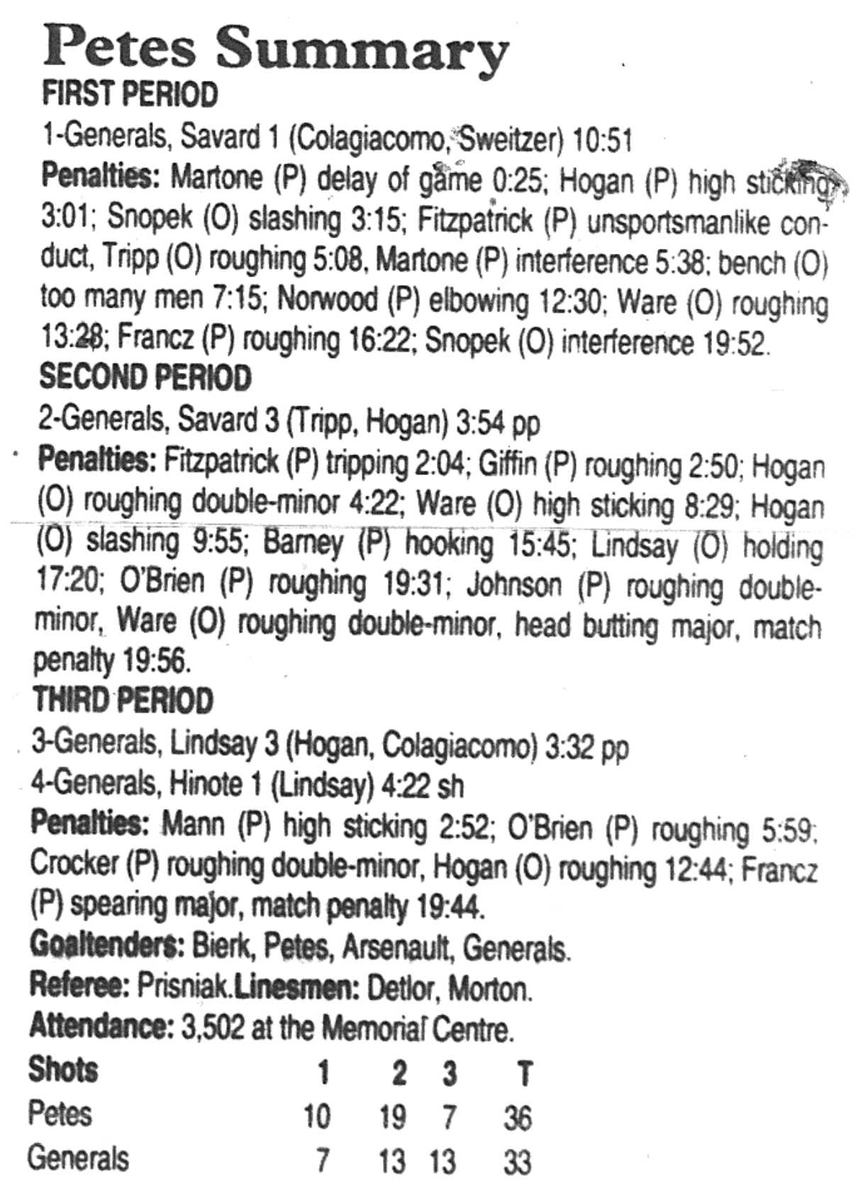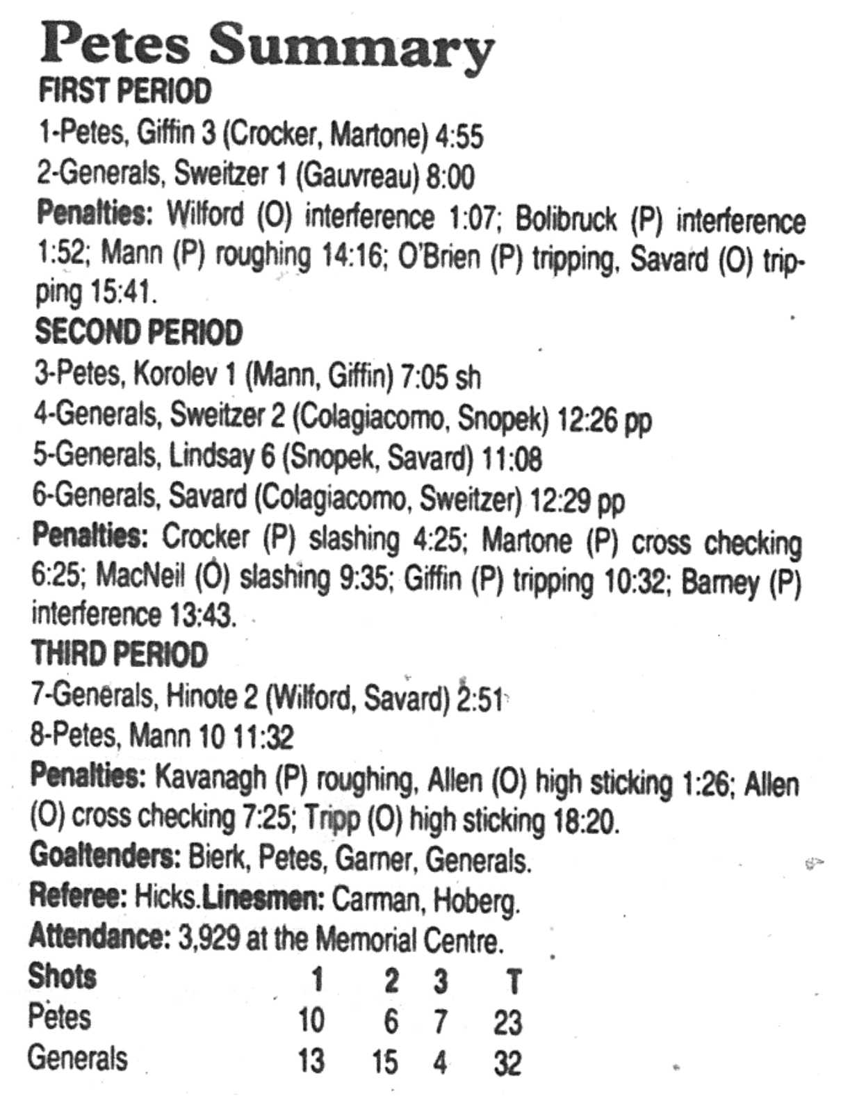Here are the boxscores from the 1996-97 Peterborough Petes season. All boxscores from this season are here (77/77 boxscores). If you have any of the games that are missing, please send them my way.