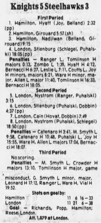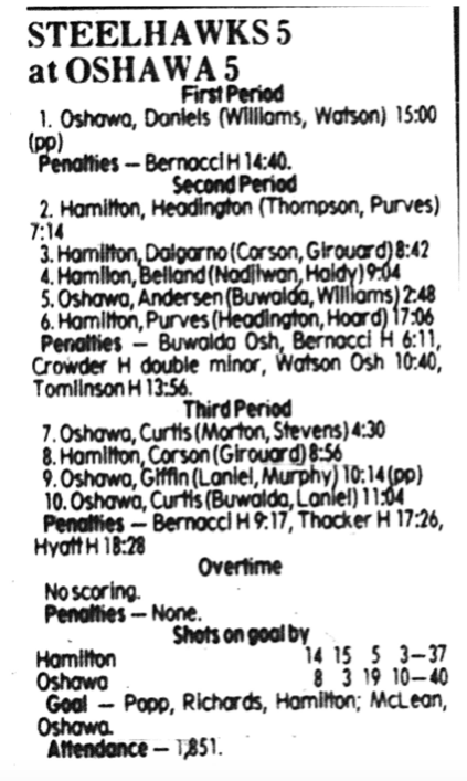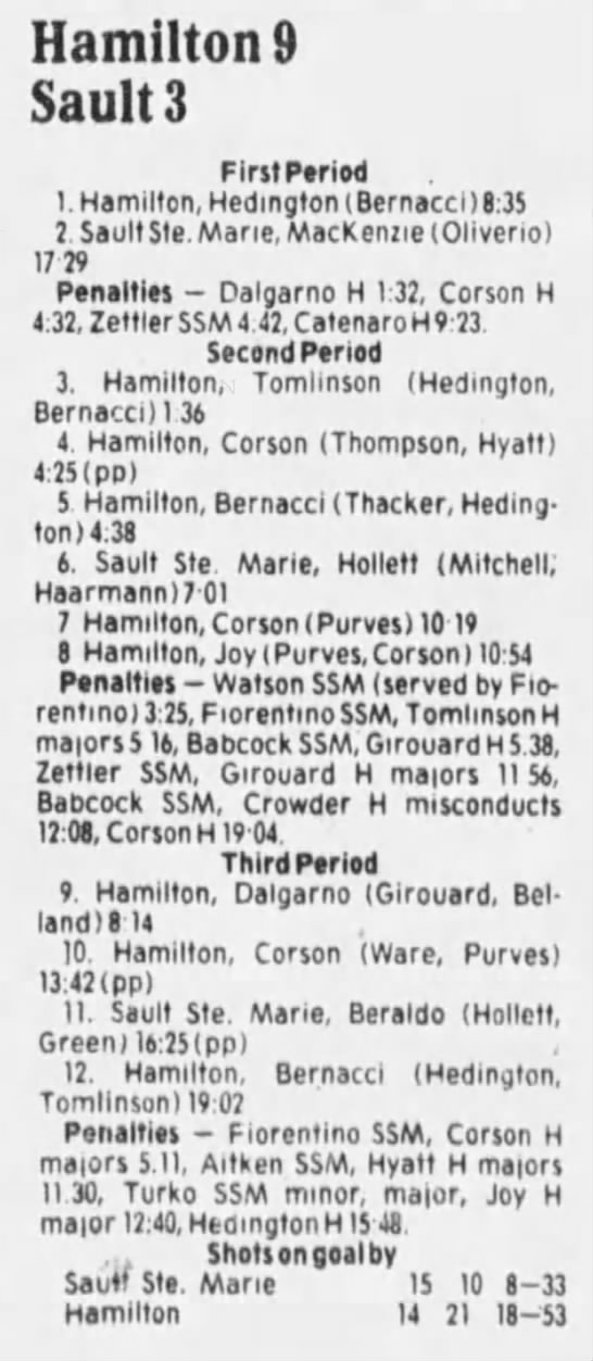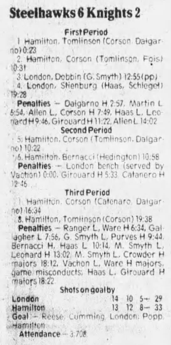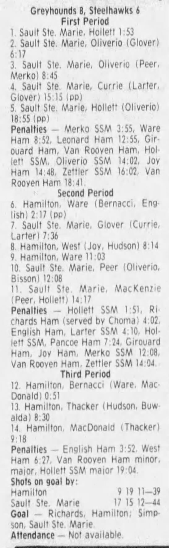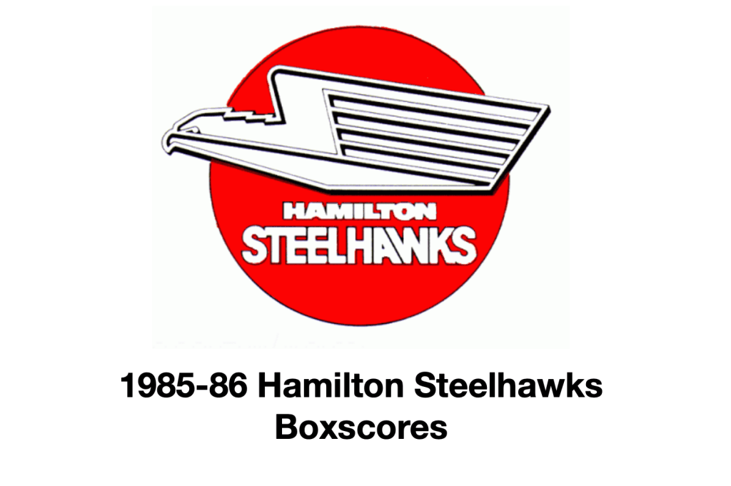 Here are the boxscores from the 1985-86 Hamilton Steelhawks season. There are some that are missing, but most of the scores are here (54/66 boxscores). If you have any of the games that are missing, please send them my way.