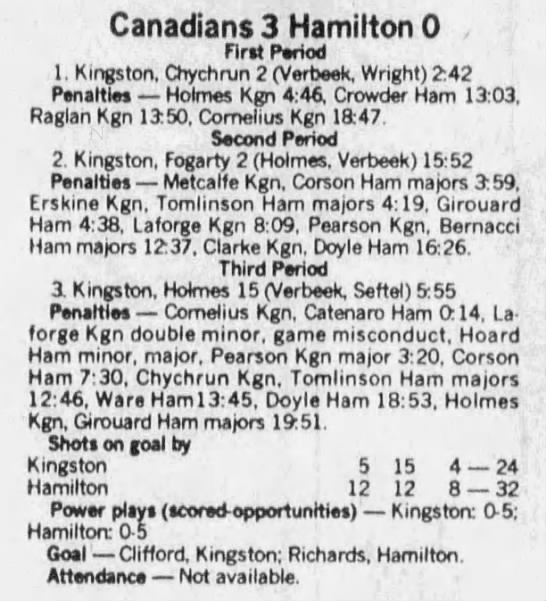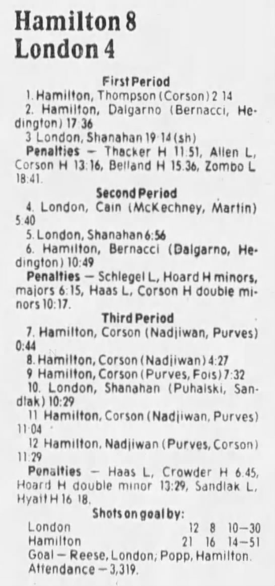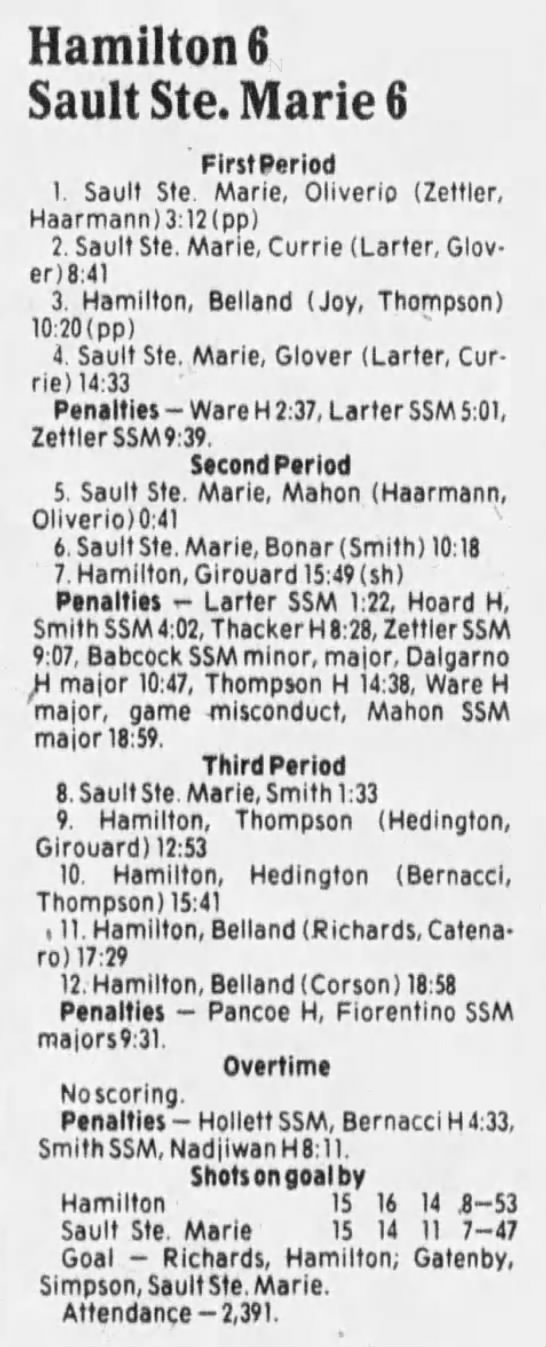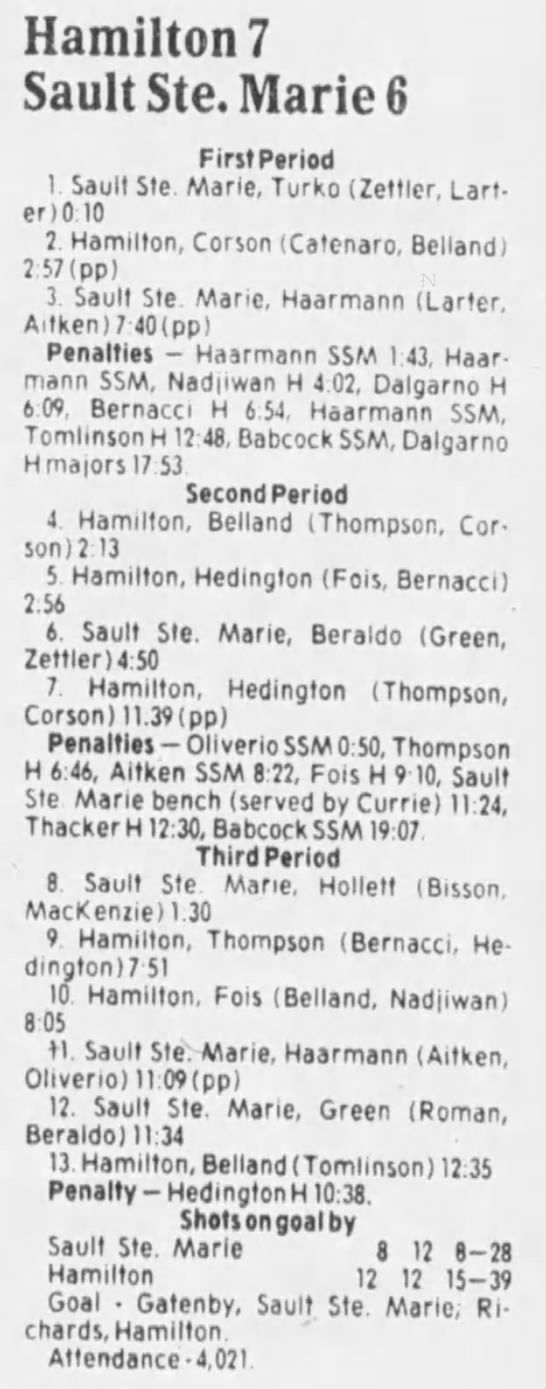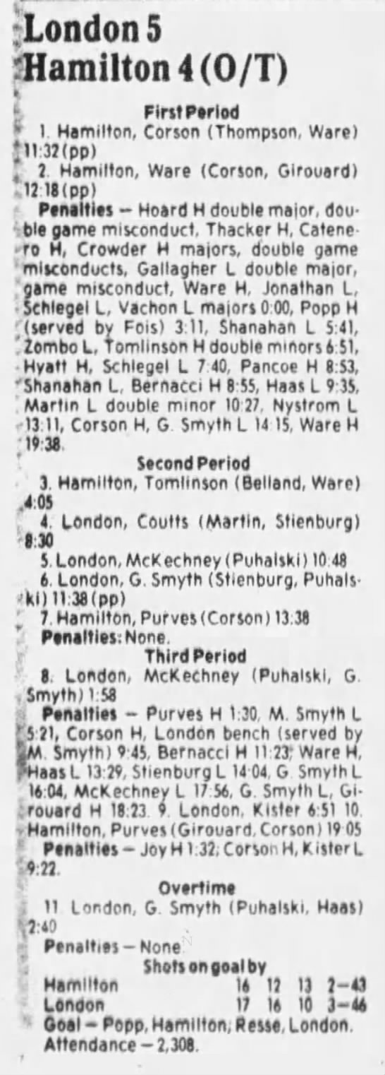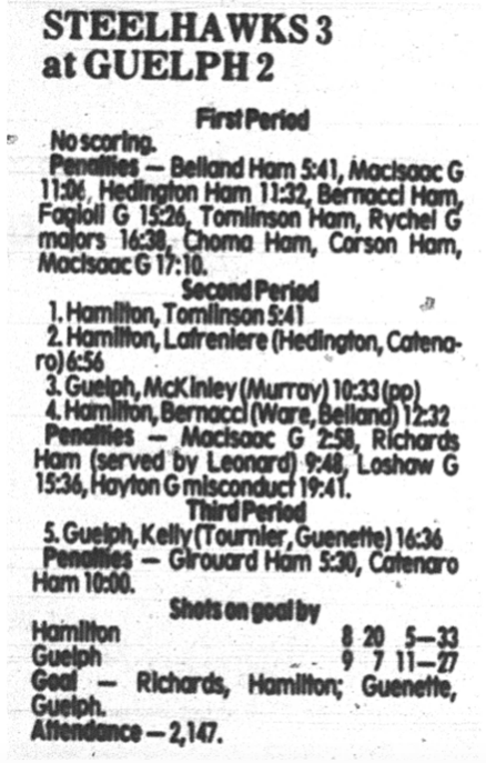 Here are the boxscores from the 1985-86 Hamilton Steelhawks season. There are some that are missing, but most of the scores are here (54/66 boxscores). If you have any of the games that are missing, please send them my way.