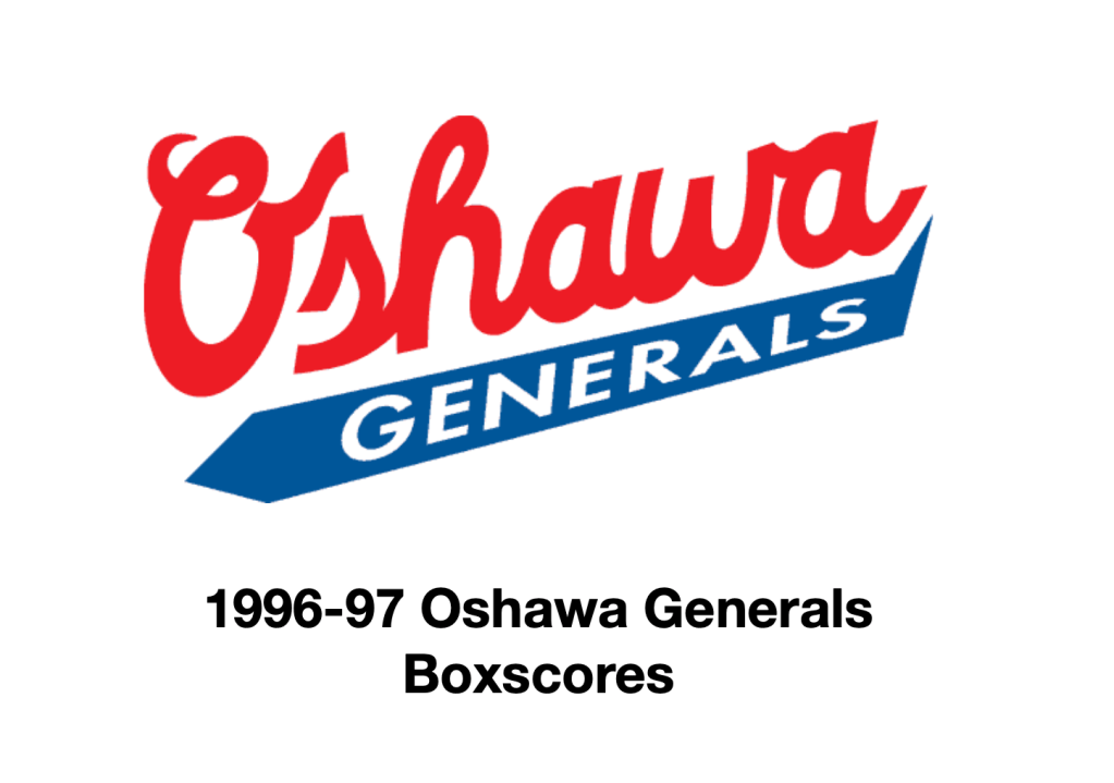 Here are the boxscores from the 1996-97 Oshawa Generals season. Most boxscores from this season are here (62/88 boxscores). If you have any of the games that are missing, please send them my way.