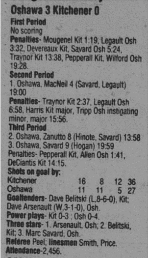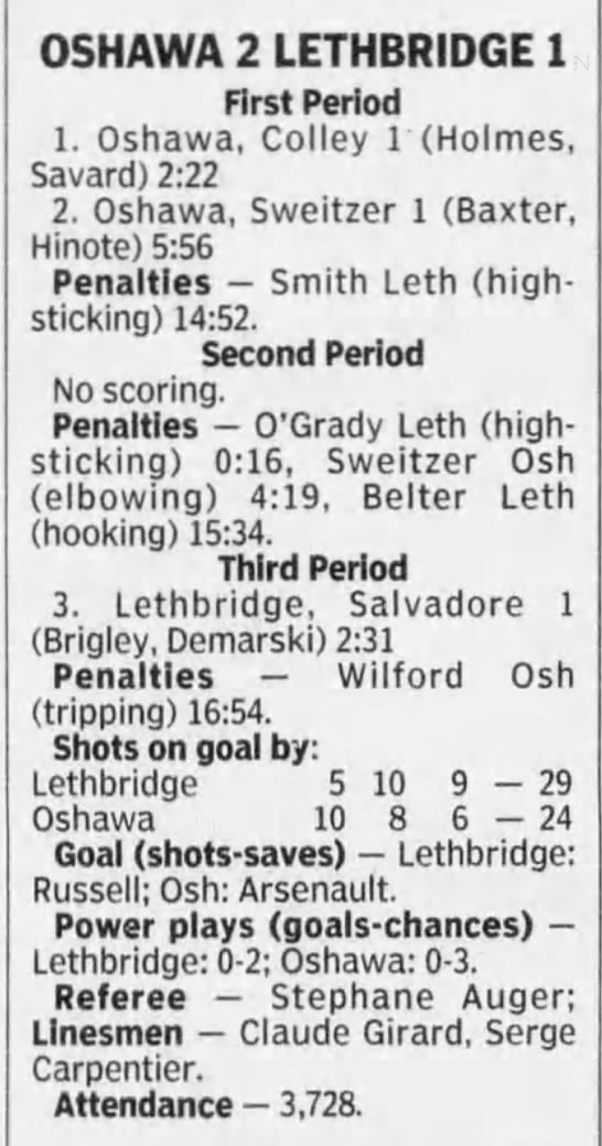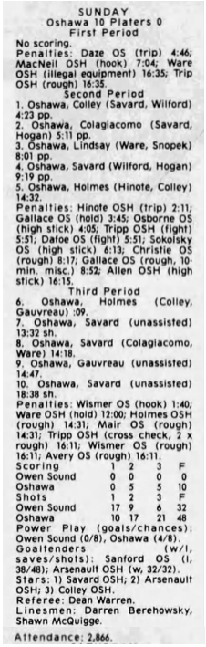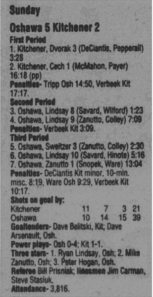 Here are the boxscores from the 1996-97 Oshawa Generals season. Most boxscores from this season are here (62/88 boxscores). If you have any of the games that are missing, please send them my way.