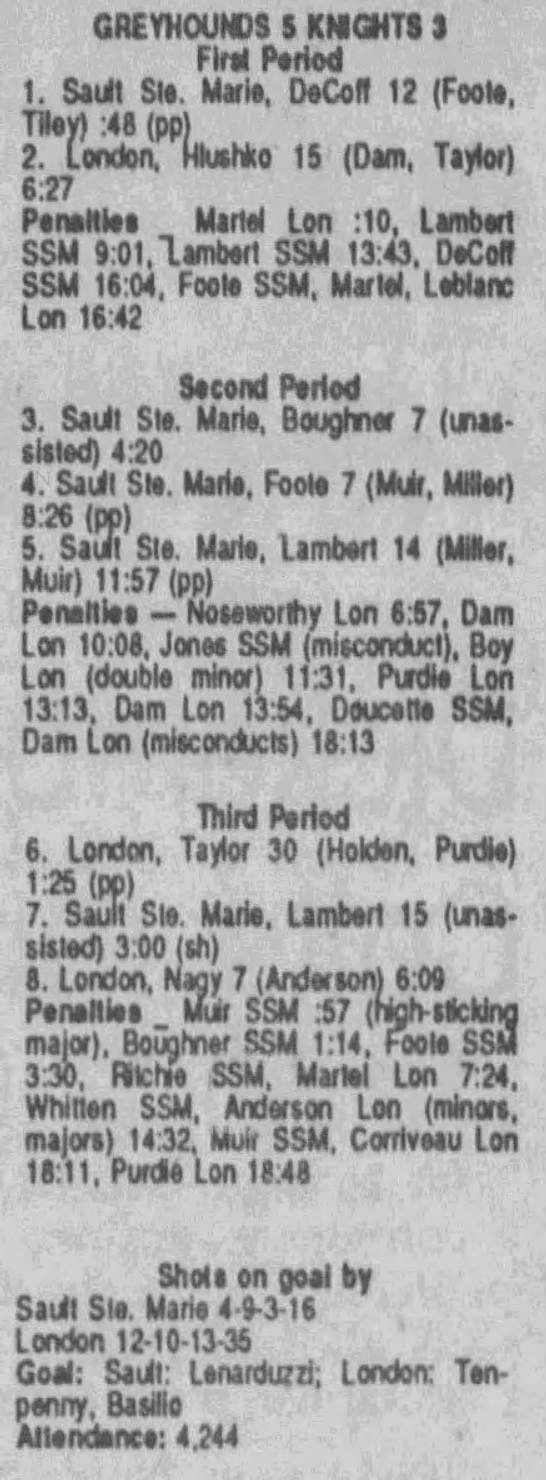 Here are the boxscores from the 1989-90 Soo Greyhounds season. Most boxscores from this season are here (42/66 boxscores). If you have any of the games that are missing, please send them my way.