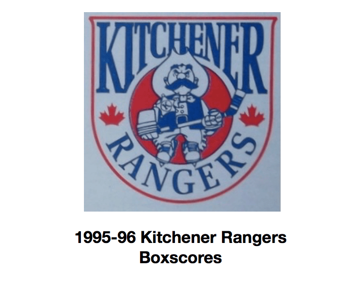 Here are the boxscores from the 1995-96 Kitchener Rangers season. There are some that are missing, but most are here (74/78 boxscores). If you have any of the games that are missing, please send them my way.