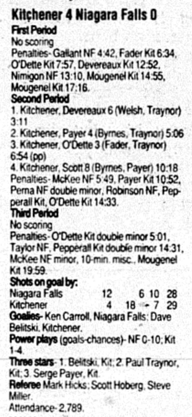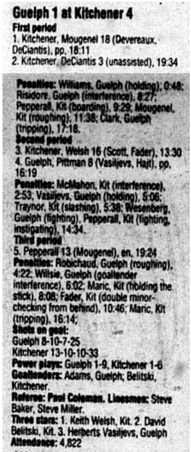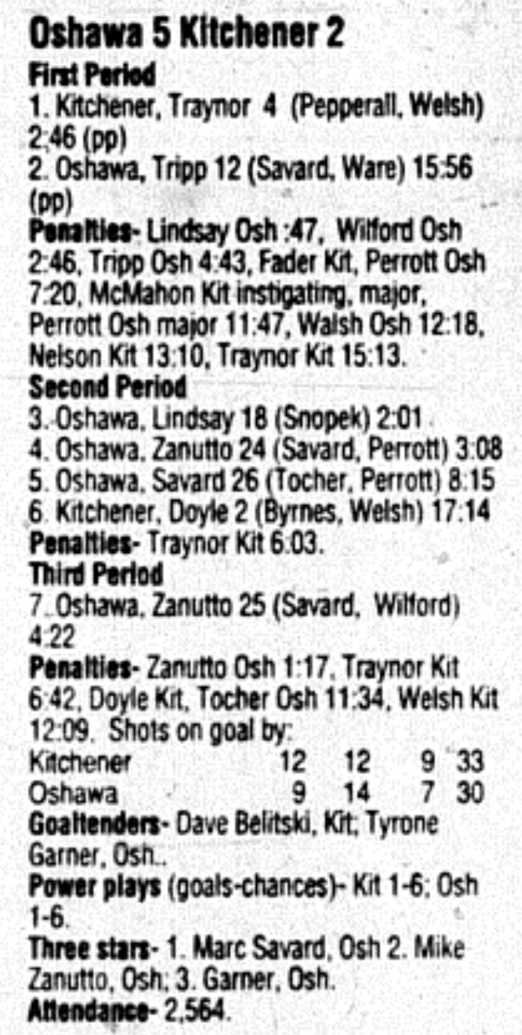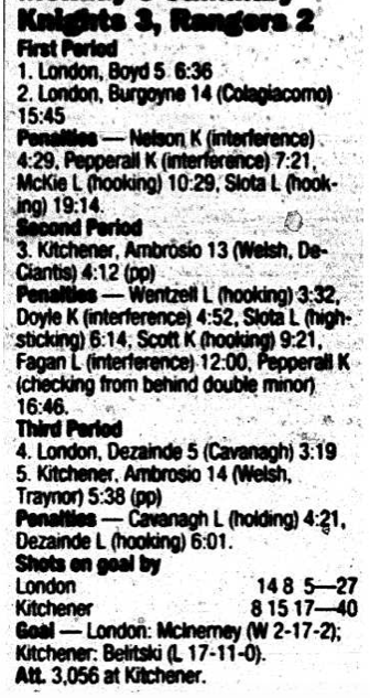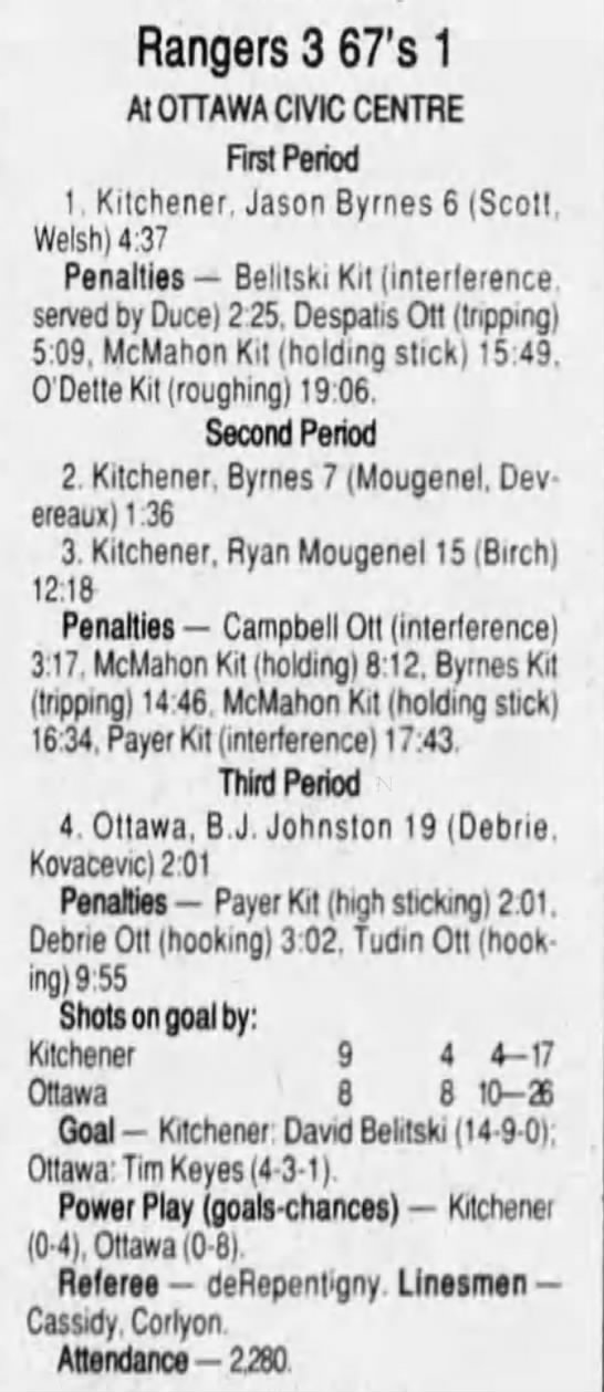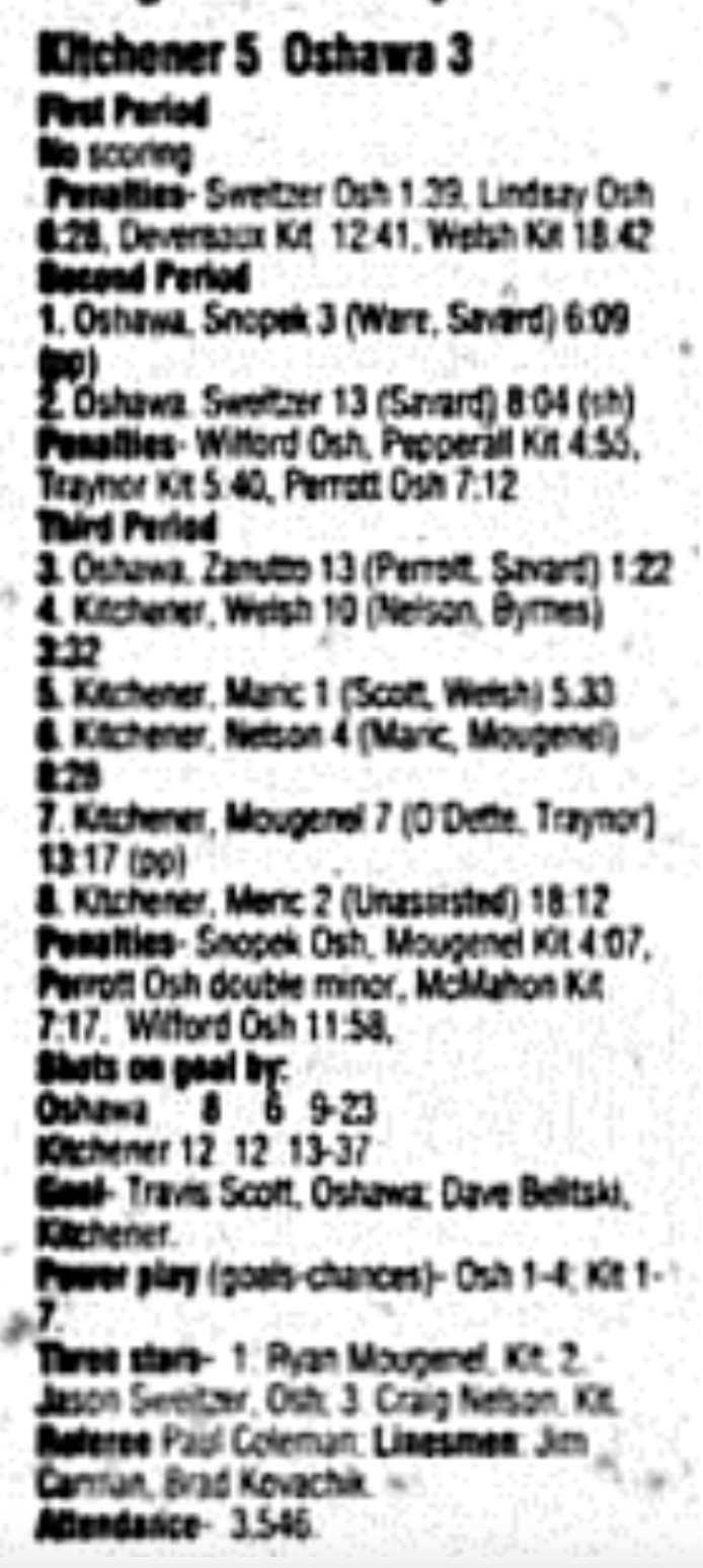 Here are the boxscores from the 1995-96 Kitchener Rangers season. There are some that are missing, but most are here (74/78 boxscores). If you have any of the games that are missing, please send them my way.