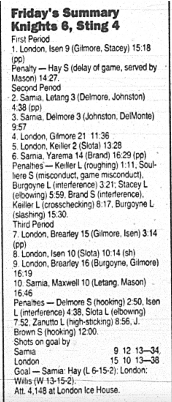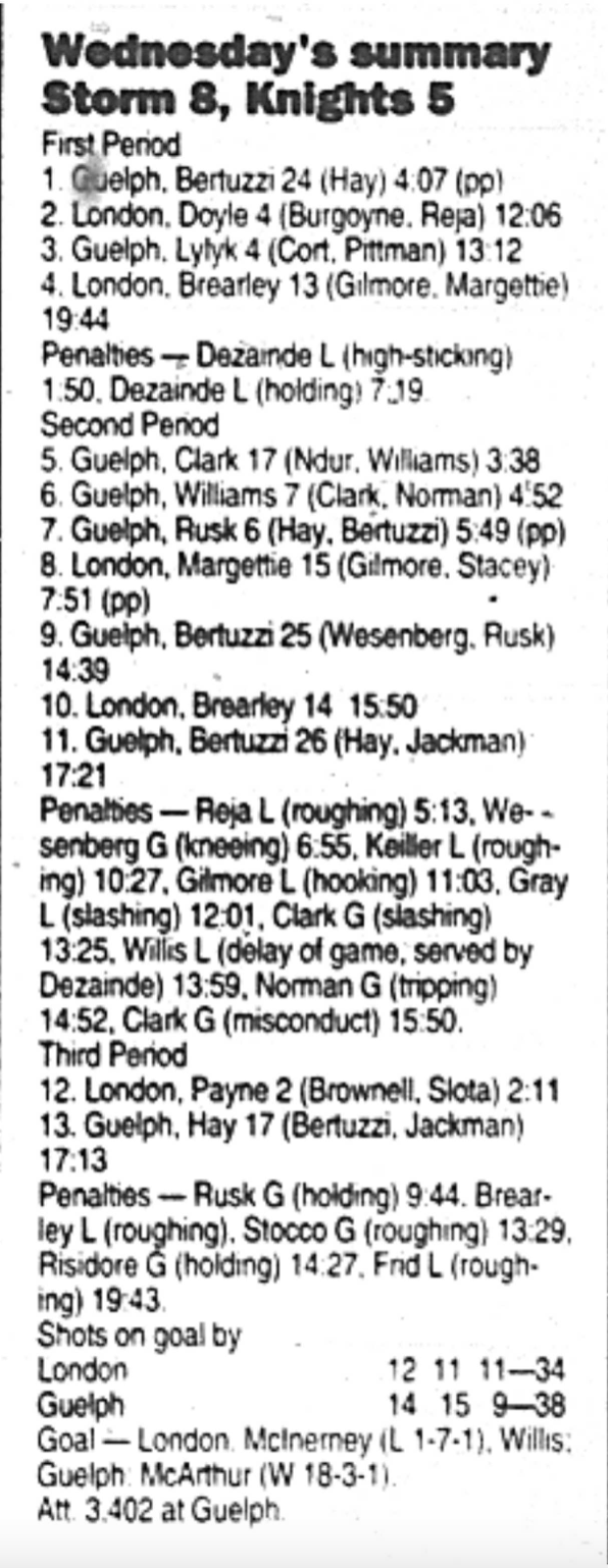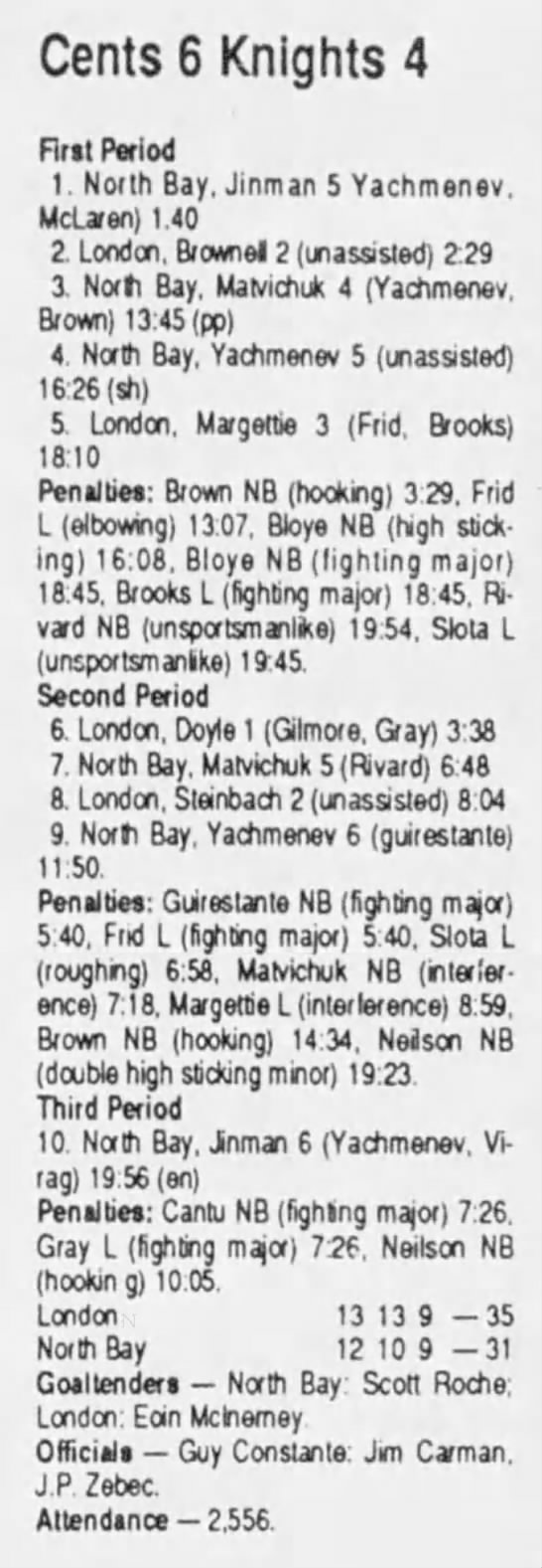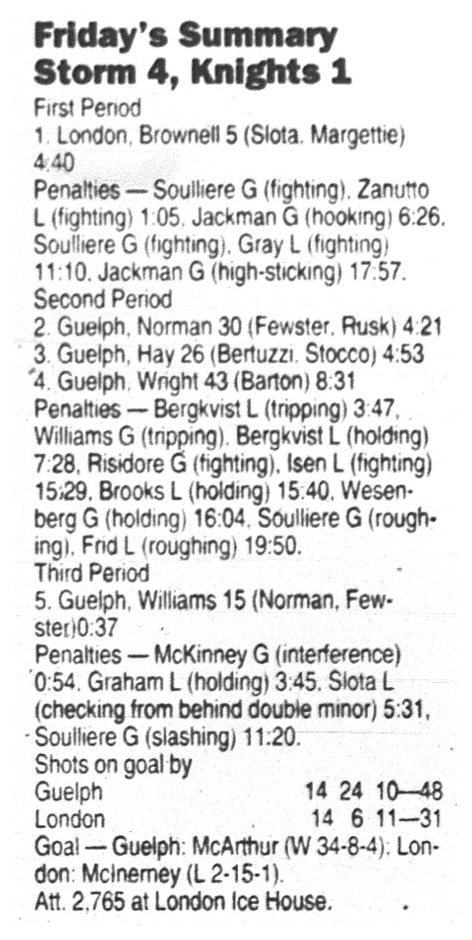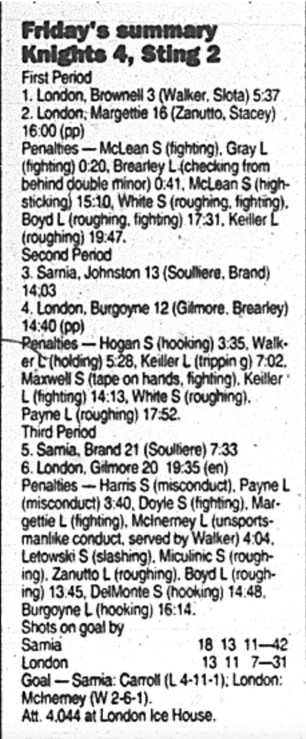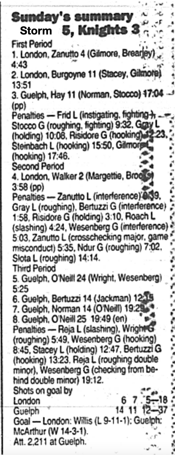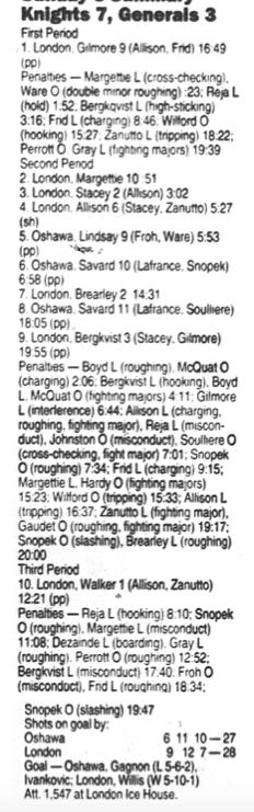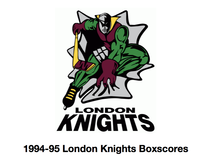 Here are the boxscores from the 1994-95 London Knights season. All boxscores from that season are here (70/70 boxscores). If you have any of the games that are missing, please send them my way.