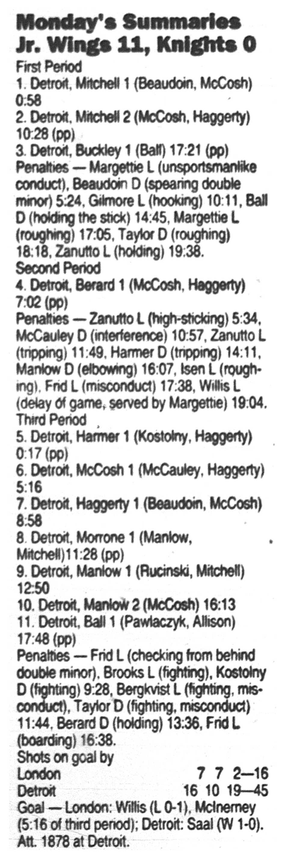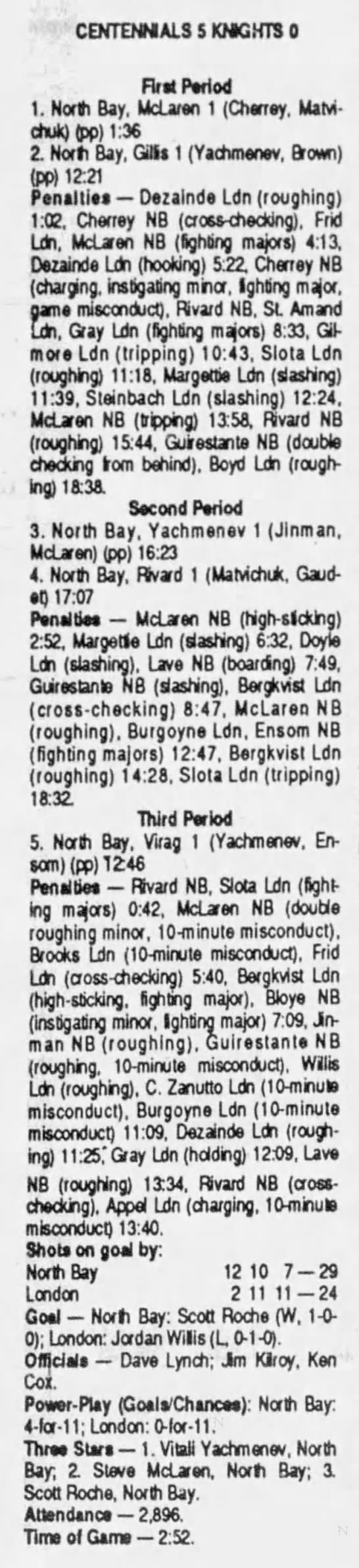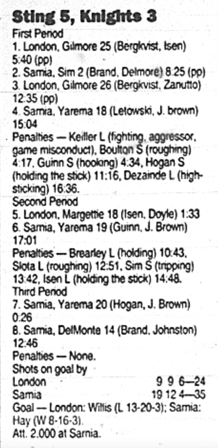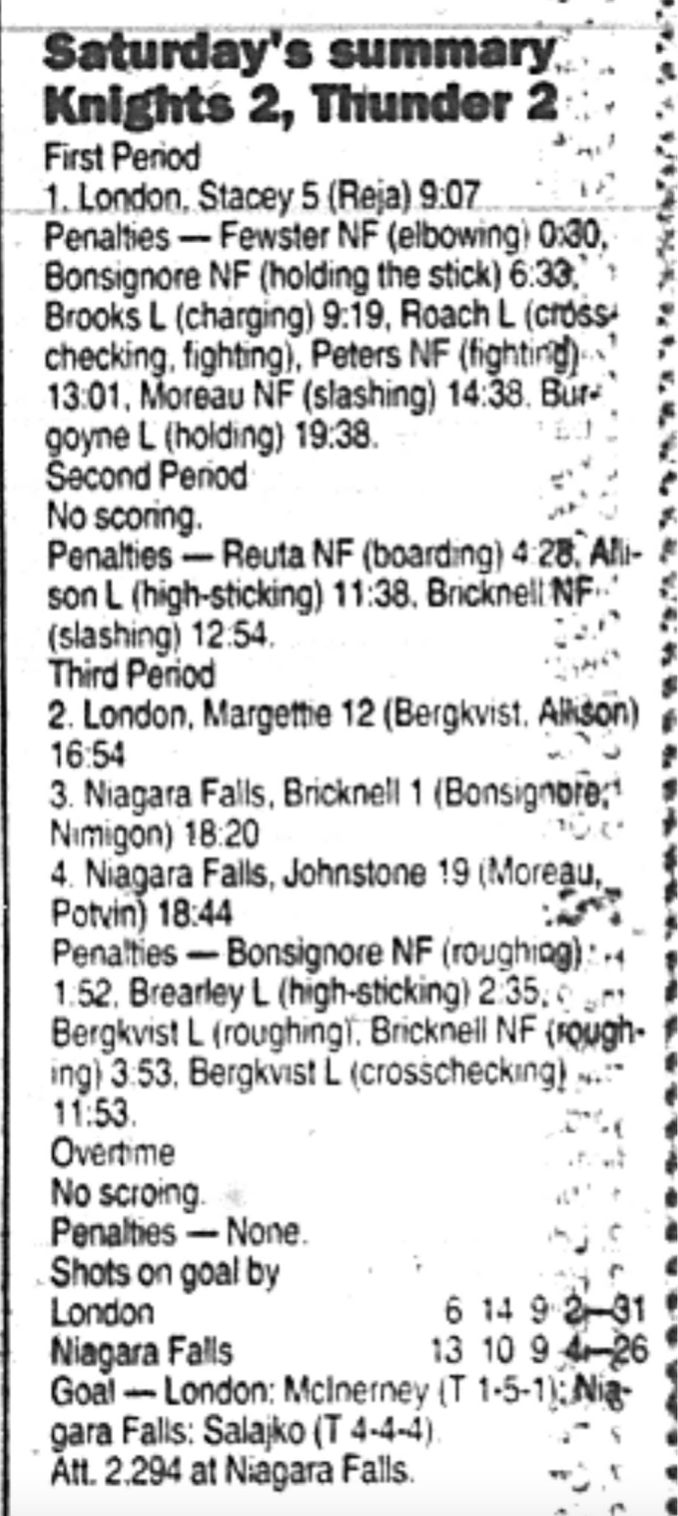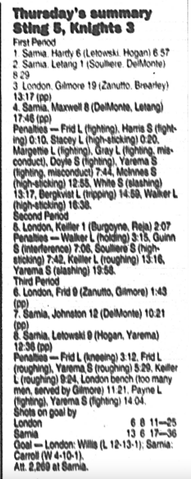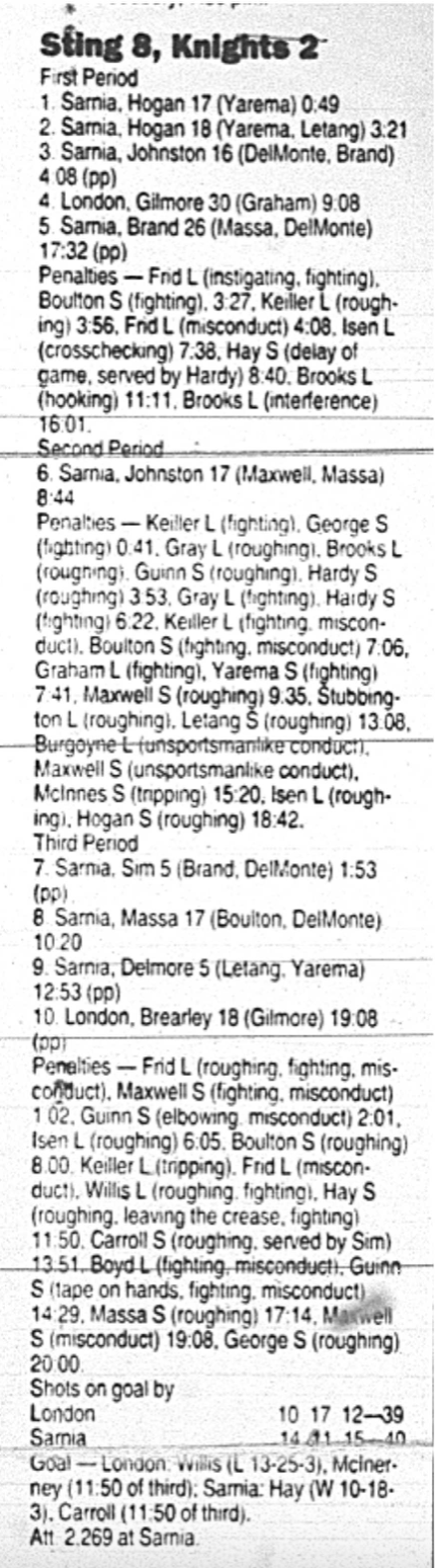 Here are the boxscores from the 1994-95 London Knights season. All boxscores from that season are here (70/70 boxscores). If you have any of the games that are missing, please send them my way.