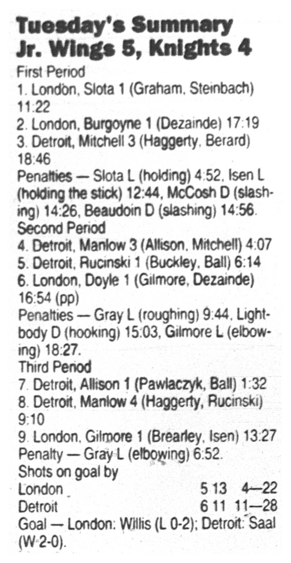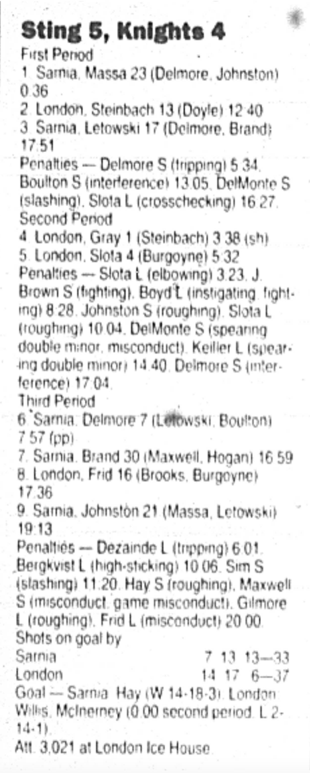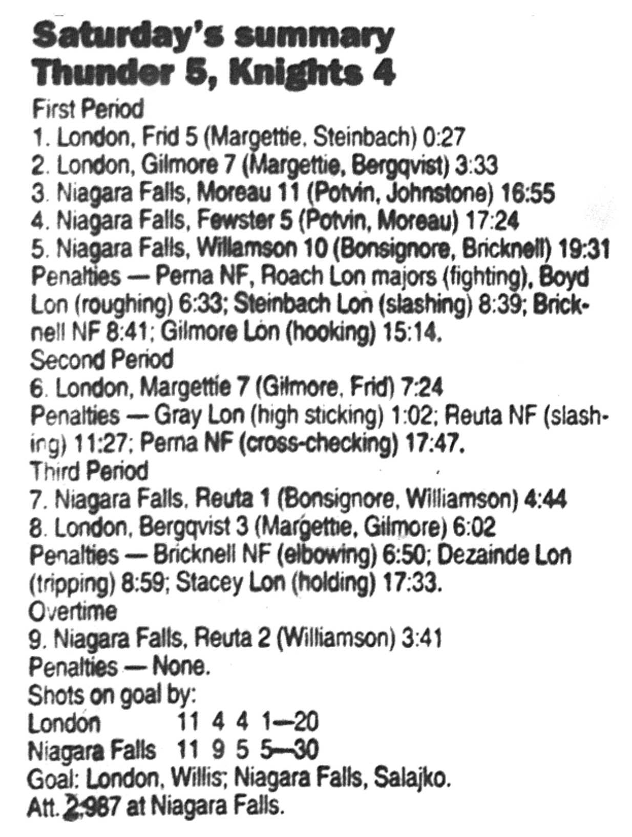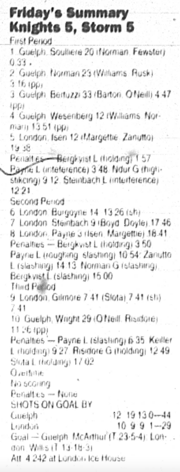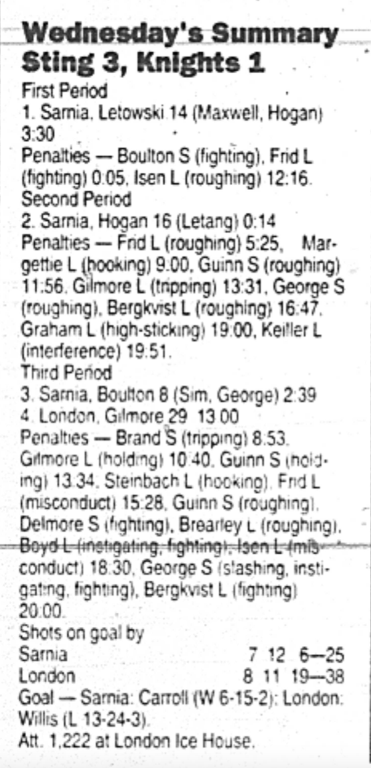 Here are the boxscores from the 1994-95 London Knights season. All boxscores from that season are here (70/70 boxscores). If you have any of the games that are missing, please send them my way.