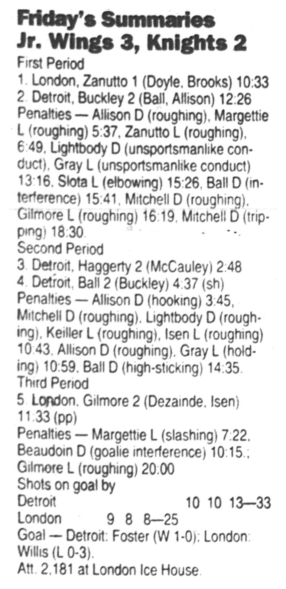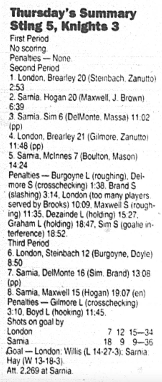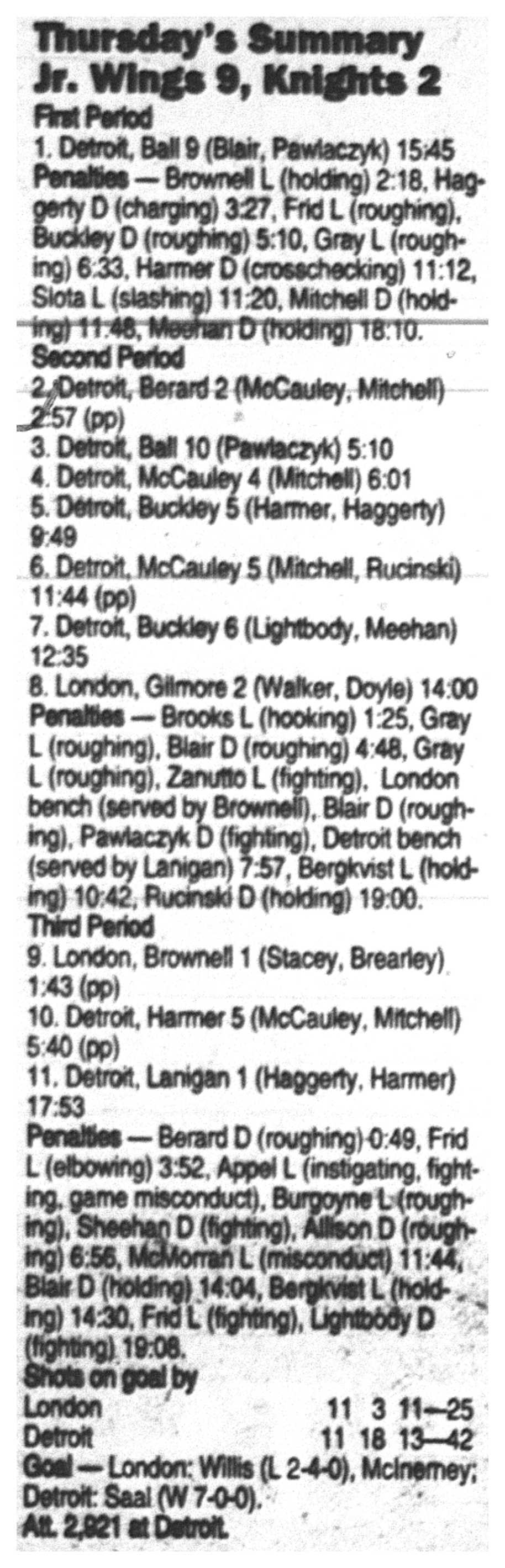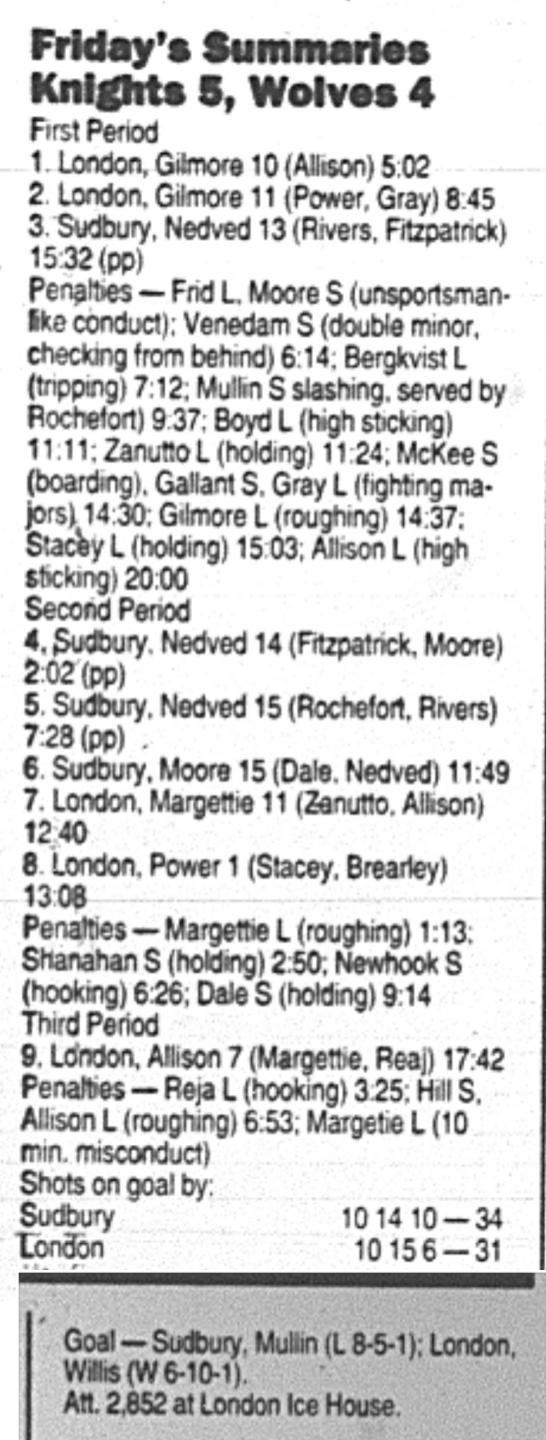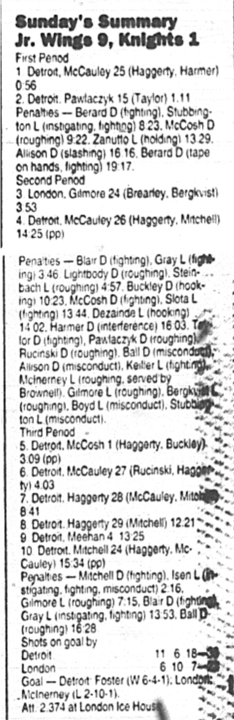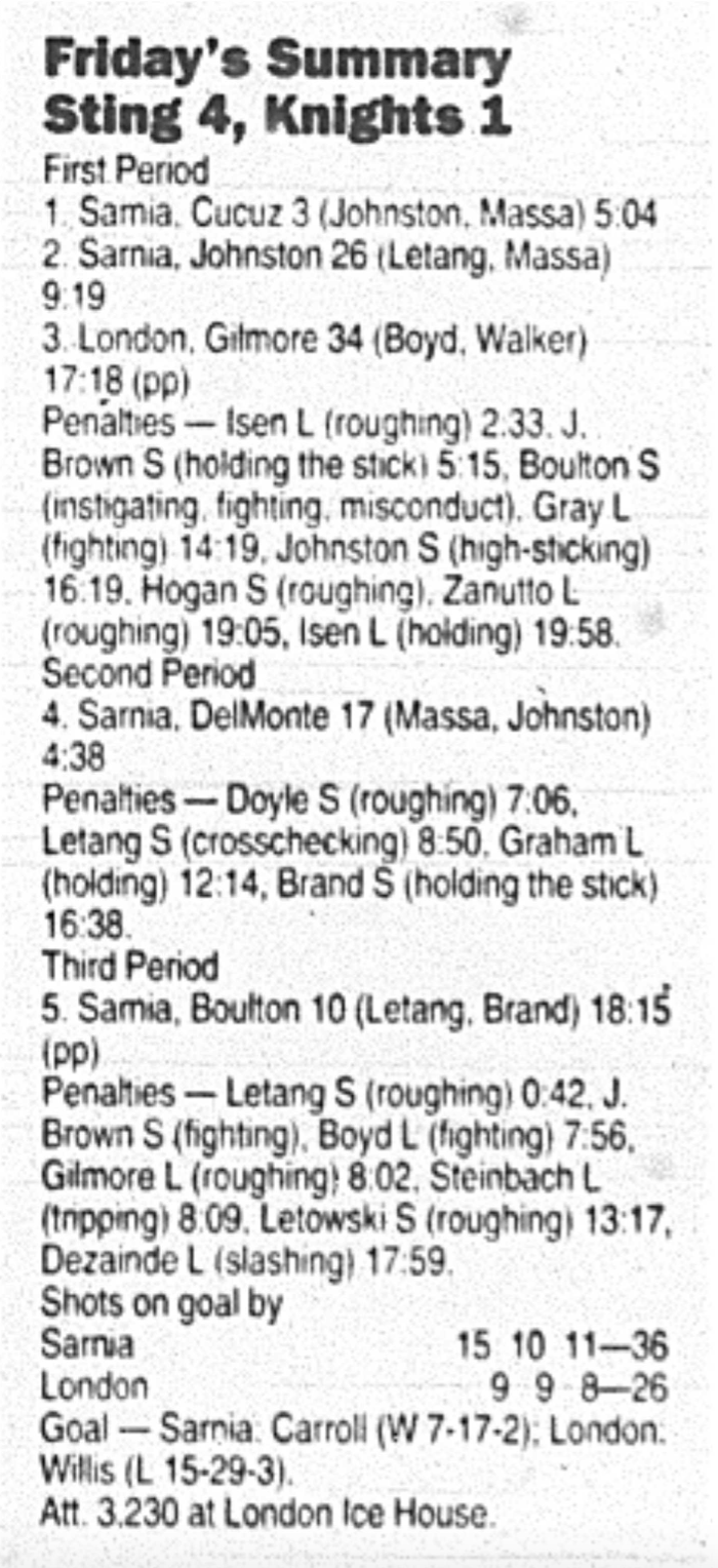 Here are the boxscores from the 1994-95 London Knights season. All boxscores from that season are here (70/70 boxscores). If you have any of the games that are missing, please send them my way.