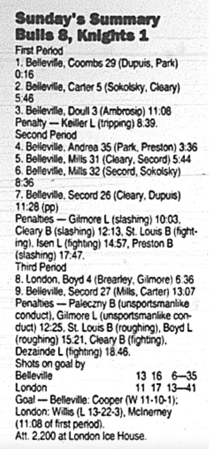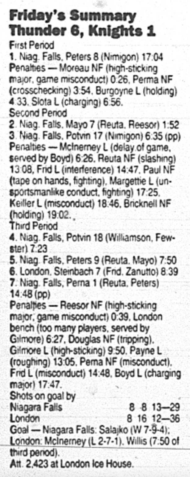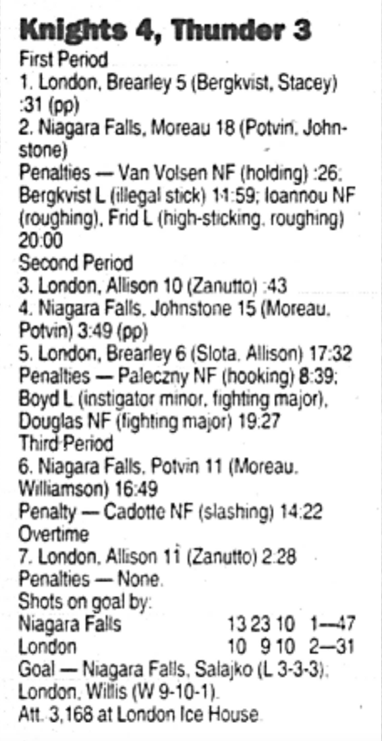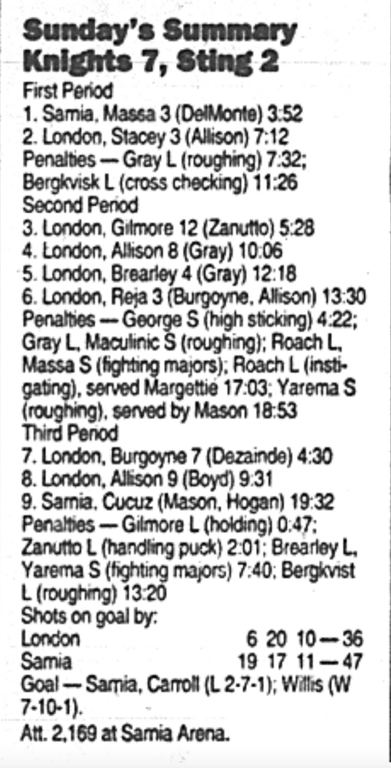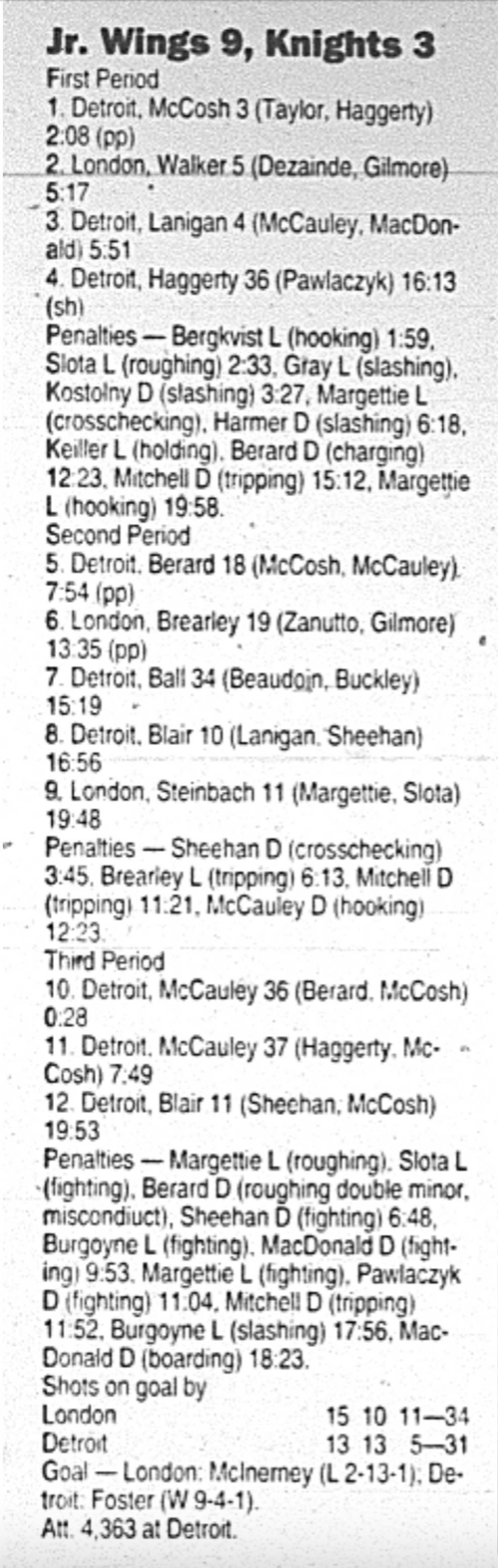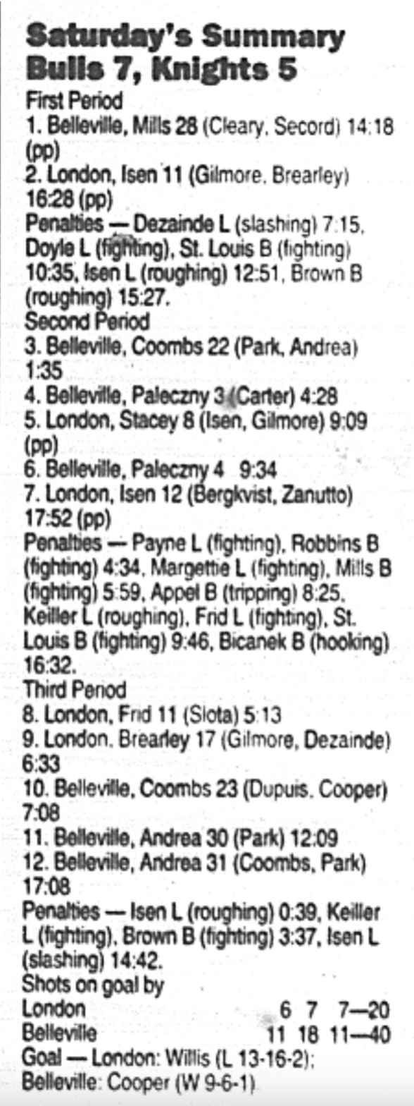 Here are the boxscores from the 1994-95 London Knights season. All boxscores from that season are here (70/70 boxscores). If you have any of the games that are missing, please send them my way.