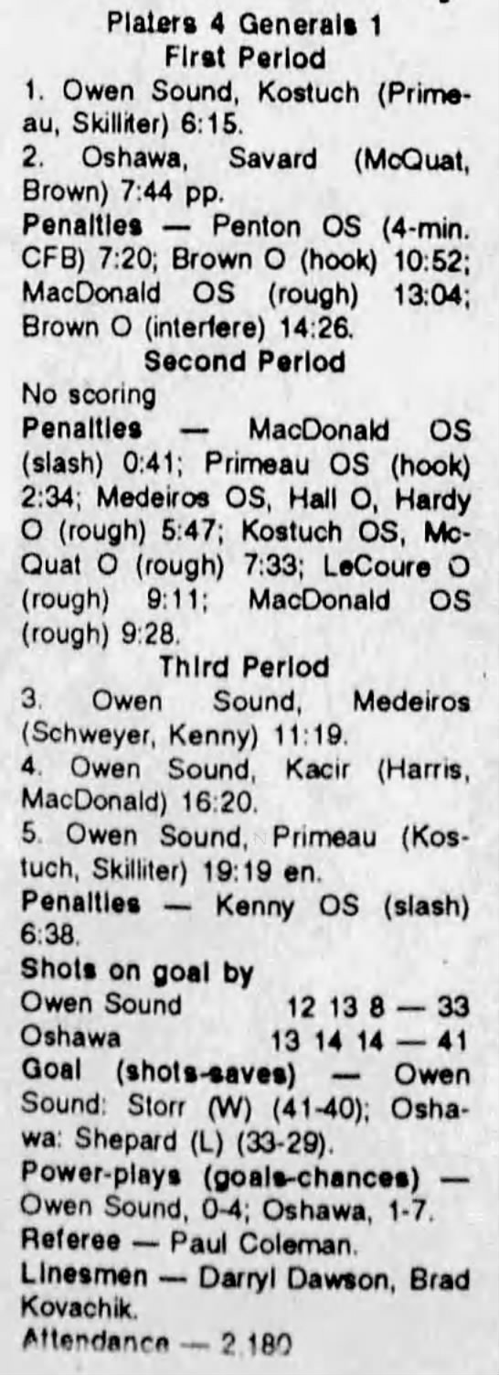 Here are the boxscores from the 1993-94 Owen Sound Platers season. Most boxscores from this season are here (74/75 boxscores). If you have any of the games that are missing, please send them my way.